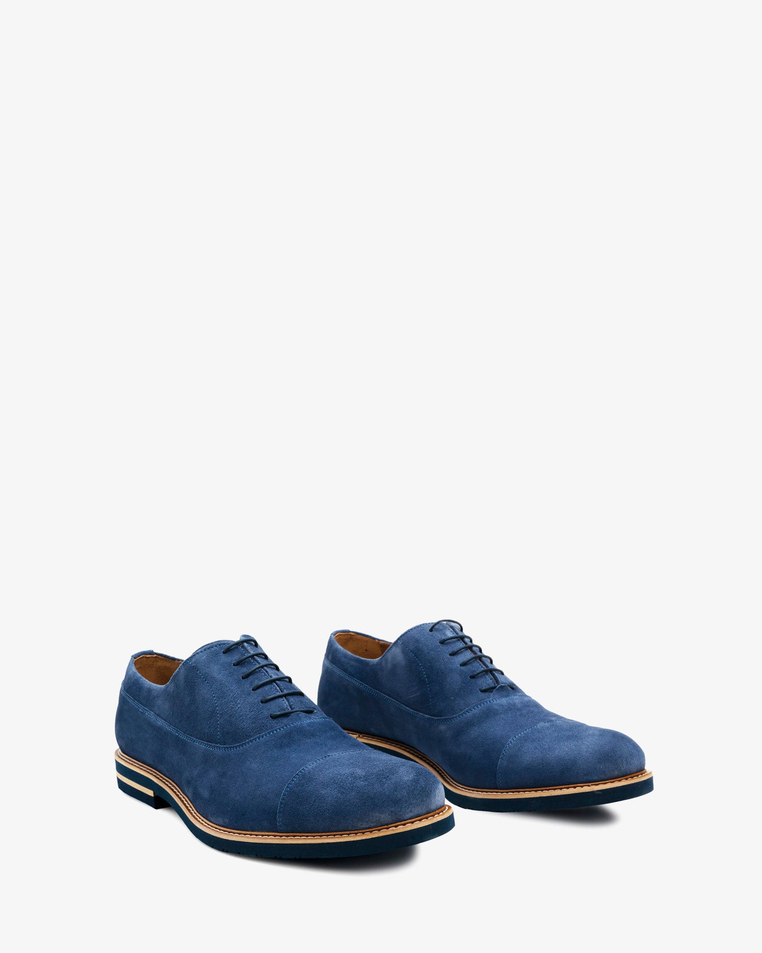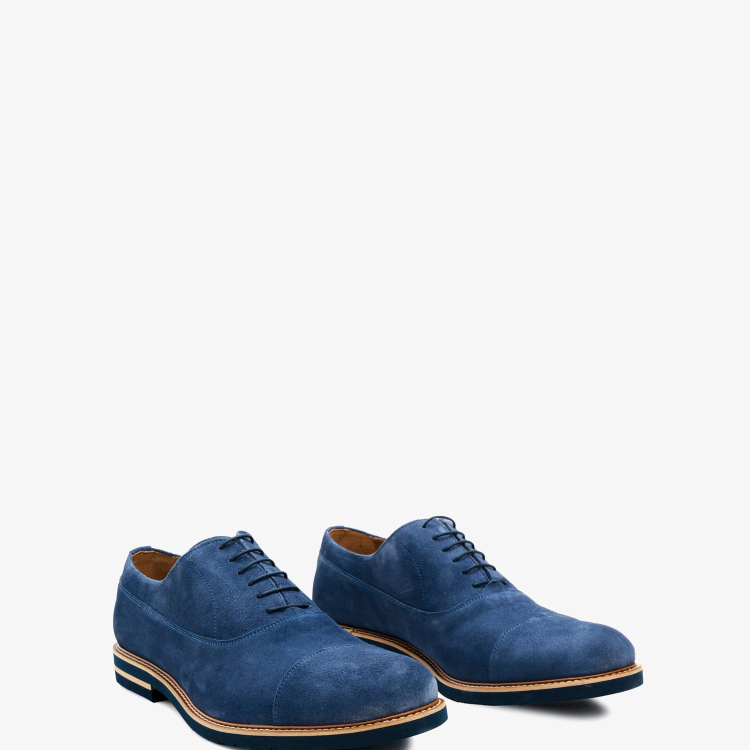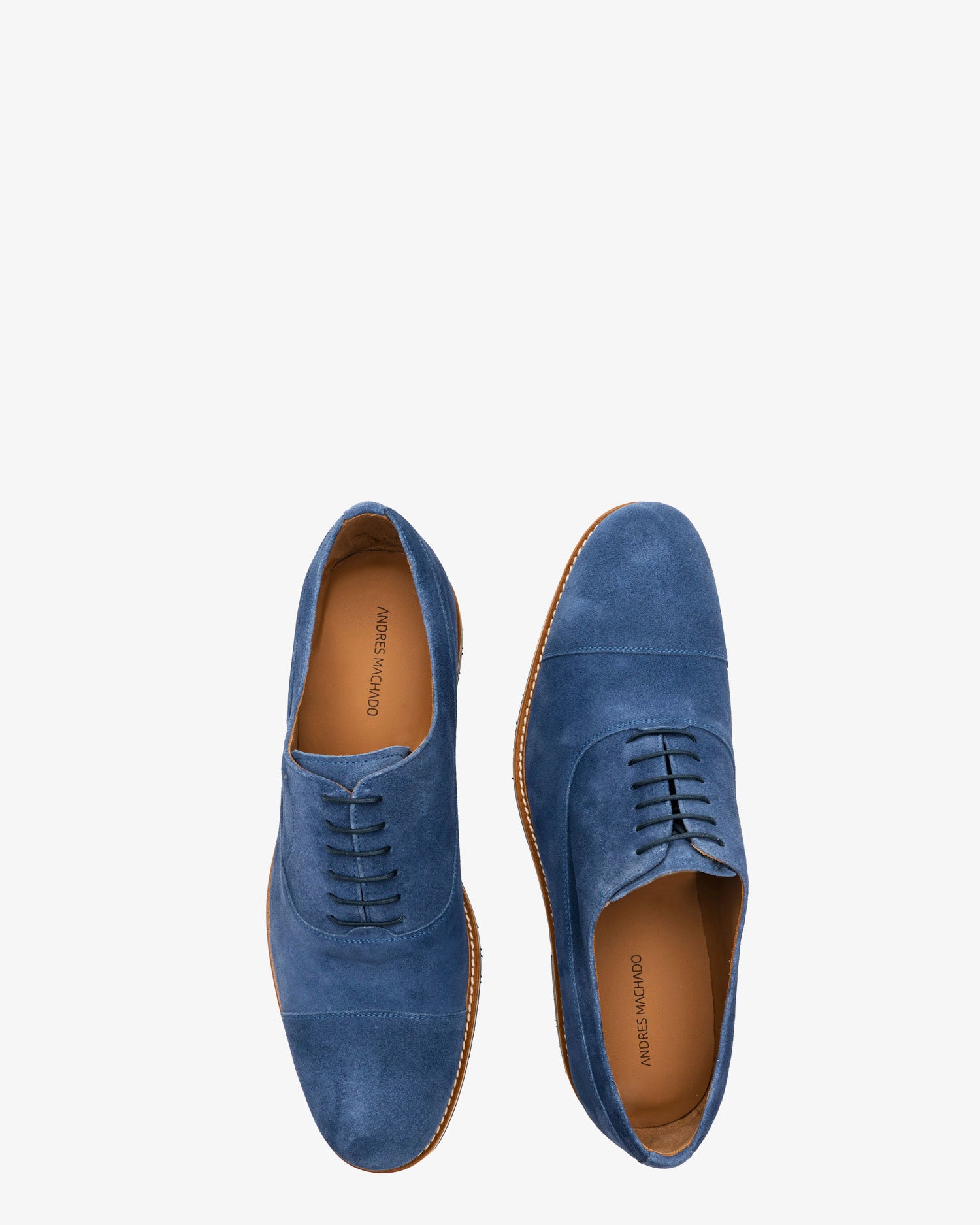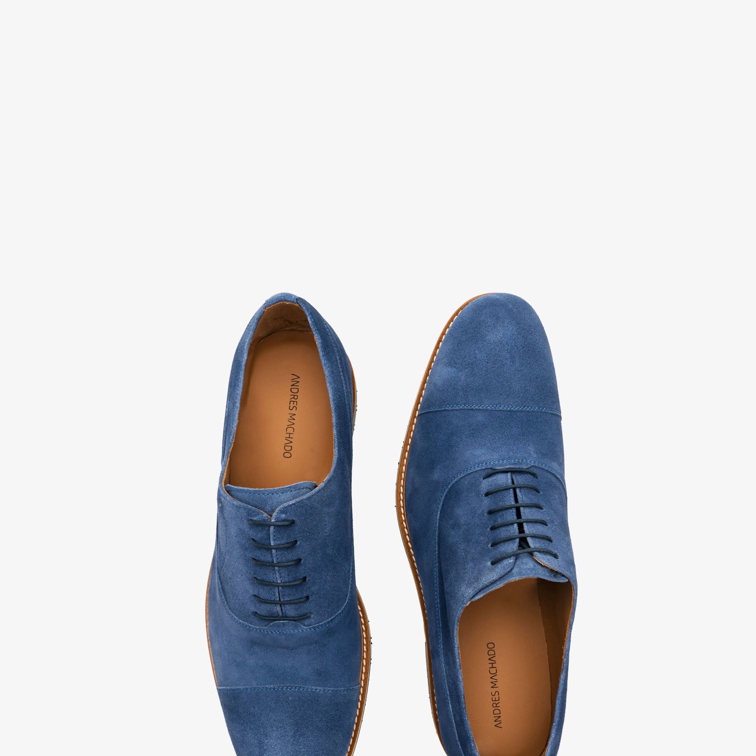 Blücher-Herrenschuhe aus blauem Wildleder mit passendem Schnürverschluss. Innenfutter aus beigefarbenem Leder. Sohle aus Eva-Gummi. Herren-Übergrößen von 47 bis 50. Hergestellt in Spanien.