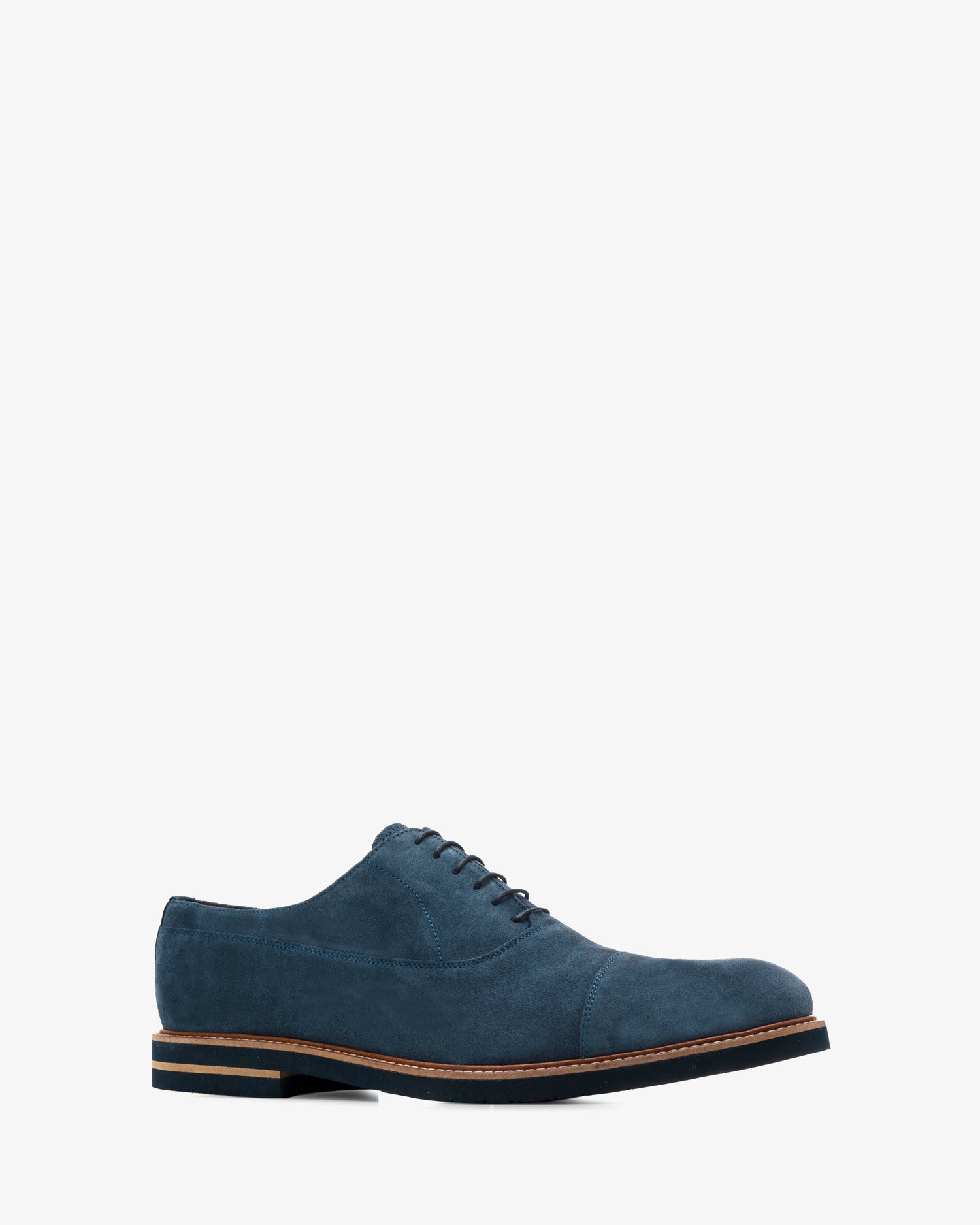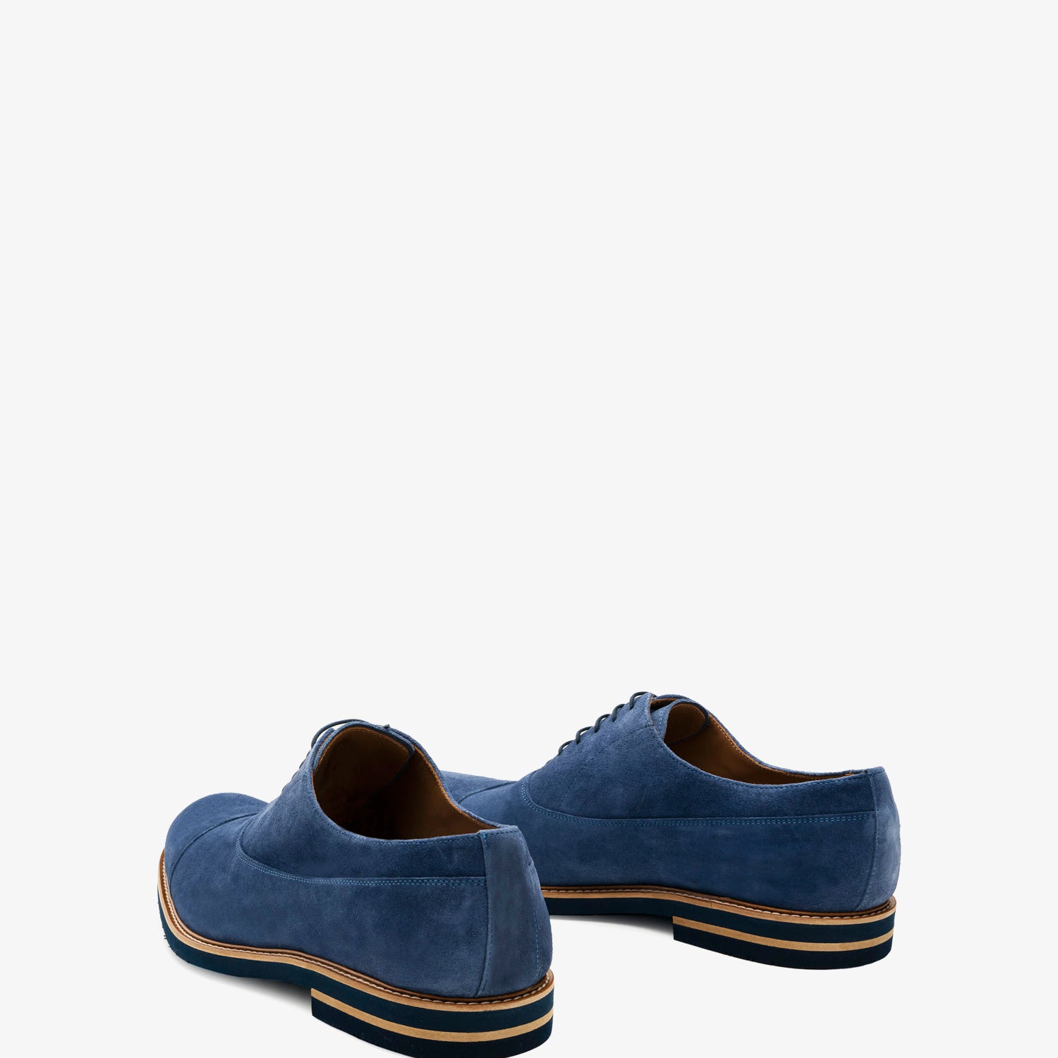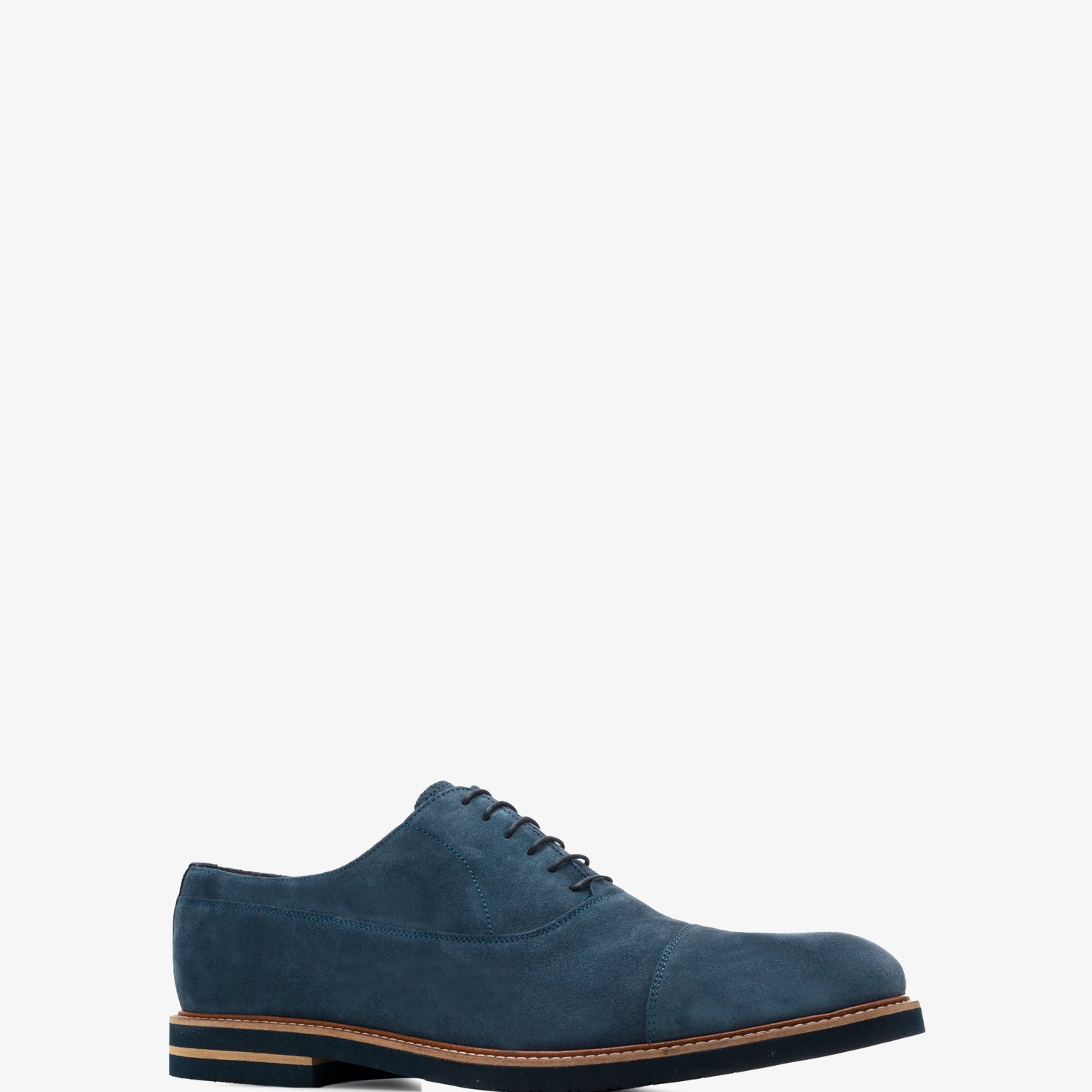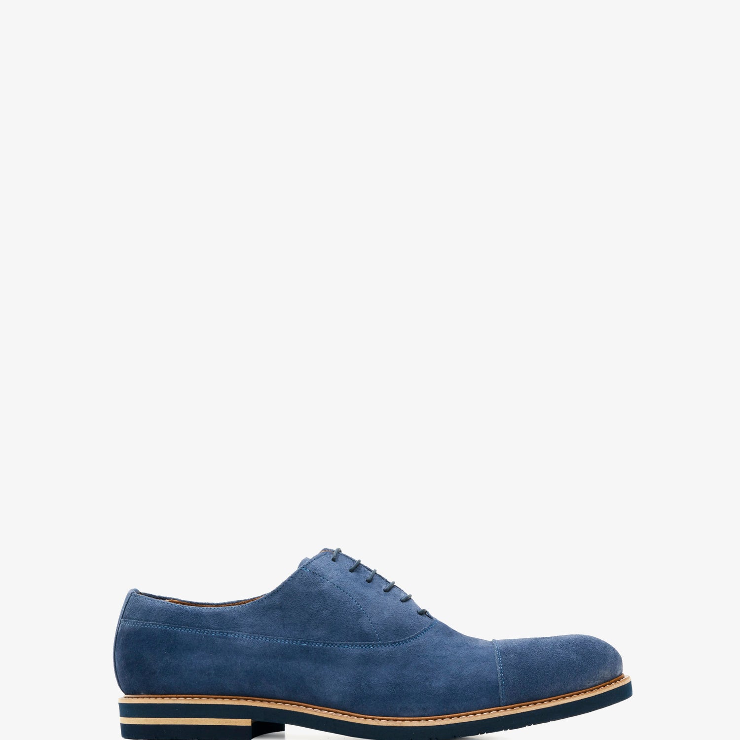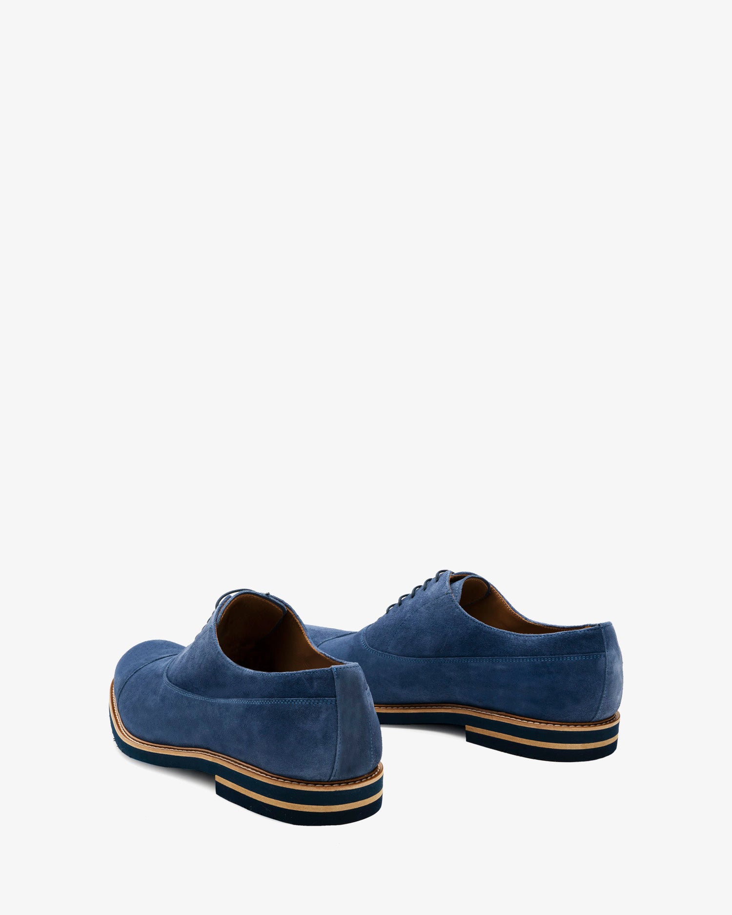 Blücher-Herrenschuhe aus blauem Wildleder mit passendem Schnürverschluss. Innenfutter aus beigefarbenem Leder. Sohle aus Eva-Gummi. Herren-Übergrößen von 47 bis 50. Hergestellt in Spanien.