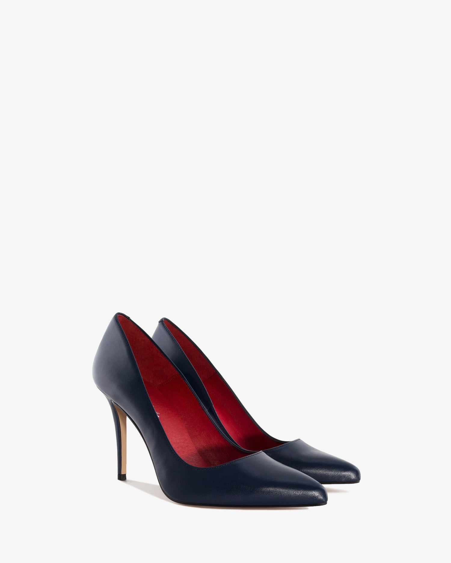 Stiletto mit spitzer Spitze und Absatz aus Nappaleder in Marineblau. Futter und Innensohle aus rotem Leder. 9,5 cm dünner Absatz für kleine Größen von 32 bis 35. 10 cm dünner Absatz für Zwischengrößen von 36 bis 41. 11,5 cm dünner Absatz für große Größen von 42 bis 45. Hergestellt in Spanien.