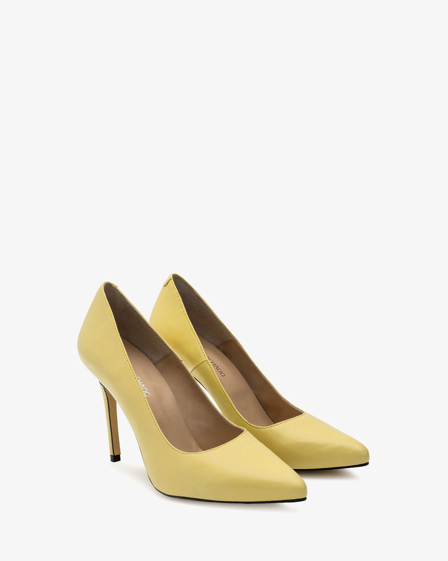 Spitz zulaufender Stiletto mit Absatz aus gelbem Leder. Futter und Innensohle aus Naturleder. 9,5 cm dünner Absatz für die kleinen Größen 32 bis 35. 11,5 cm dünner Absatz für die großen Größen 42 bis 45. Hergestellt in Spanien.
