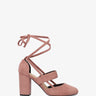 Rosafarbener High Heel-Schuh in Wildlederoptik. Design mit Ton-in-Ton-Riemen vom Spann bis zur Ferse mit Bindeverschluss um den Knöchel. Passender Streifen über dem Spann mit Gummizug auf der Innenseite. Geschlossene Spitze mit abgerundetem Abschluss. Breit, gefüttert, 9,3 cm Absatz für kleine Größen 32 bis 35. Breit, 10 cm Absatz für große Größen 42 bis 45. Dieses Modell kann eine Maßabweichung vom Standard aufweisen; wir empfehlen, die cm-Angabe der Innensohle bzw. Brandsohle zu überprüfen.