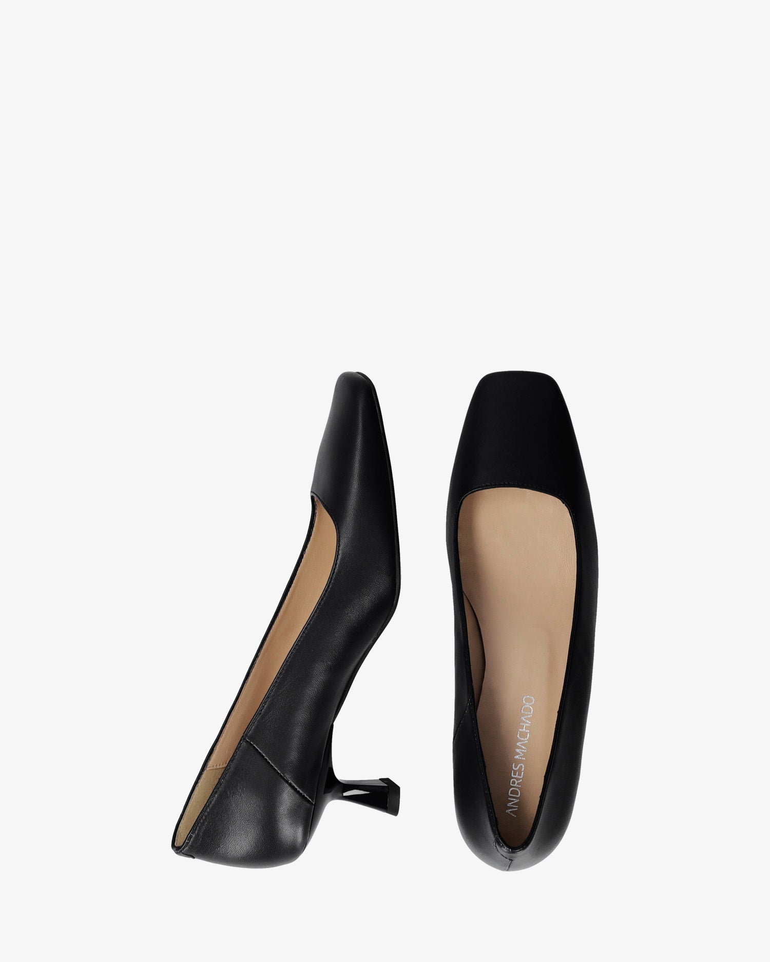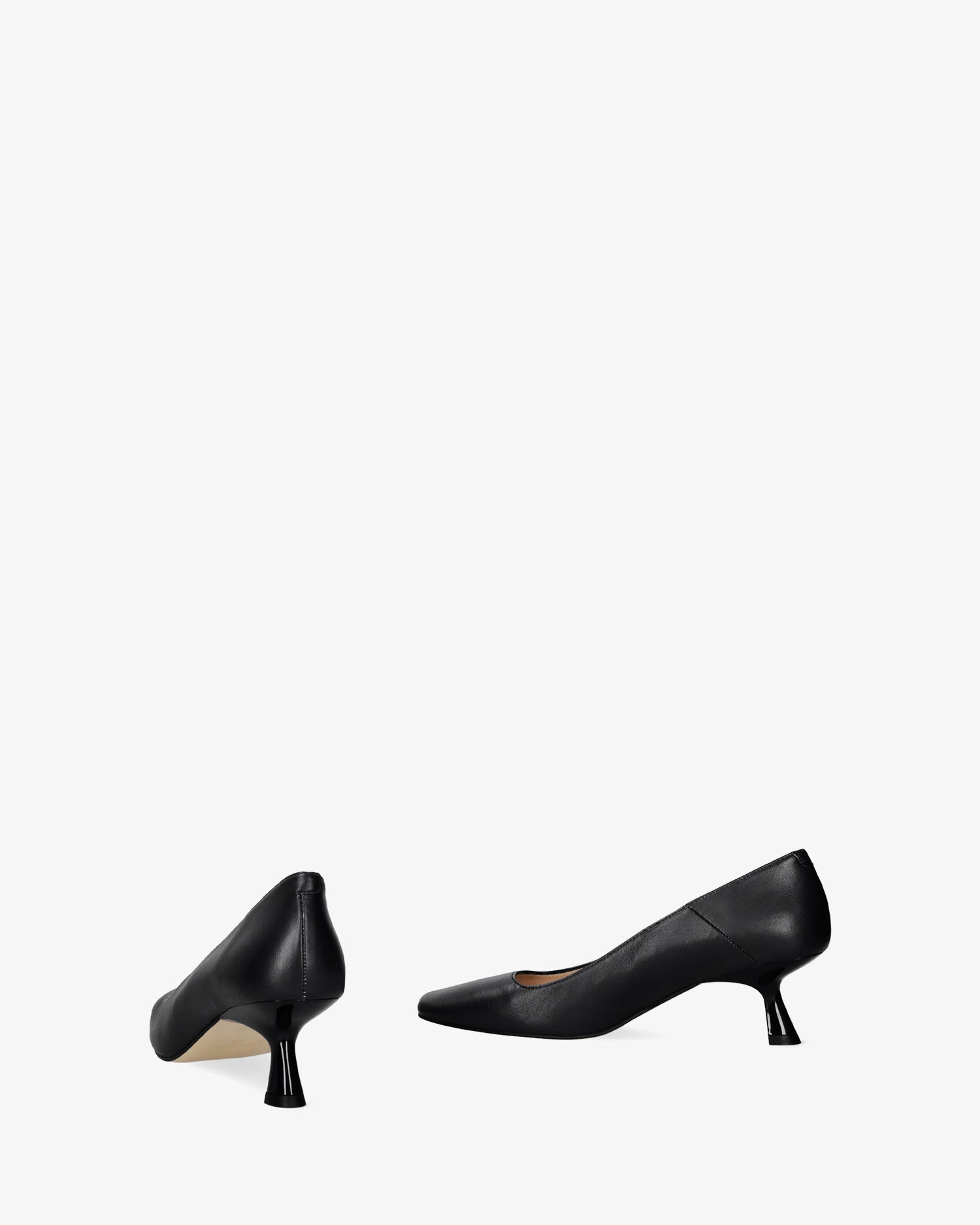 High Heel-Schuh aus schwarzem Leder. Quadratische Zehenpartie. Innenfutter aus beigefarbenem Leder. 5,5 cm hoher Kitten Heel in Lacklederoptik für die kleinen Größen 32 bis 35. 5,5 cm hoher Absatz für die mittleren Größen 36 bis 41. 6 cm hoher Absatz für die großen Größen 42 bis 45. Hergestellt in Spanien