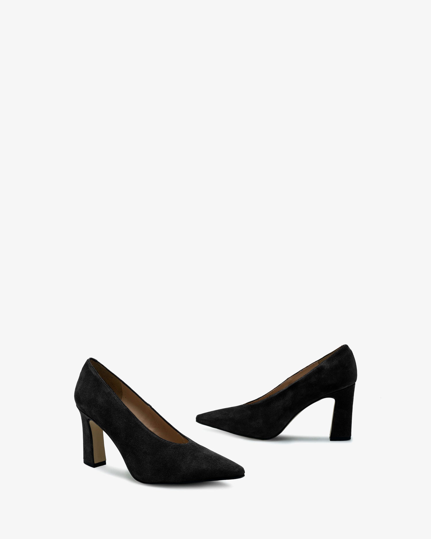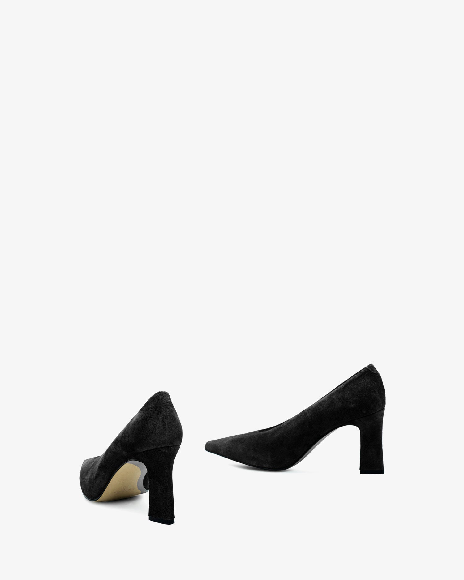Schwarze Wildleder-Lounge. Spitzer Abschluss. Innenfutter aus kamelfarbenem Leder. 8,5 cm breiter, Ton-in-Ton gefütterter Absatz für die kleinen Größen 32 bis 35. 9,5 cm Absatz für die großen Größen 42 bis 45. Hergestellt in Spanien.