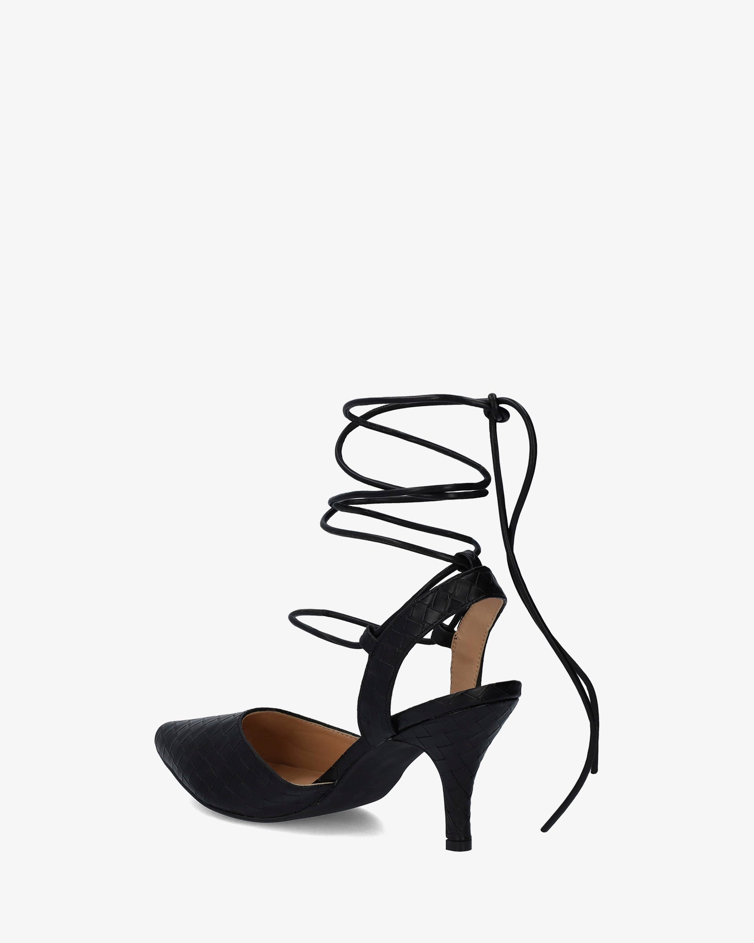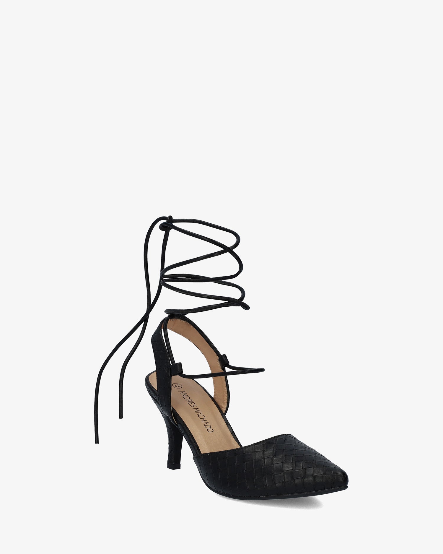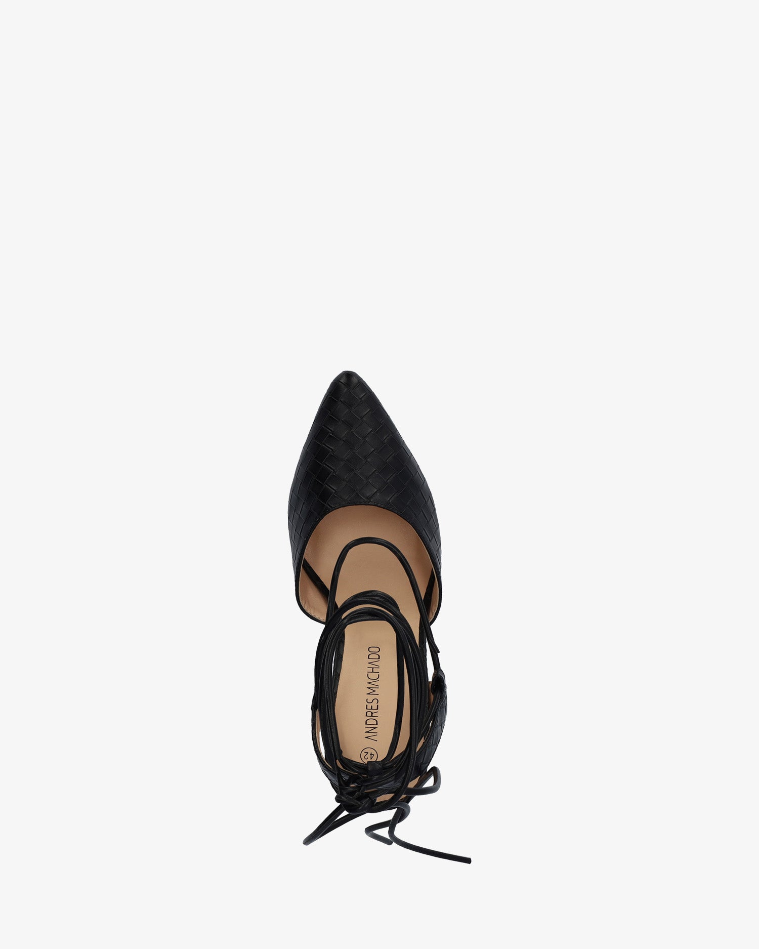Wohnzimmer in weichem, schwarzem Geflecht. Abgerundet durch eine geschlossene spitze Zehenpartie und einen passenden geflochtenen Mittelabsatz. Rückenfreies Design und Verschluss mit dünnen, passenden Riemen, die um den Knöchel gebunden werden. 7 cm Absatz für die kleinen Größen 32 bis 35. 9 cm Absatz für die großen Größen 42 bis 45.