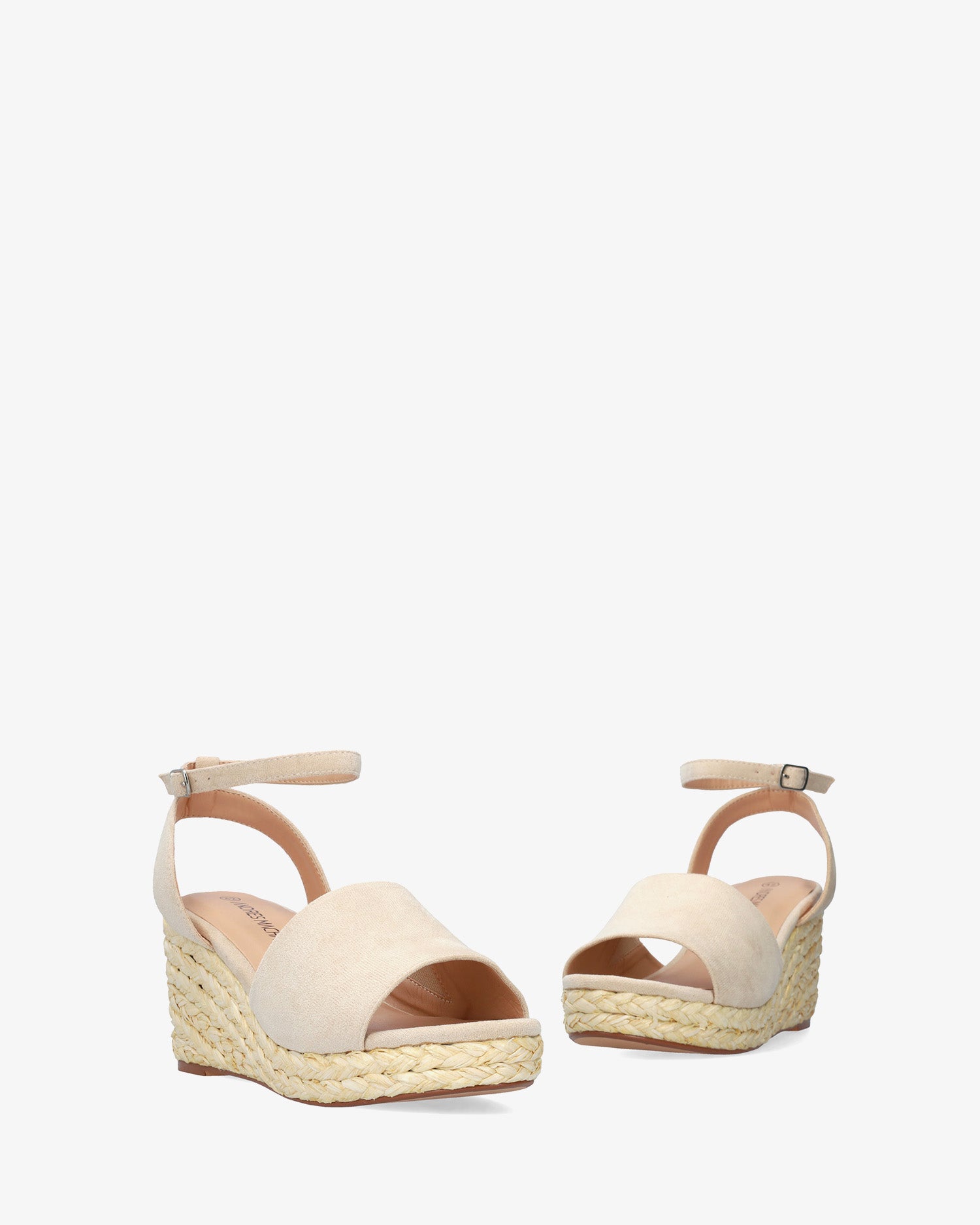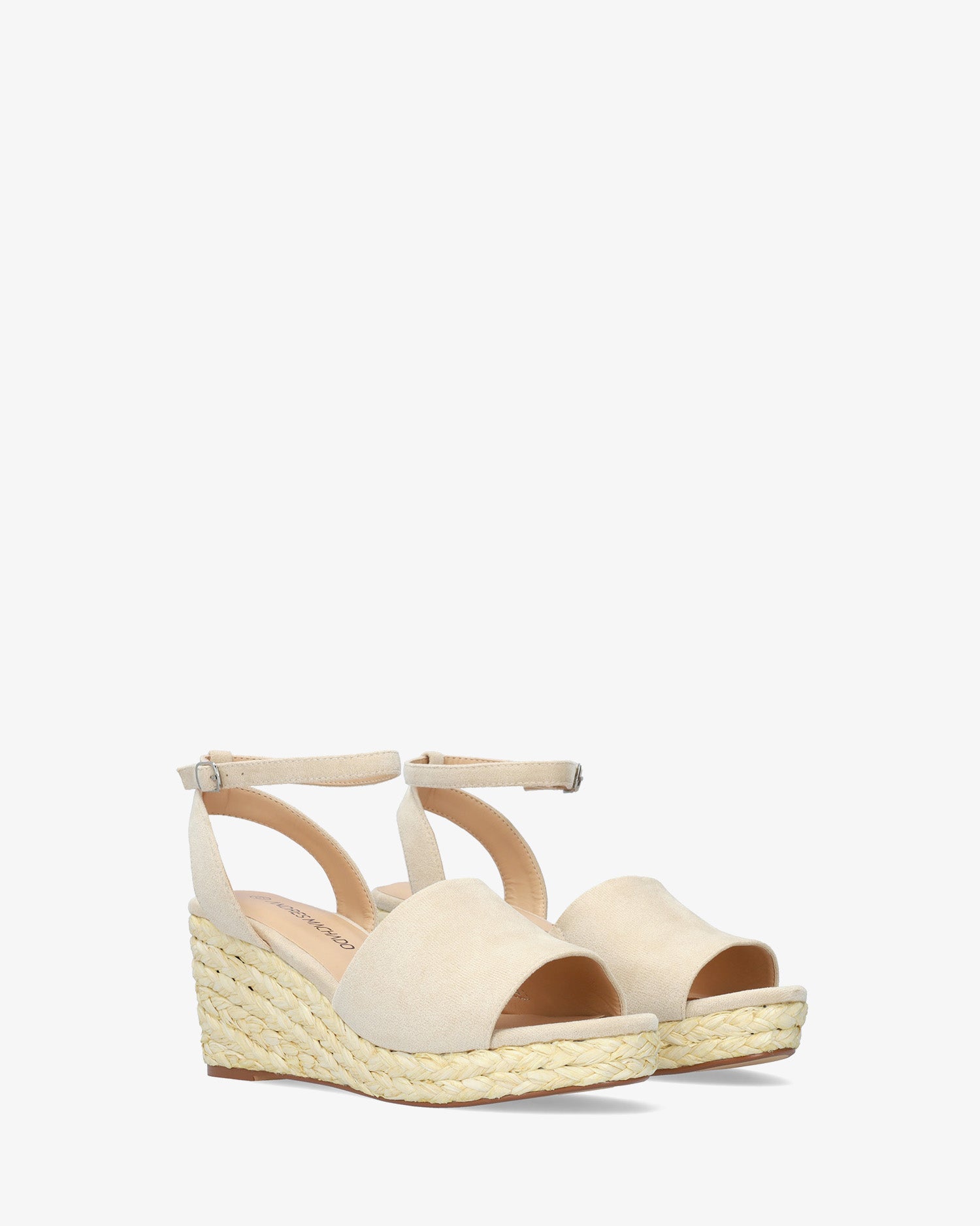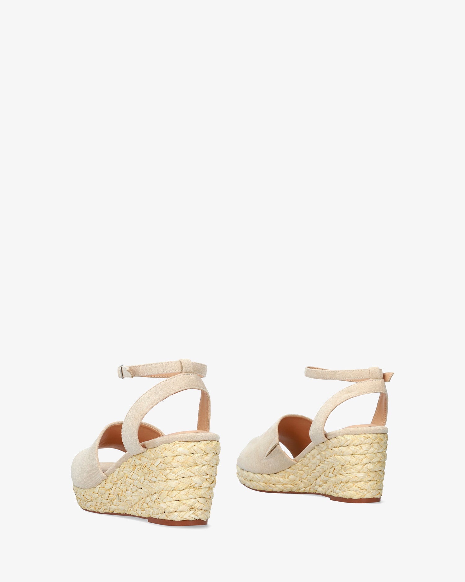 Beige Keilsandaletten aus Wildleder. Rückenfreies Design und breiter, passender Riemen über dem Spann. Metallschnallenverschluss zum Binden um den Knöchel. Offene Zehenpartie. Keilabsätze und Plateau vorne aus Jute. 7,5 cm Keilabsatz und 2,5 cm Plateau für die kleinen Größen 32 bis 35. 9 cm Keilabsatz und 3 cm Plateau für die großen Größen 42 bis 45. Dieses Modell kann eine Maßabweichung gegenüber dem Standard aufweisen, wir empfehlen Ihnen, die cm-Angabe der Innensohle oder Einlegesohle zu überprüfen.