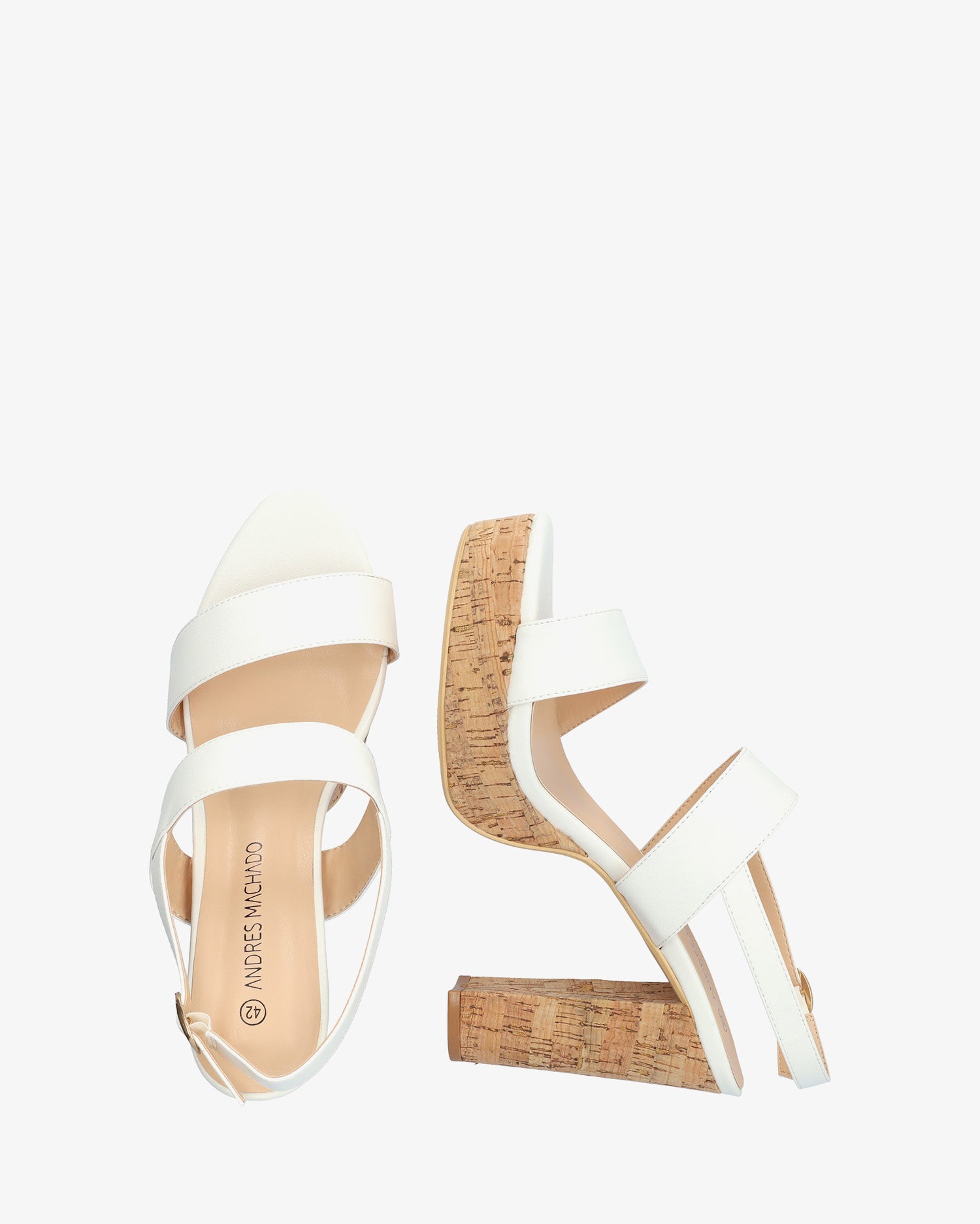 Weiche weiße Sandalen mit breitem, hohem Korkabsatz und Plateau. Rückenfreies Design mit zwei breiten Trägern vorne und am Spann in passender Farbe. Mit offener und feiner Spitze versehen. Metallschnallenverschluss mit Rückenriemen. 10,5 cm Absatz und 2,5 cm Plateau für die kleinen Größen 32 bis 35. 12,5 cm Absatz und 3 cm Plateau für die großen Größen 42 bis 45.