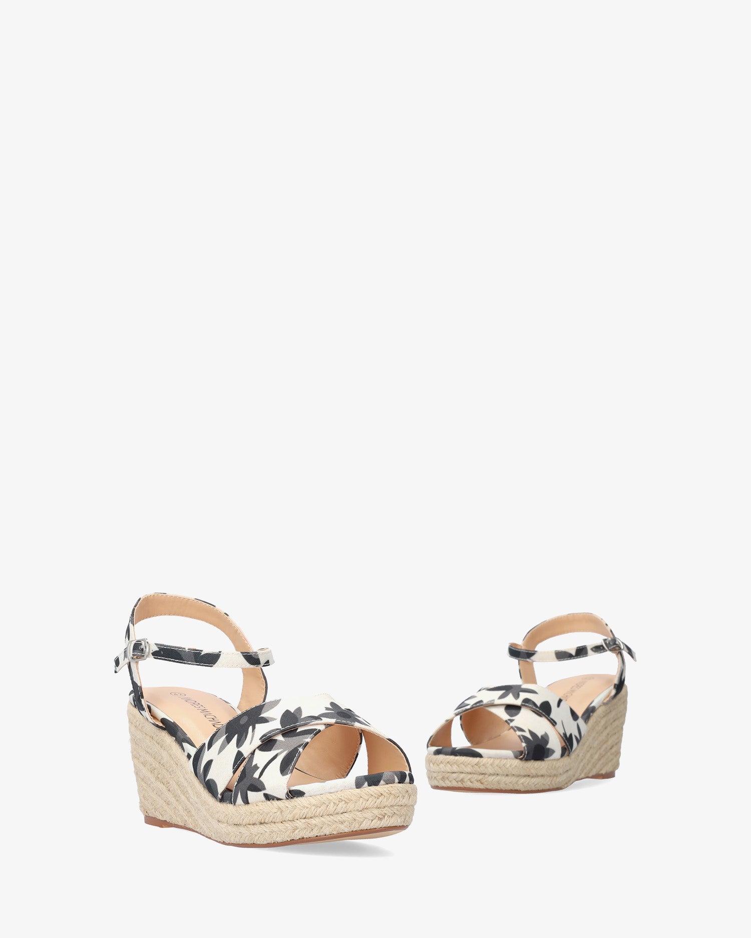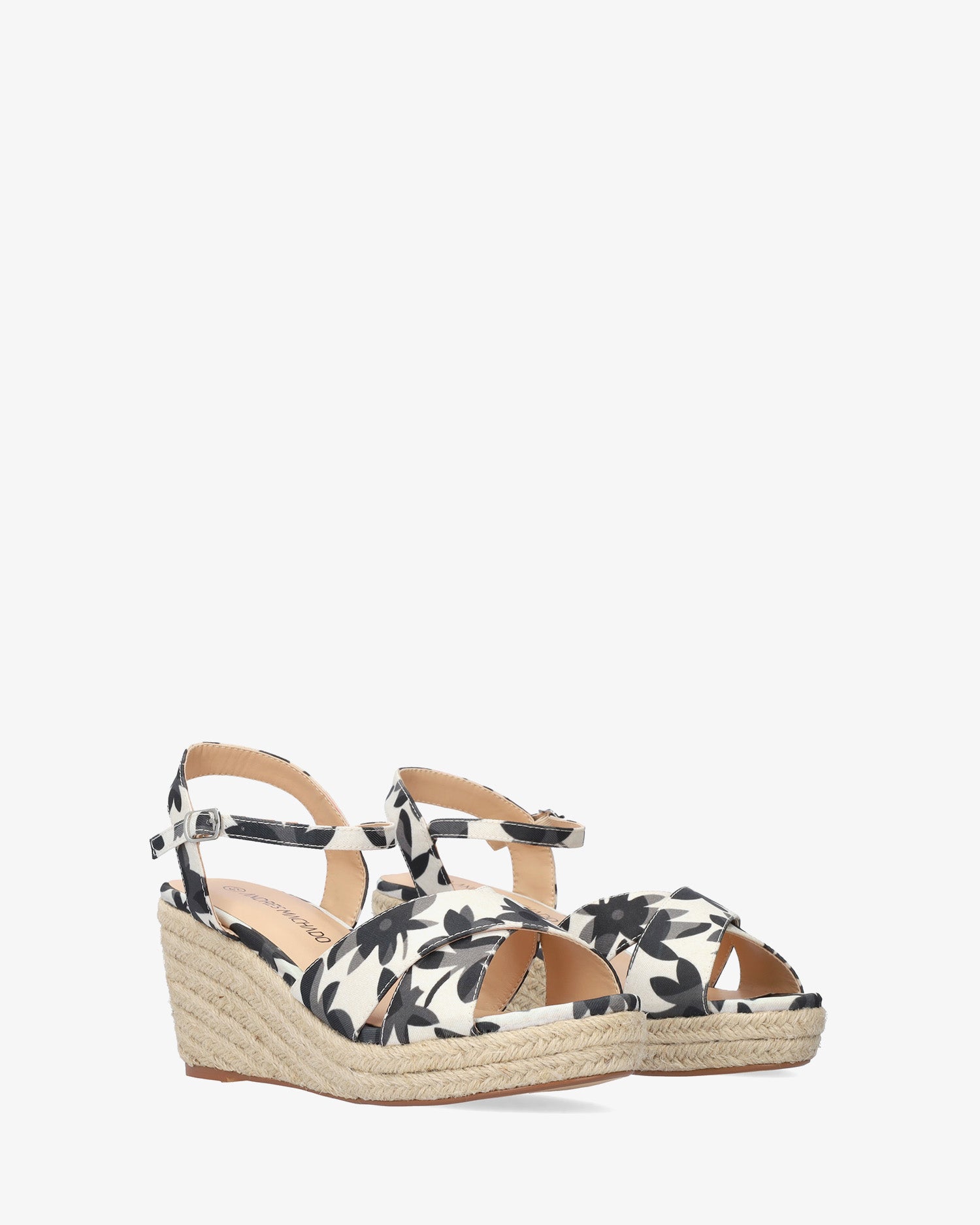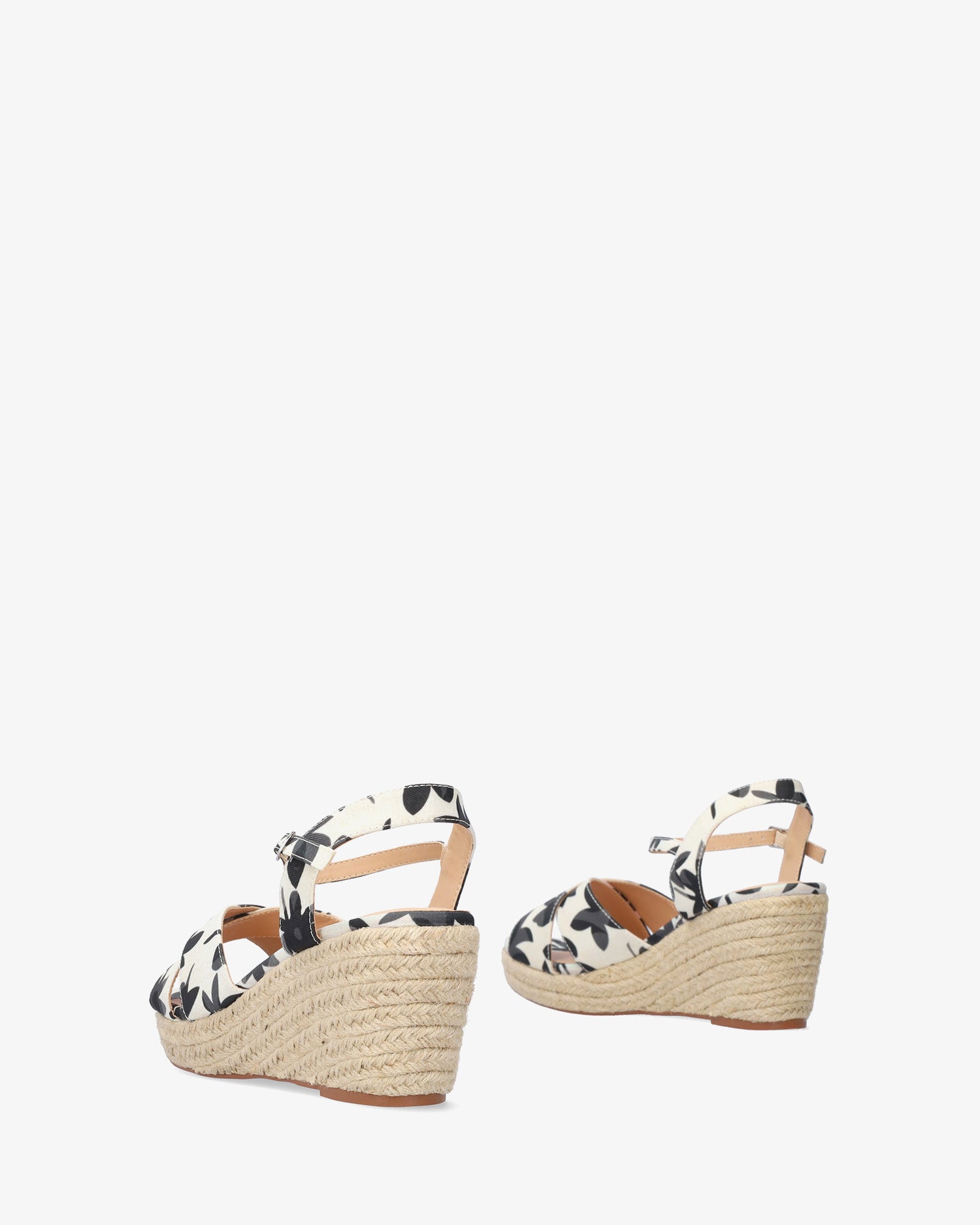 Keilsandalen aus Stoff mit schwarzen und grauen Blumenmotiven. Rückenfreies Design mit Fersenriemen. Offene, runde Spitze mit breiten, überkreuzten Riemen vorne. Metallschnallenverschluss mit passendem Knöchelriemen. Keilabsätze und Plateau vorne aus Jute. 7 cm Keilabsatz und 2 cm Plateau für die kleinen Größen 32 bis 35. 8,5 cm Keilabsatz und 2,5 cm Plateau für die großen Größen 42 bis 45.