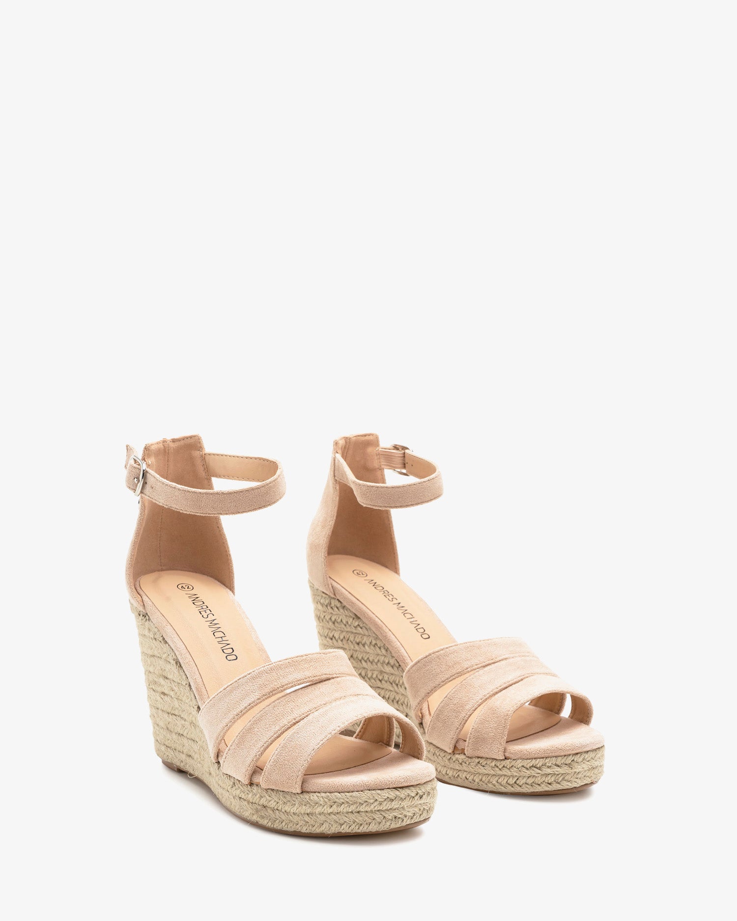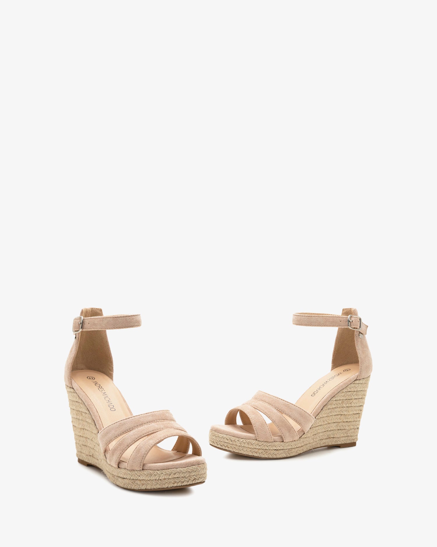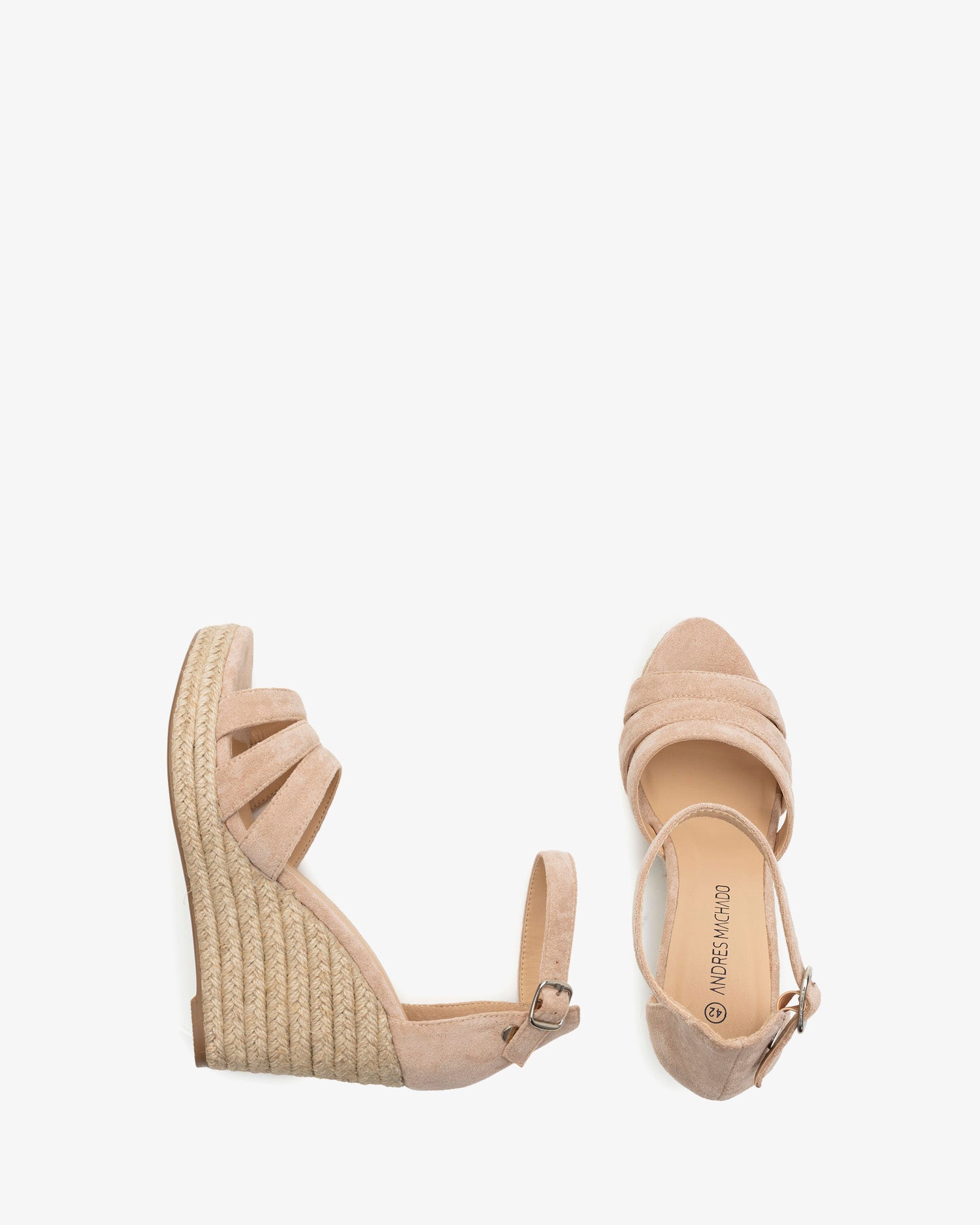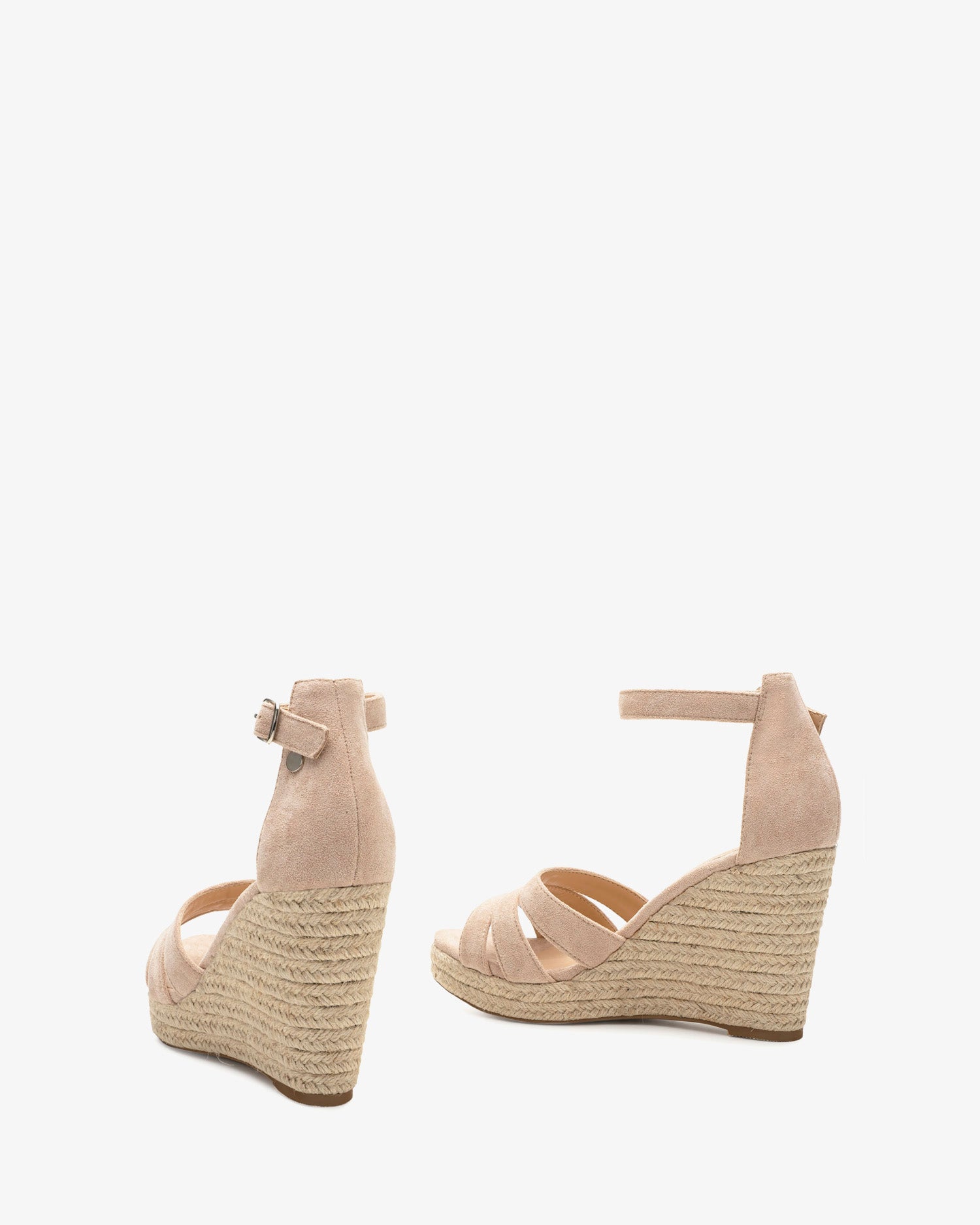Beige Espadrilles mit Keilabsatz aus Wildleder. Ton-in-Ton-Streifendesign vorne verbunden. Beigefarbener, wildlederartig bezogener Absatz. Schnallenverschluss mit passendem Knöchelriemen. Offene Zehenpartie. Keilabsätze und Plateau vorne aus Jute. 9,5 cm Keilabsatz und 2 cm Plateau für die kleinen Größen 32 bis 35. 10,5 cm Keilabsatz und 2 cm Plateau für die großen Größen 42 bis 45.