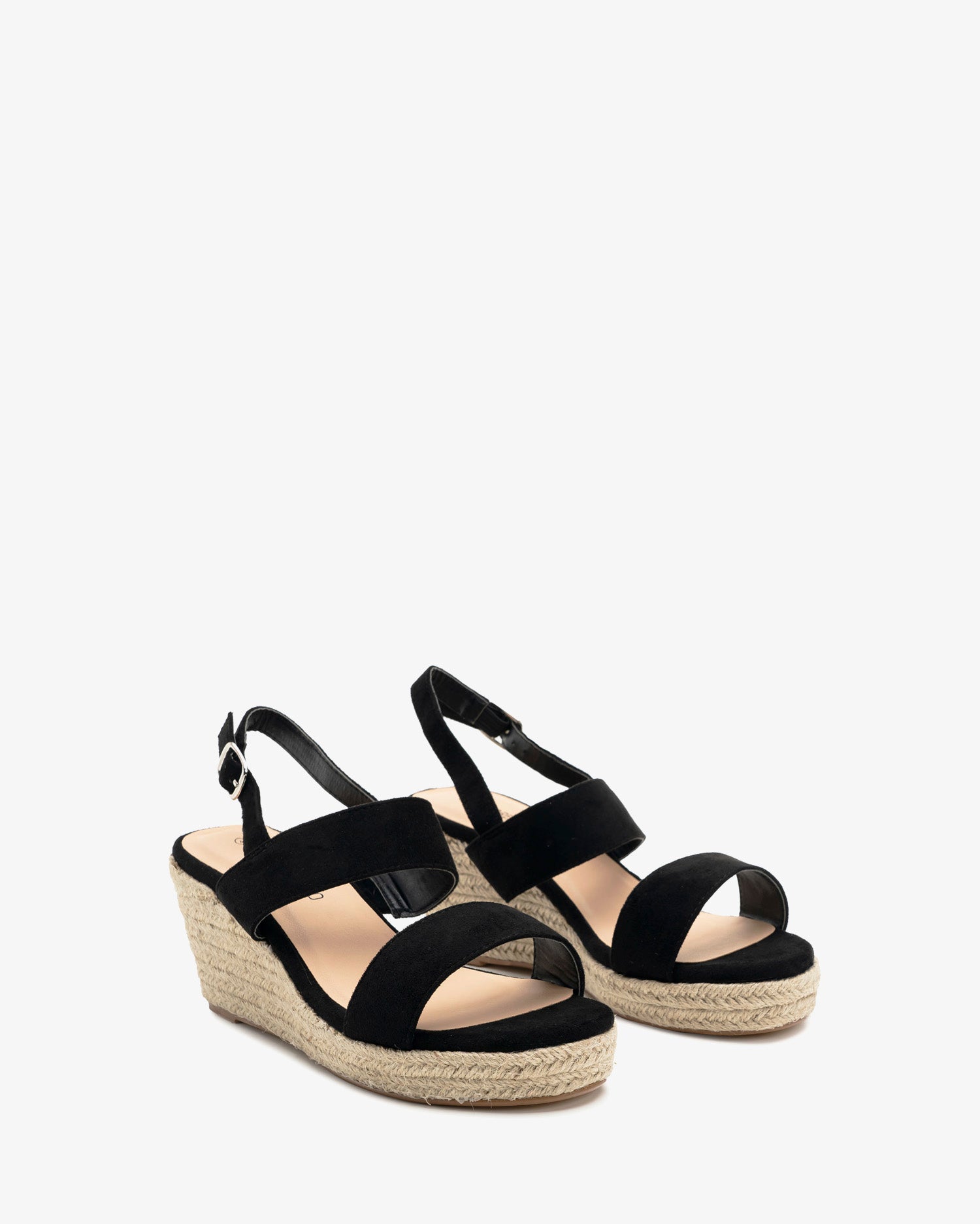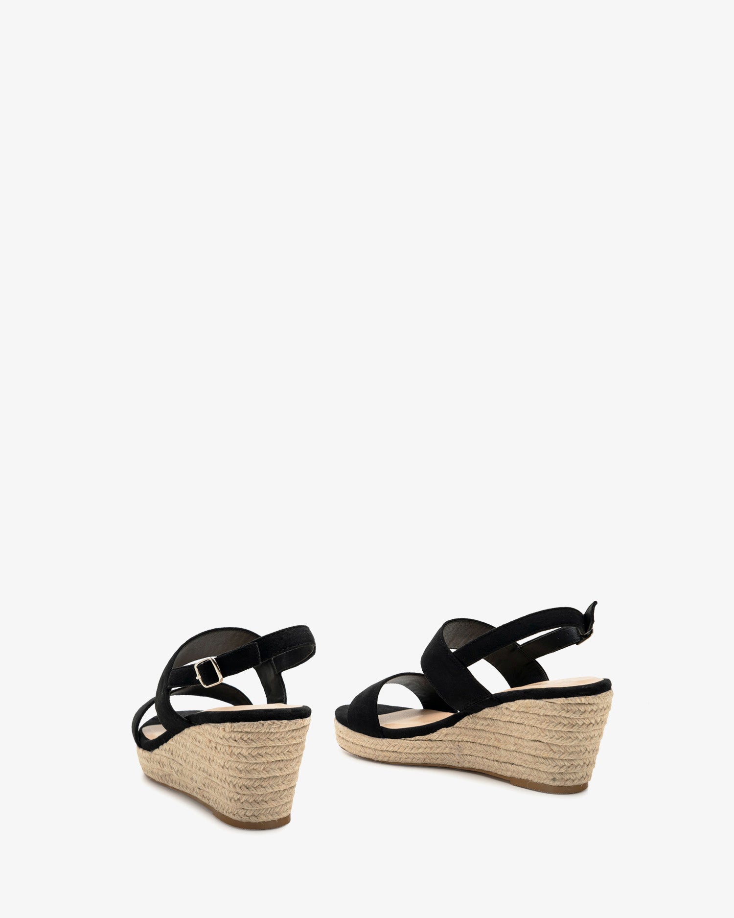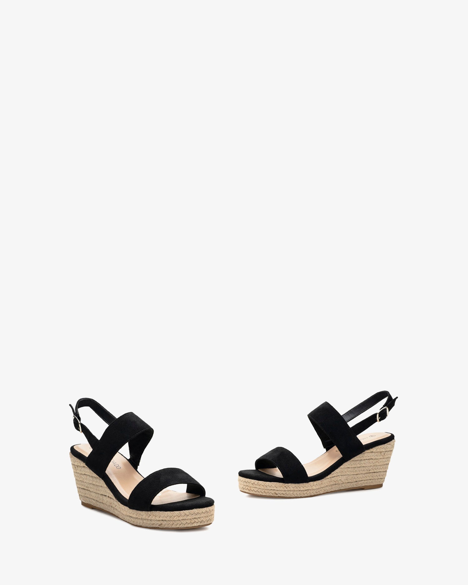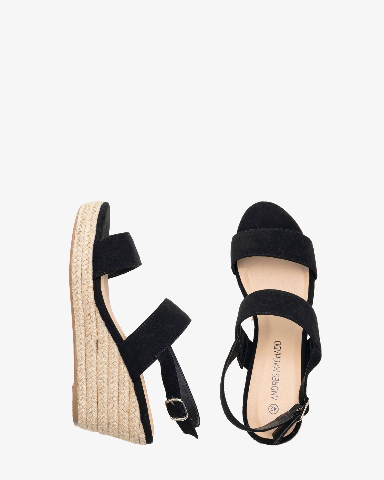 Schwarze Wildleder-Espadrille mit Jute-Keil. Design mit zwei breiten, Ton-in-Ton-Streifen an der Spitze und um den Spann. Schnallenverschluss mit passenden Riemen auf der Rückseite. Abgerundete und offene Spitze. 7 cm Keilabsatz und 2 cm Plateau bei den kleinen Größen 32 bis 35. 8 cm Keilabsatz und 2 cm Plateau bei den großen Größen 42 bis 45. Dieses Modell fällt klein aus, daher wird empfohlen, eine Nummer größer als üblich zu bestellen.