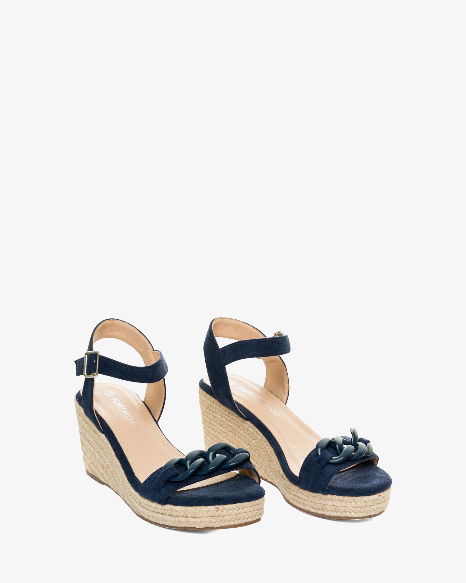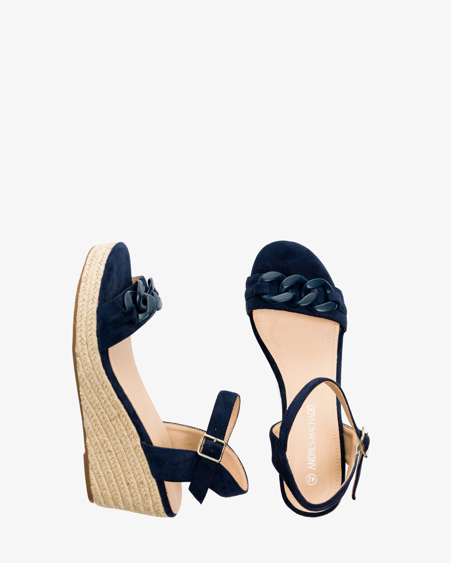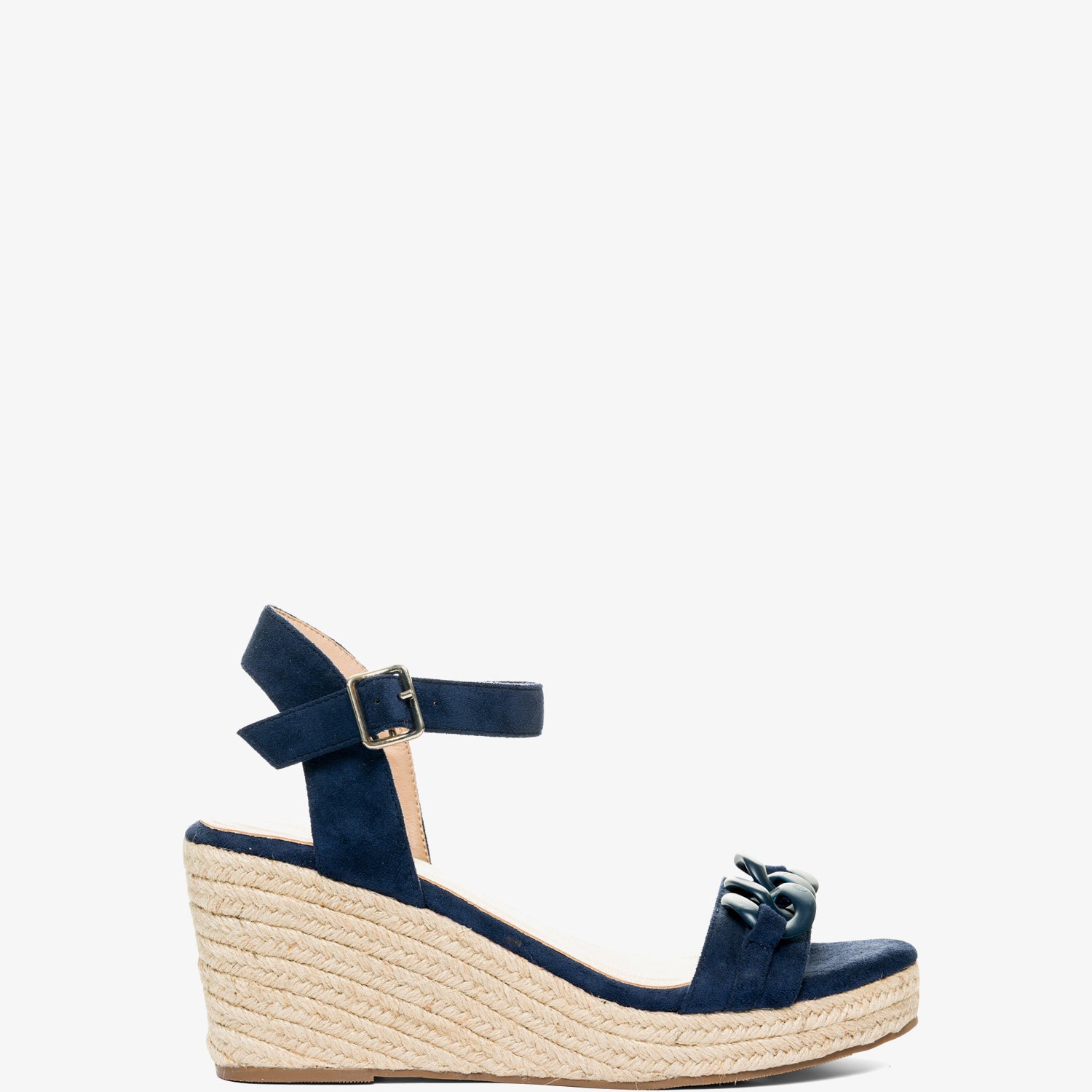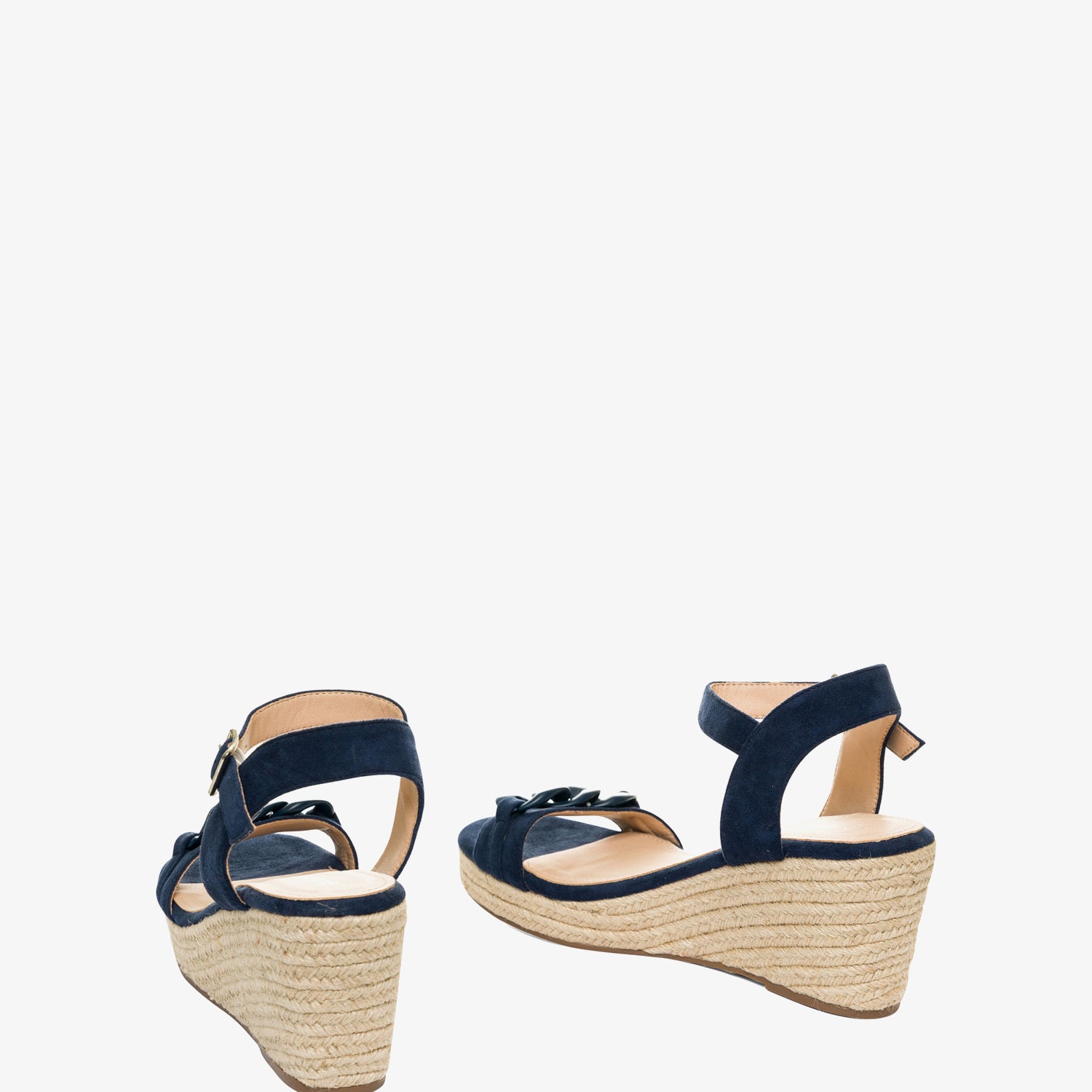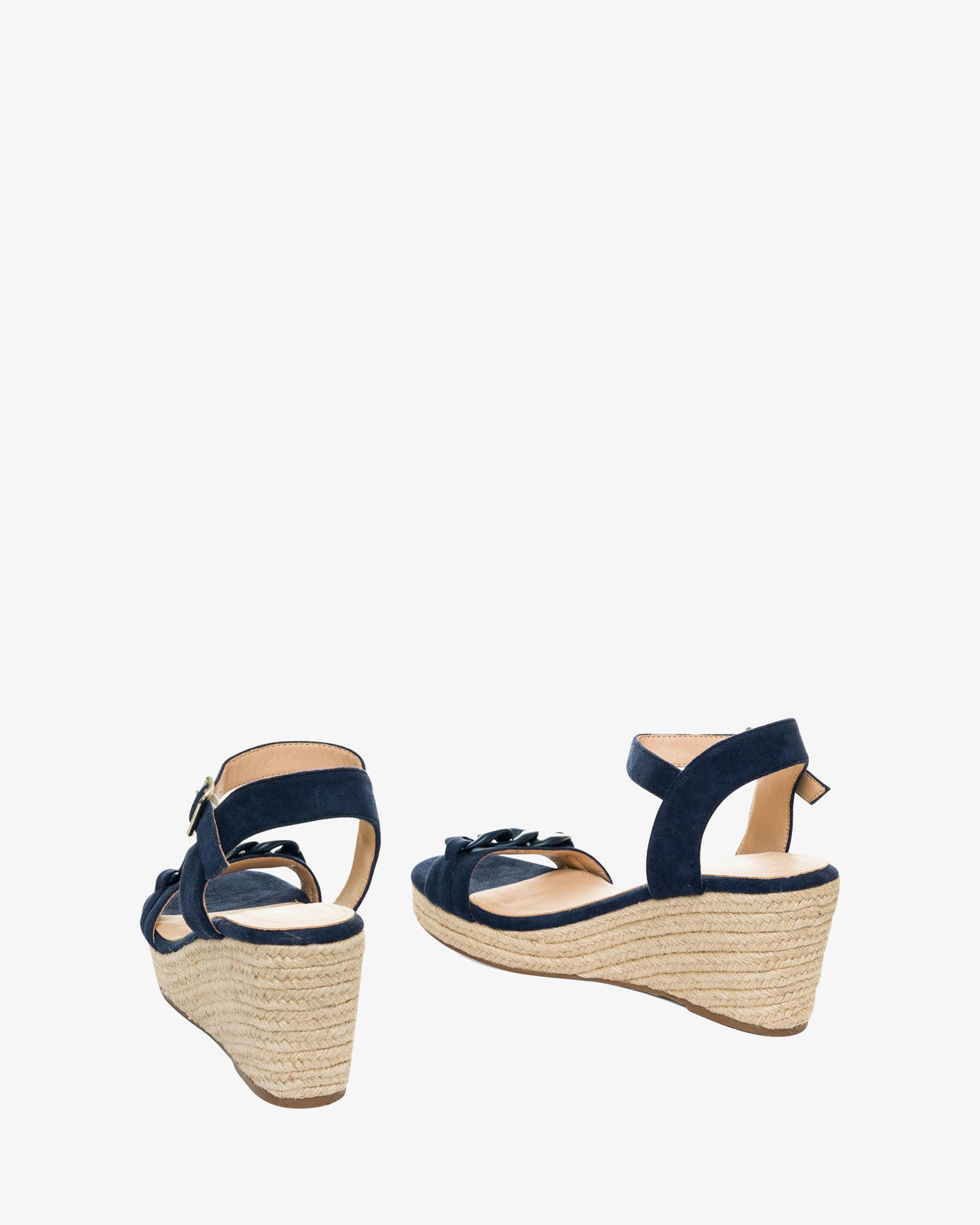 Marineblaue Wildleder-Espadrilles mit Keilabsatz. Rückenfreies Design mit einem Ton-in-Ton-Kettengliedriemen auf der Vorderseite. Schnallenverschluss mit passendem Knöchelriemen. Offene Zehenpartie. Keilabsätze und Plateau vorne aus Jute. 8 cm Keilabsatz und 3 cm Plateau für die kleinen Größen 32 bis 35. 9 cm Keilabsatz und 3 cm Plateau für die großen Größen 42 bis 45. Dieses Modell fällt groß aus, daher wird empfohlen, eine Nummer kleiner als üblich zu bestellen.