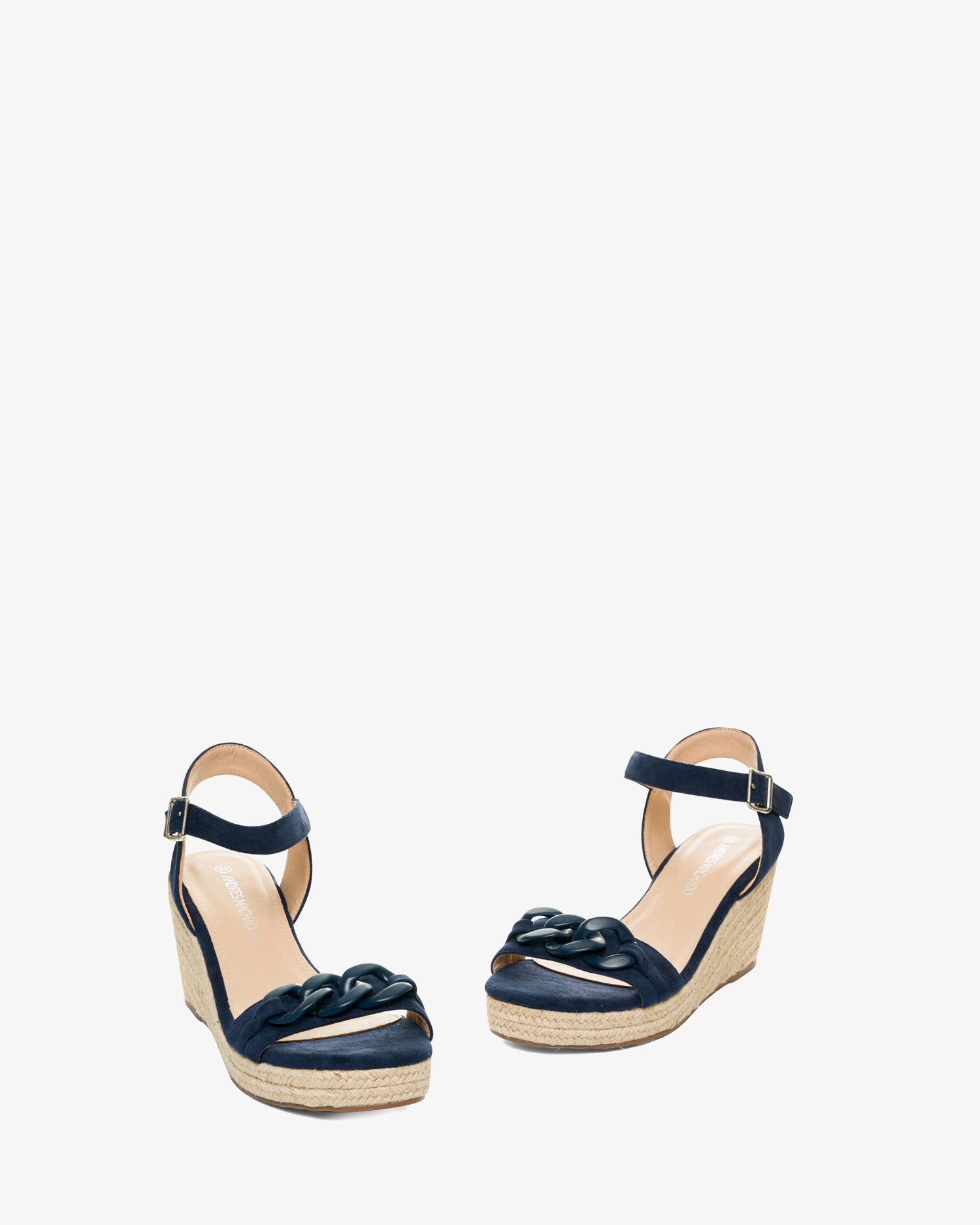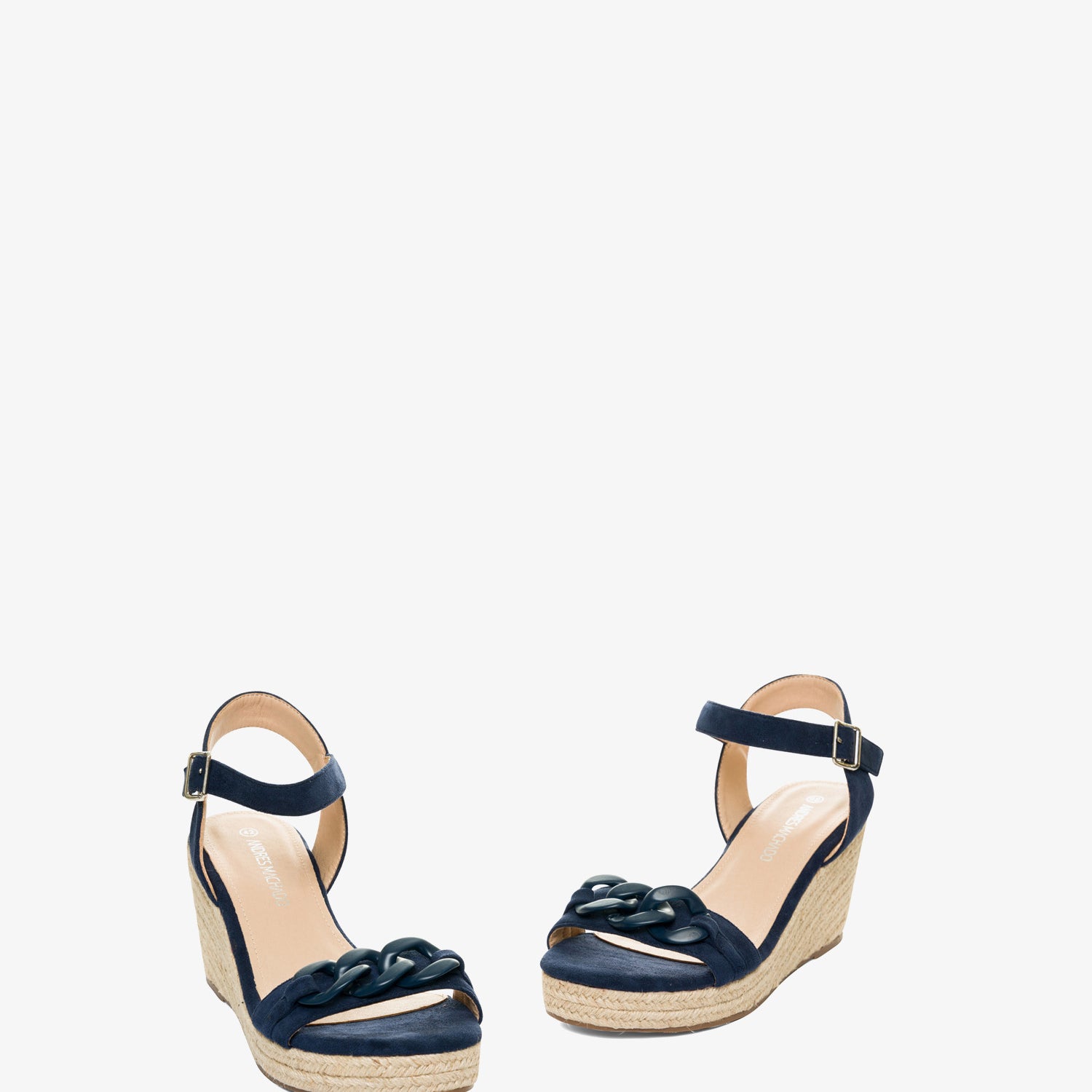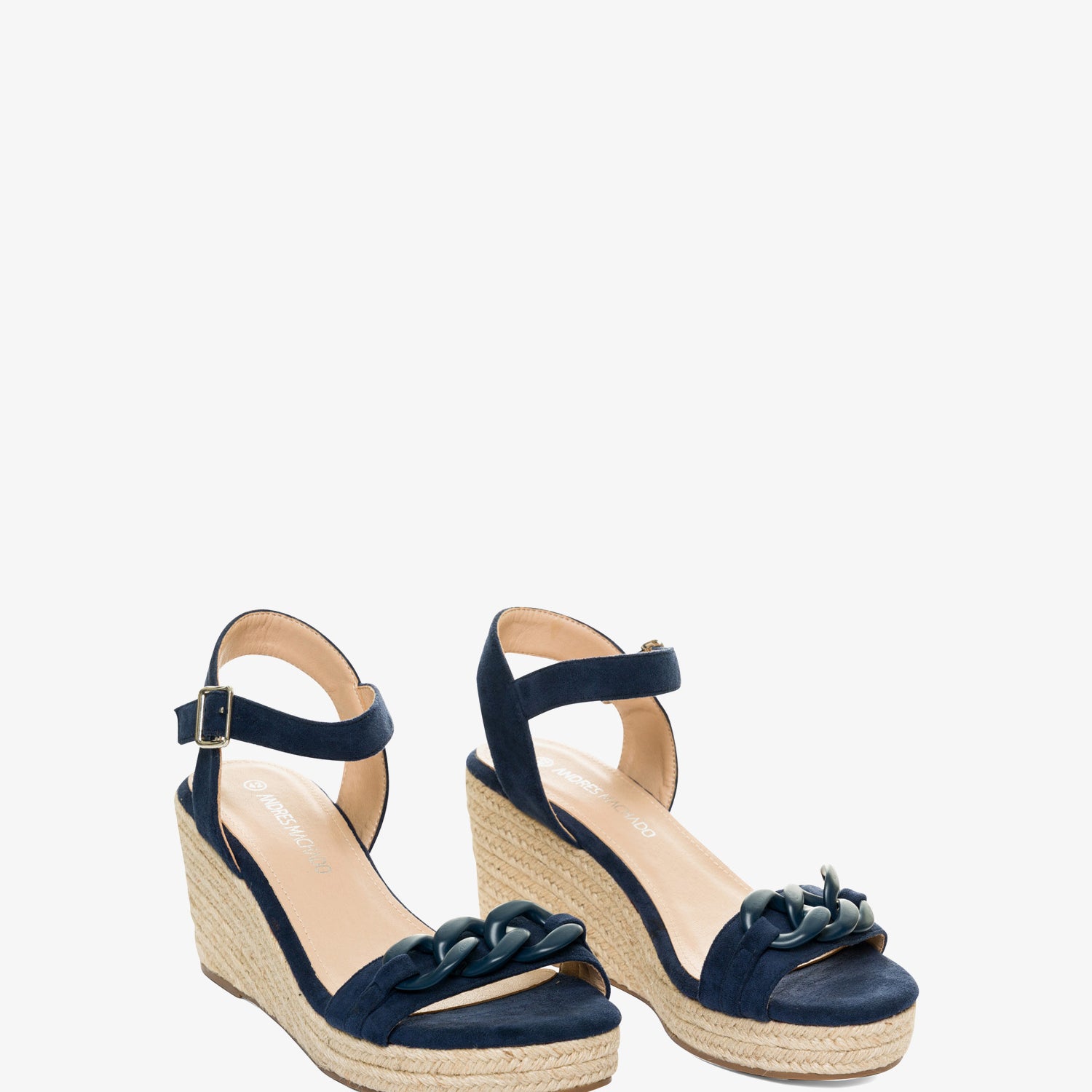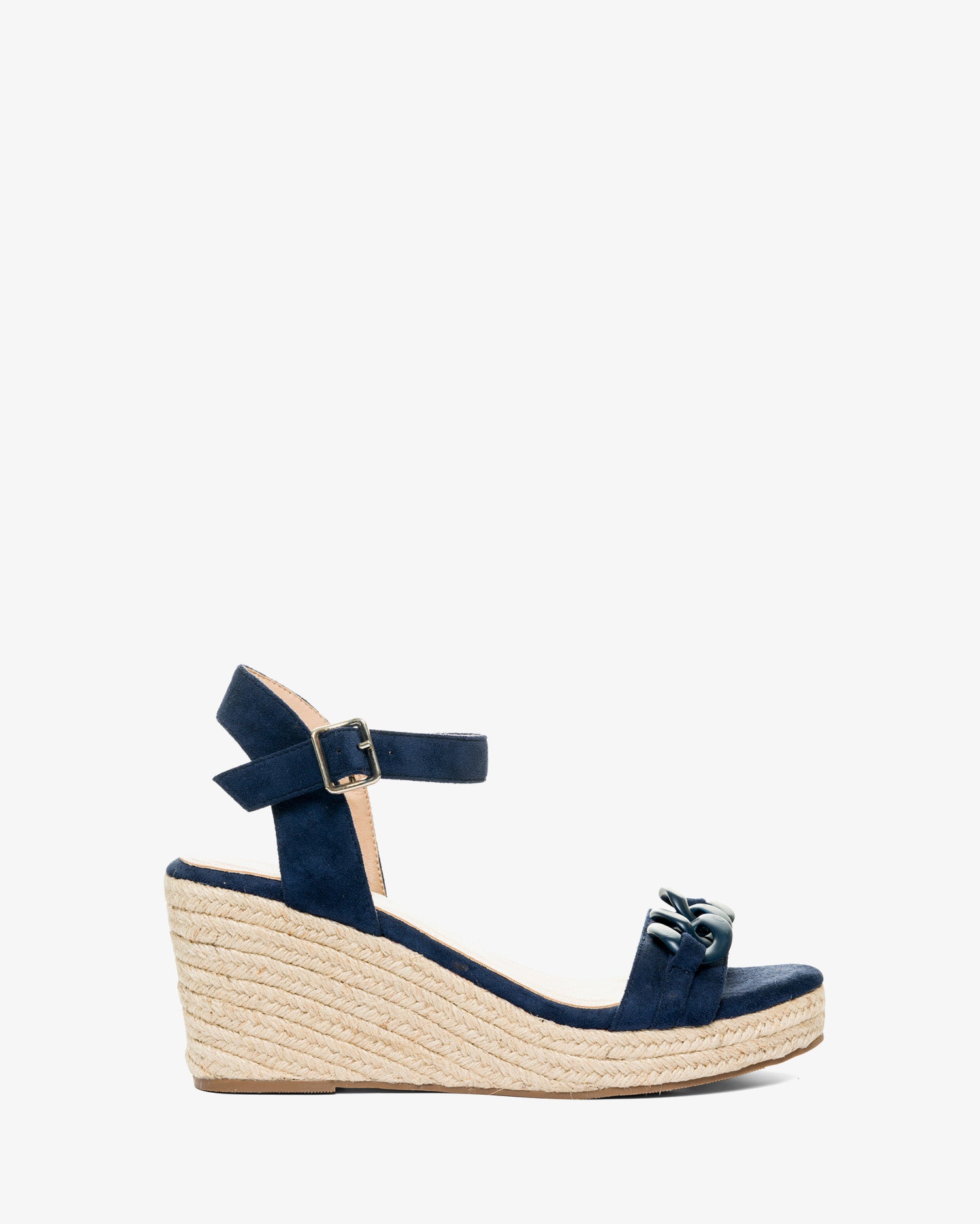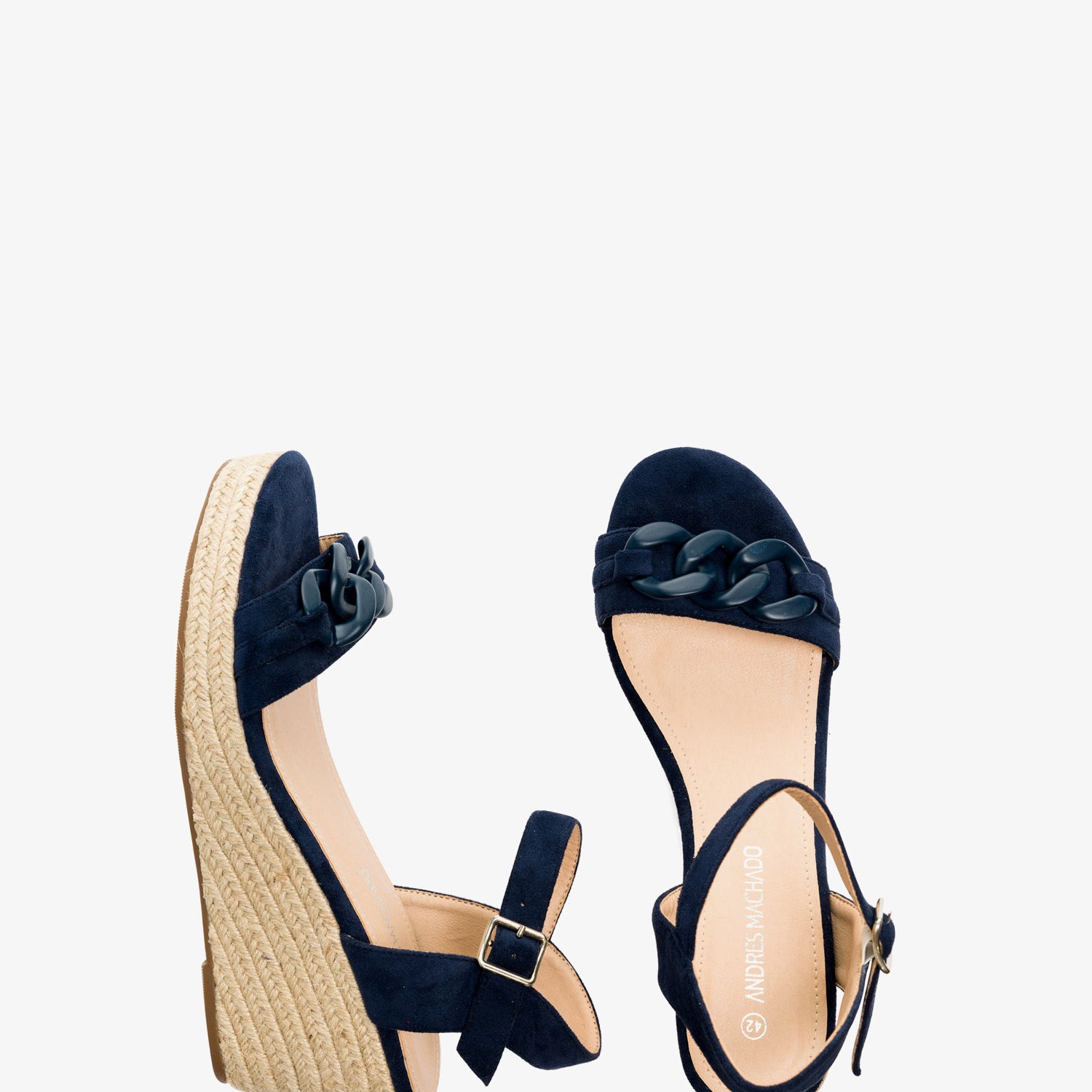 Marineblaue Wildleder-Espadrilles mit Keilabsatz. Rückenfreies Design mit einem Ton-in-Ton-Kettengliedriemen auf der Vorderseite. Schnallenverschluss mit passendem Knöchelriemen. Offene Zehenpartie. Keilabsätze und Plateau vorne aus Jute. 8 cm Keilabsatz und 3 cm Plateau für die kleinen Größen 32 bis 35. 9 cm Keilabsatz und 3 cm Plateau für die großen Größen 42 bis 45. Dieses Modell fällt groß aus, daher wird empfohlen, eine Nummer kleiner als üblich zu bestellen.
