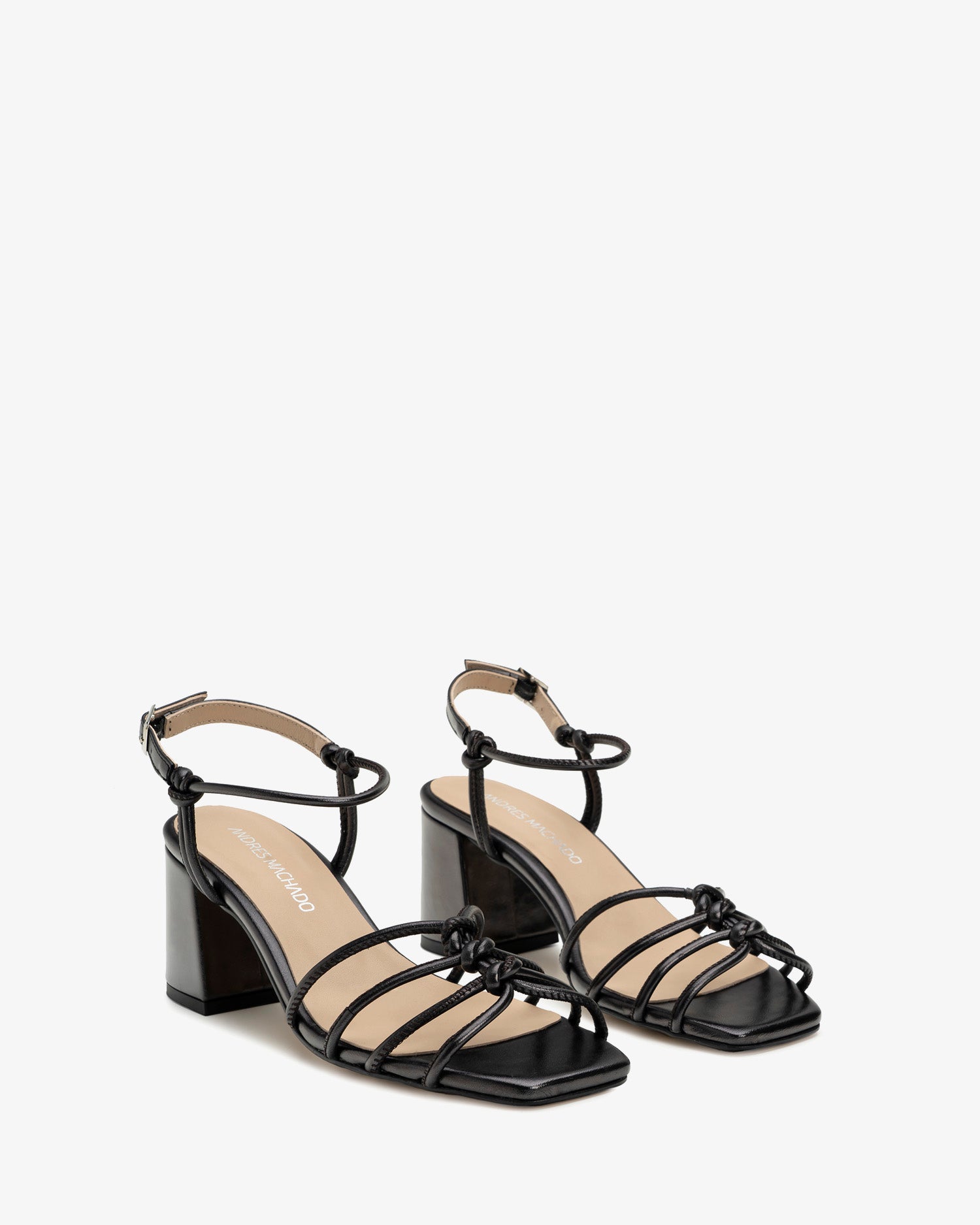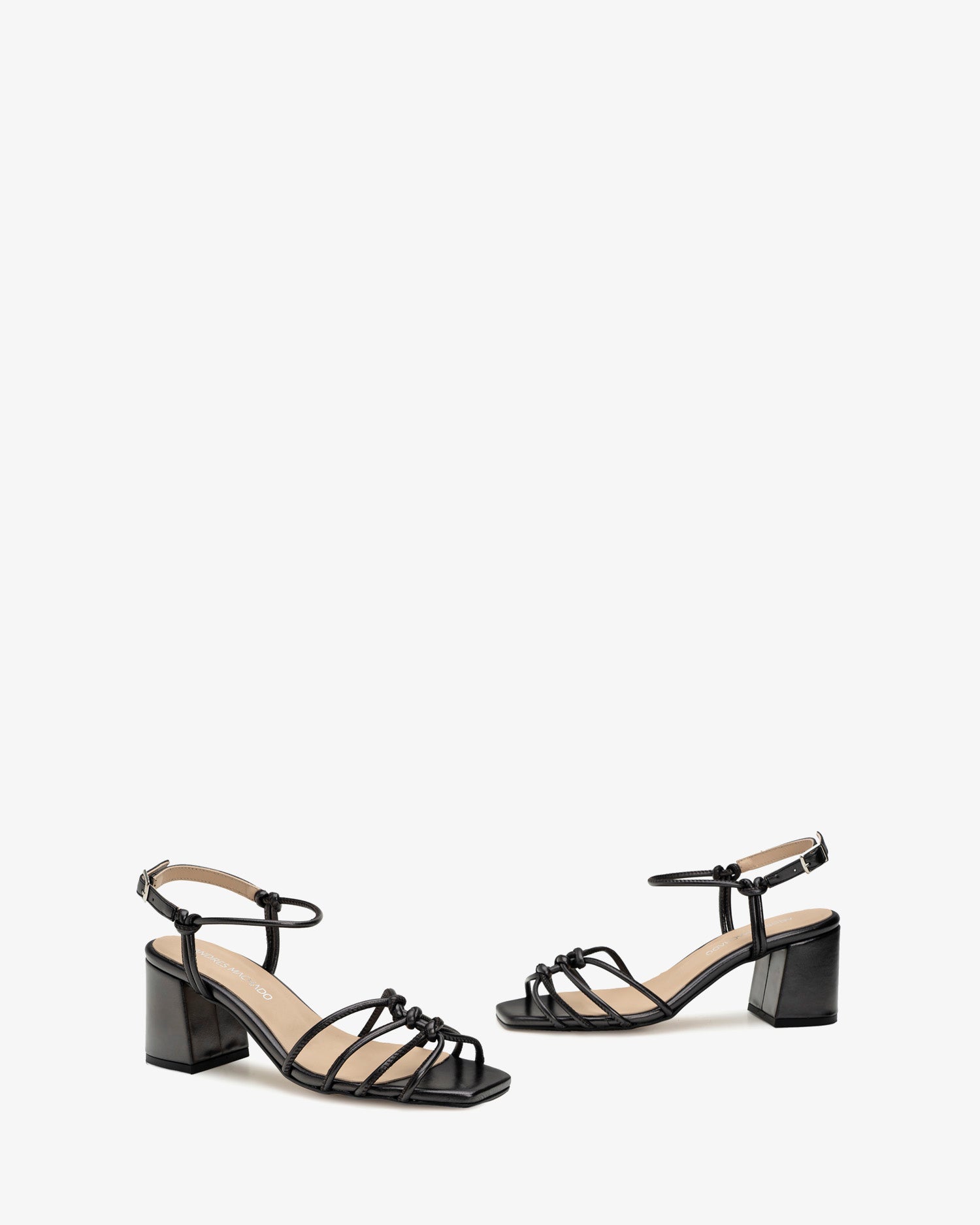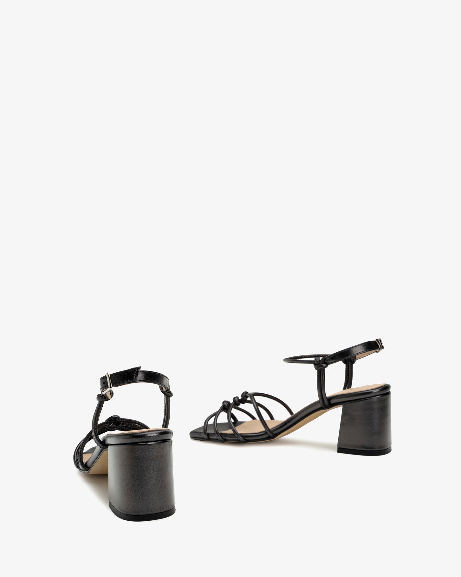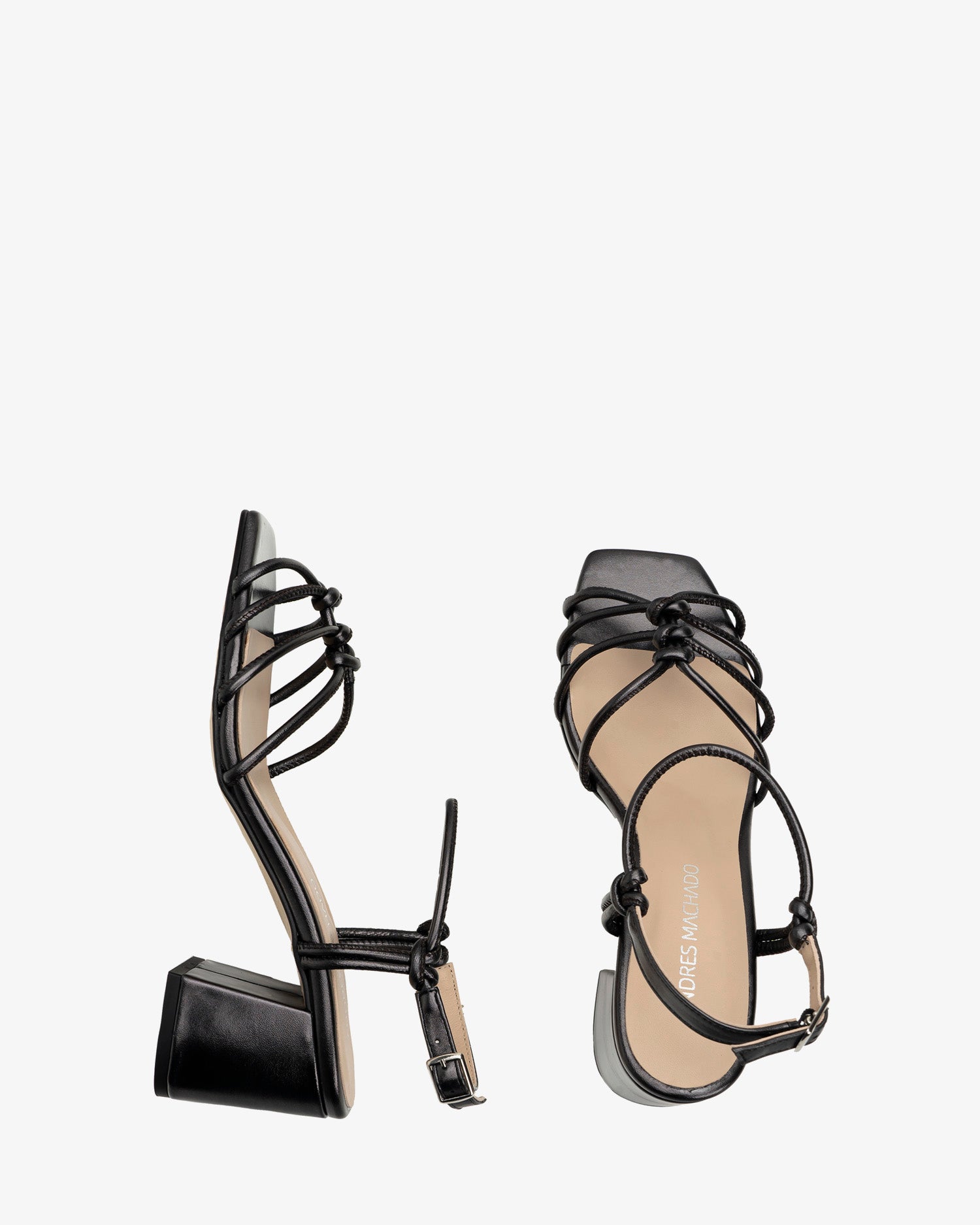 Sandalen aus metallisch schwarzem Leder. Röhrenförmiges Ton-in-Ton-Riemendesign, am Spann geknotet. Seitlicher Schnallenverschluss mit Knöchelriemen, der seitlich mit Schlauchbändern gebunden wird. Breiter Absatz im gleichen Ton gefüttert. Verfügbare Größen von 32 bis 35. 6 cm Absatz für kleine Größen von 32 bis 35. 6,5 cm Absatz für mittlere Größen von 36 bis 39. 7 cm Absatz für große Größen von 40 bis 45. Hergestellt in Spanien.