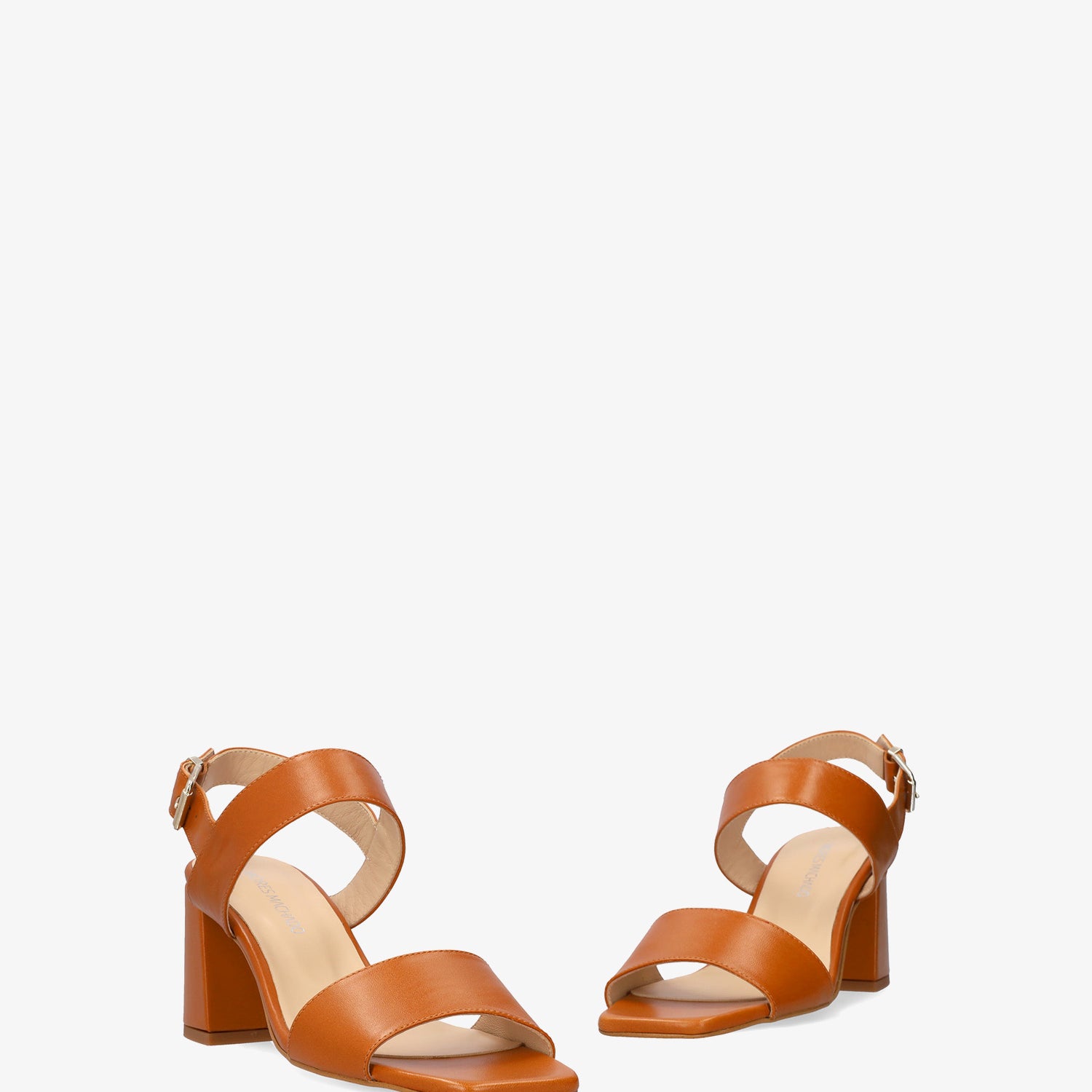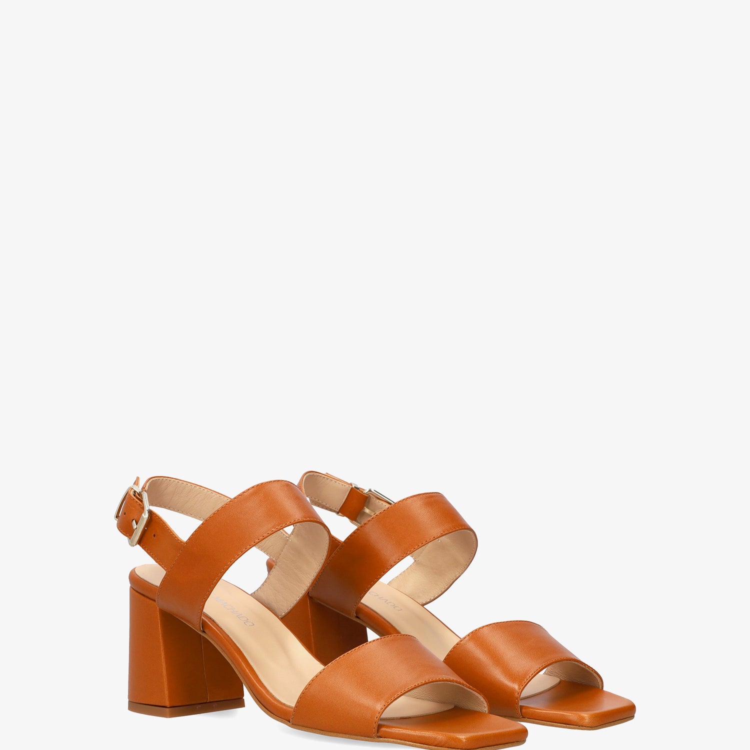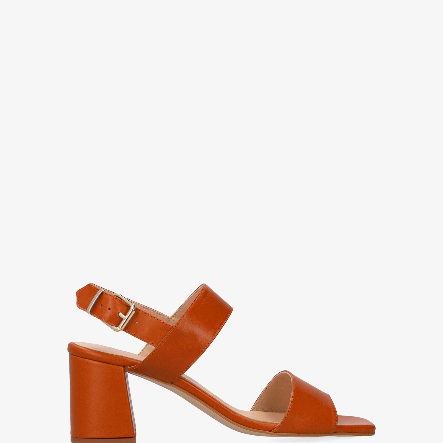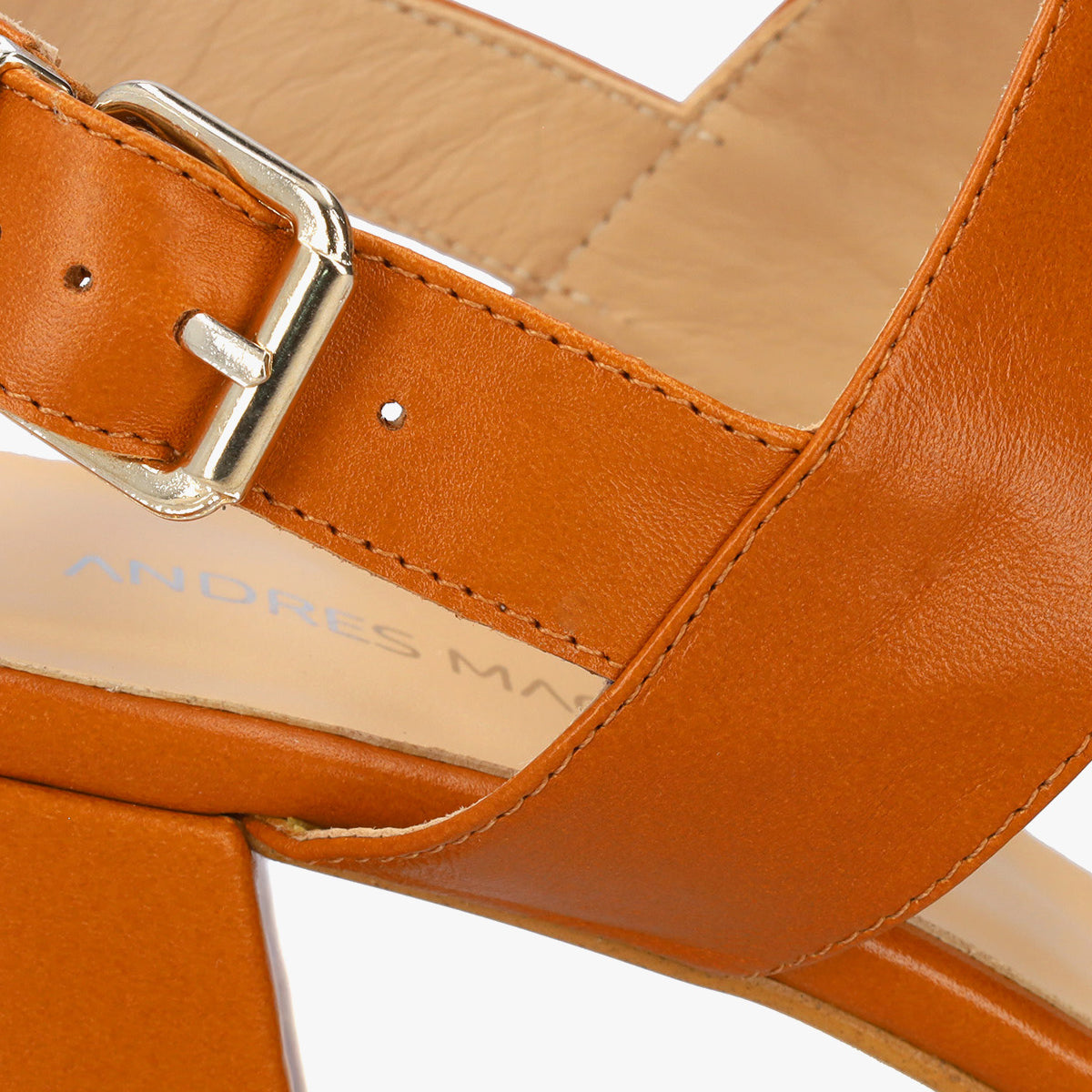 Kamelfarbene Ledersandale mit abgerundetem Absatz. Breites Riemendesign vorne und am Spann in Ton. Seitlicher Metallschnallenverschluss und quadratische, offene Zehenpartie. Innenfutter aus beigefarbenem Leder. 6,5 cm hoher, passend gefütterter Absatz für die kleinen Größen 32 bis 35. 7 cm hoher Absatz für die großen Größen 42 bis 45. Hergestellt in Spanien.