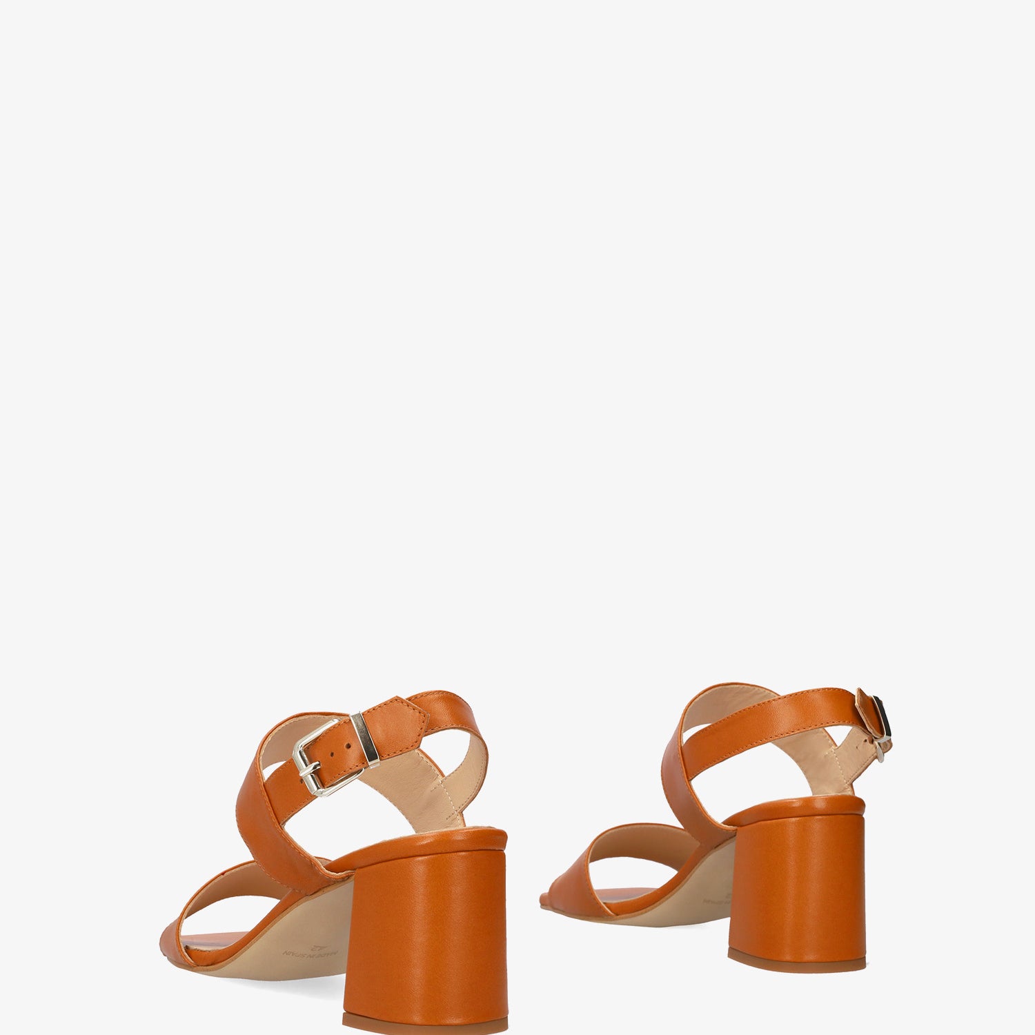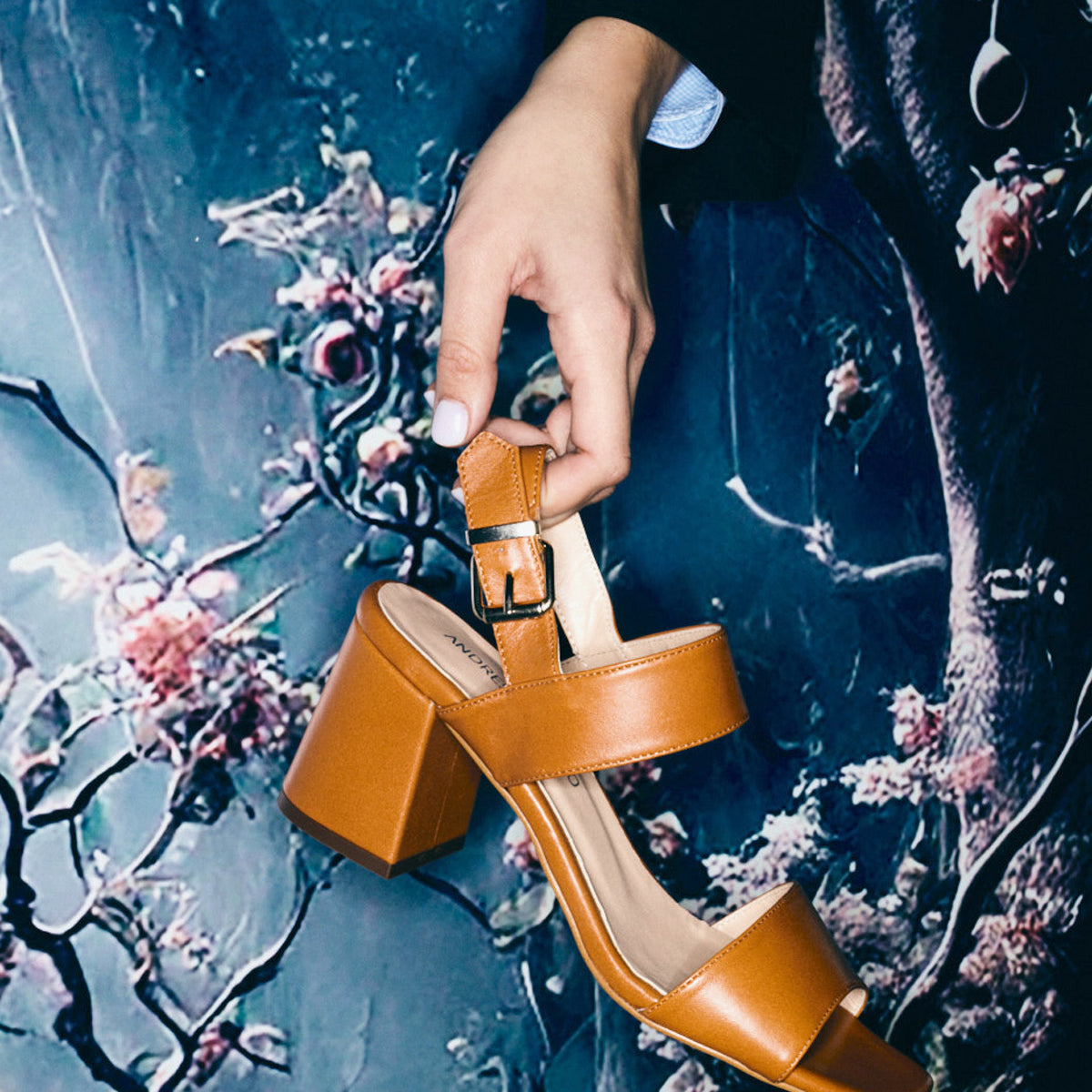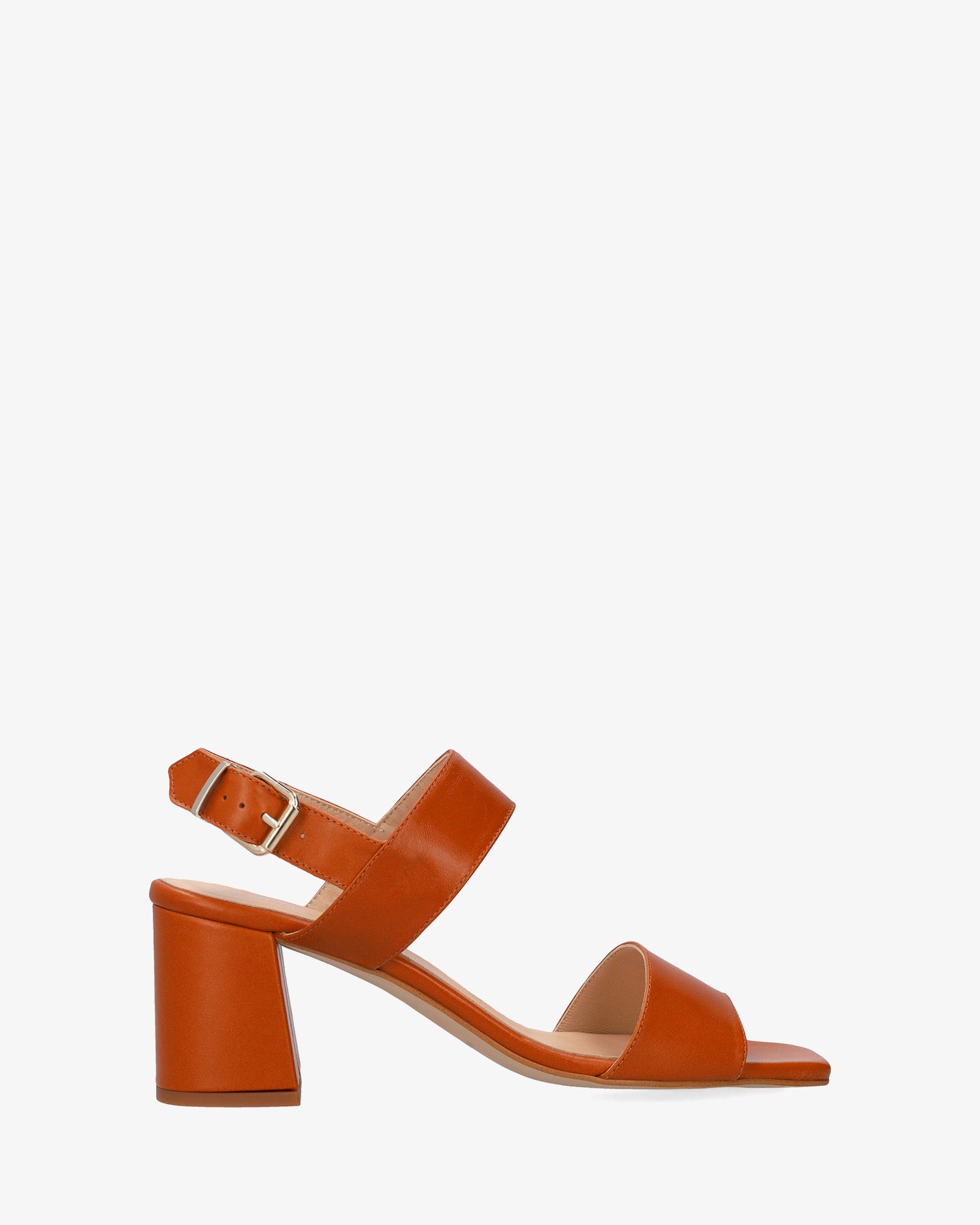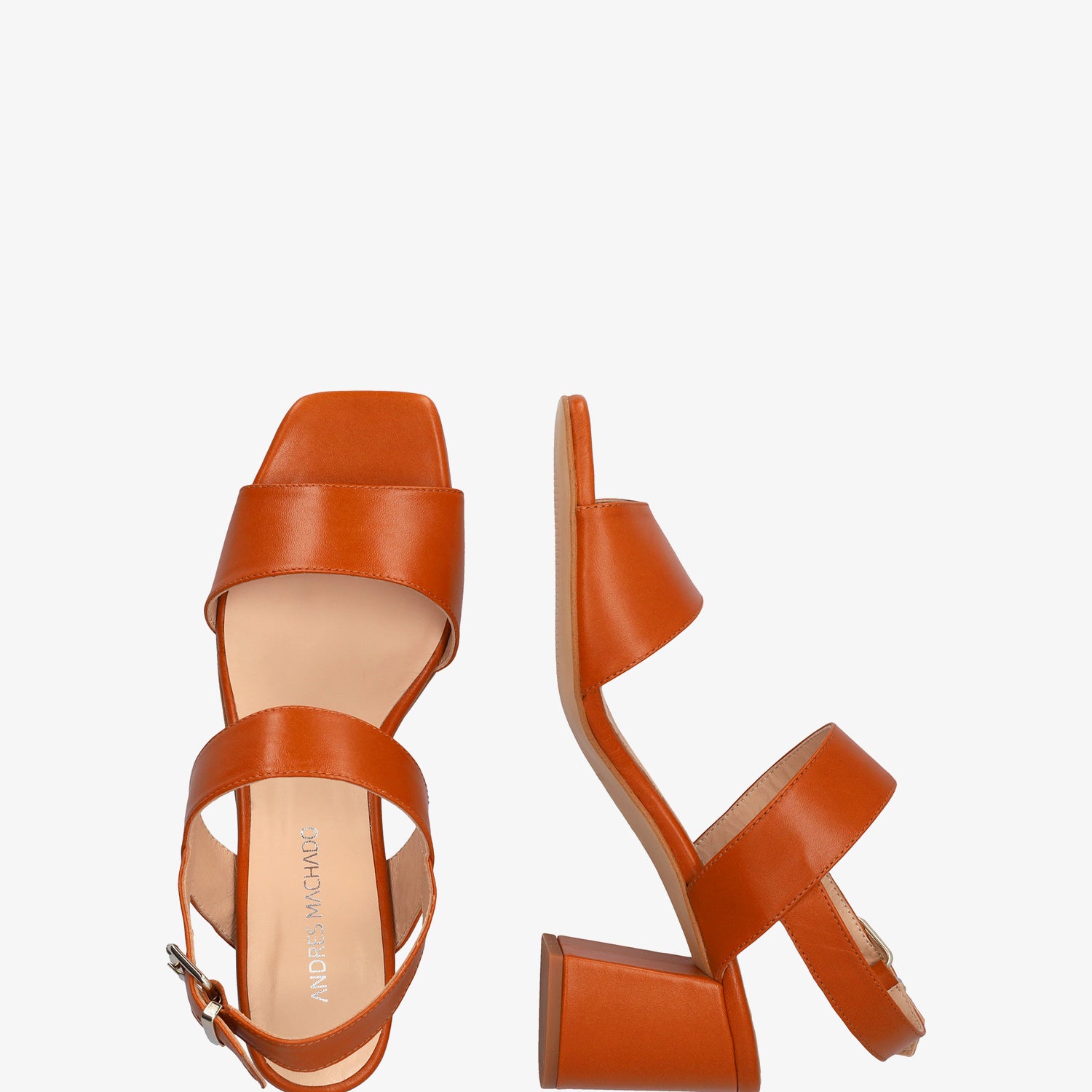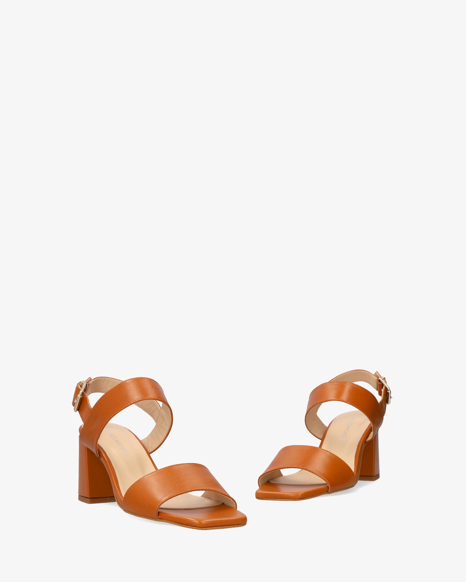 Kamelfarbene Ledersandale mit abgerundetem Absatz. Breites Riemendesign vorne und am Spann in Ton. Seitlicher Metallschnallenverschluss und quadratische, offene Zehenpartie. Innenfutter aus beigefarbenem Leder. 6,5 cm hoher, passend gefütterter Absatz für die kleinen Größen 32 bis 35. 7 cm hoher Absatz für die großen Größen 42 bis 45. Hergestellt in Spanien.