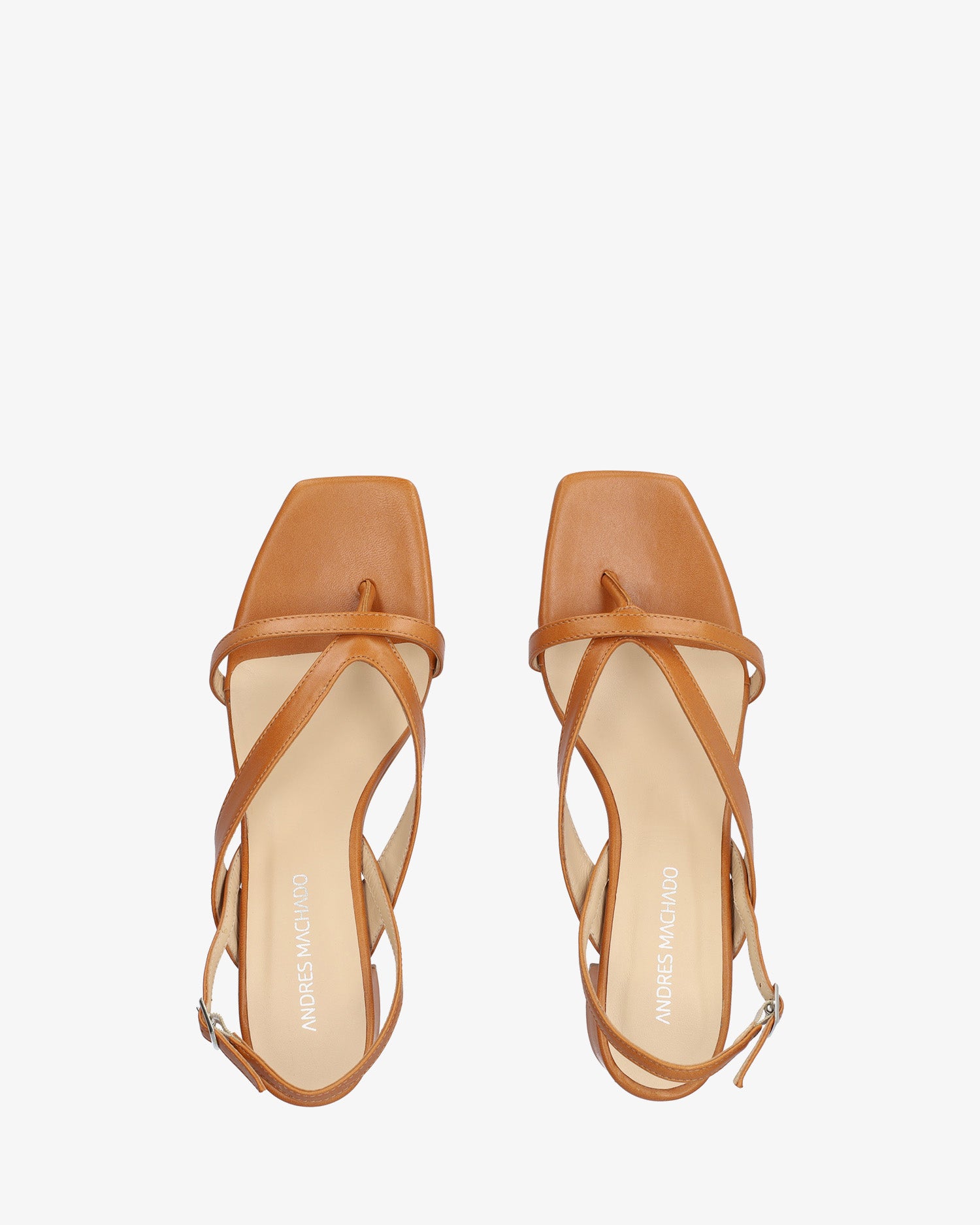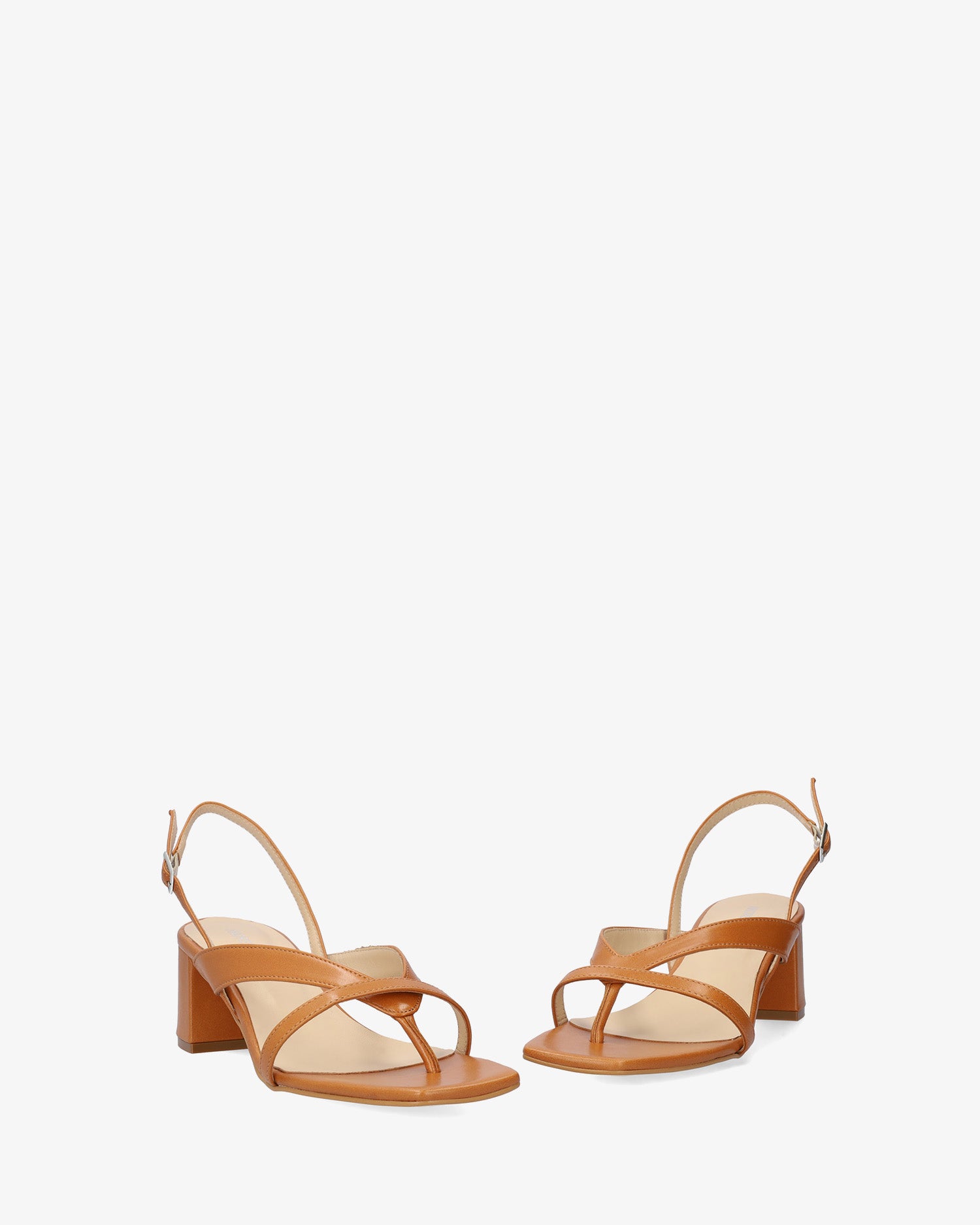 Zehensandalen aus Leder mit Absatz in Hellbraun. Dünnes Riemendesign vorne und dünne, umgekehrte V-förmige Riemen auf dem Spann in passendem Ton. Metallschnallenverschluss an der Ferse. Mit offener, quadratischer Zehenpartie. 6 cm hoher passender Absatz für die kleinen Größen 32 bis 35. 6 cm hoher Absatz für die großen Größen 42 bis 45. Hergestellt in Spanien
