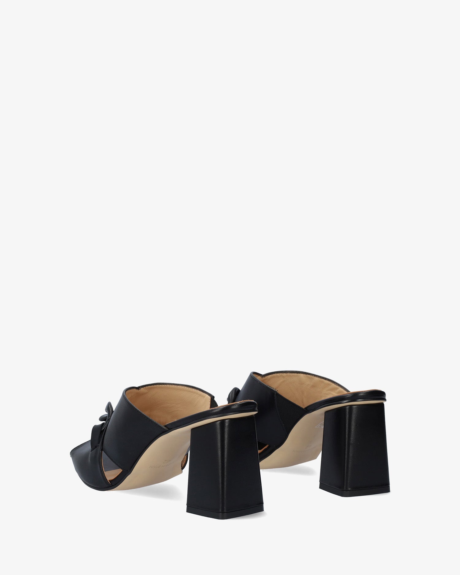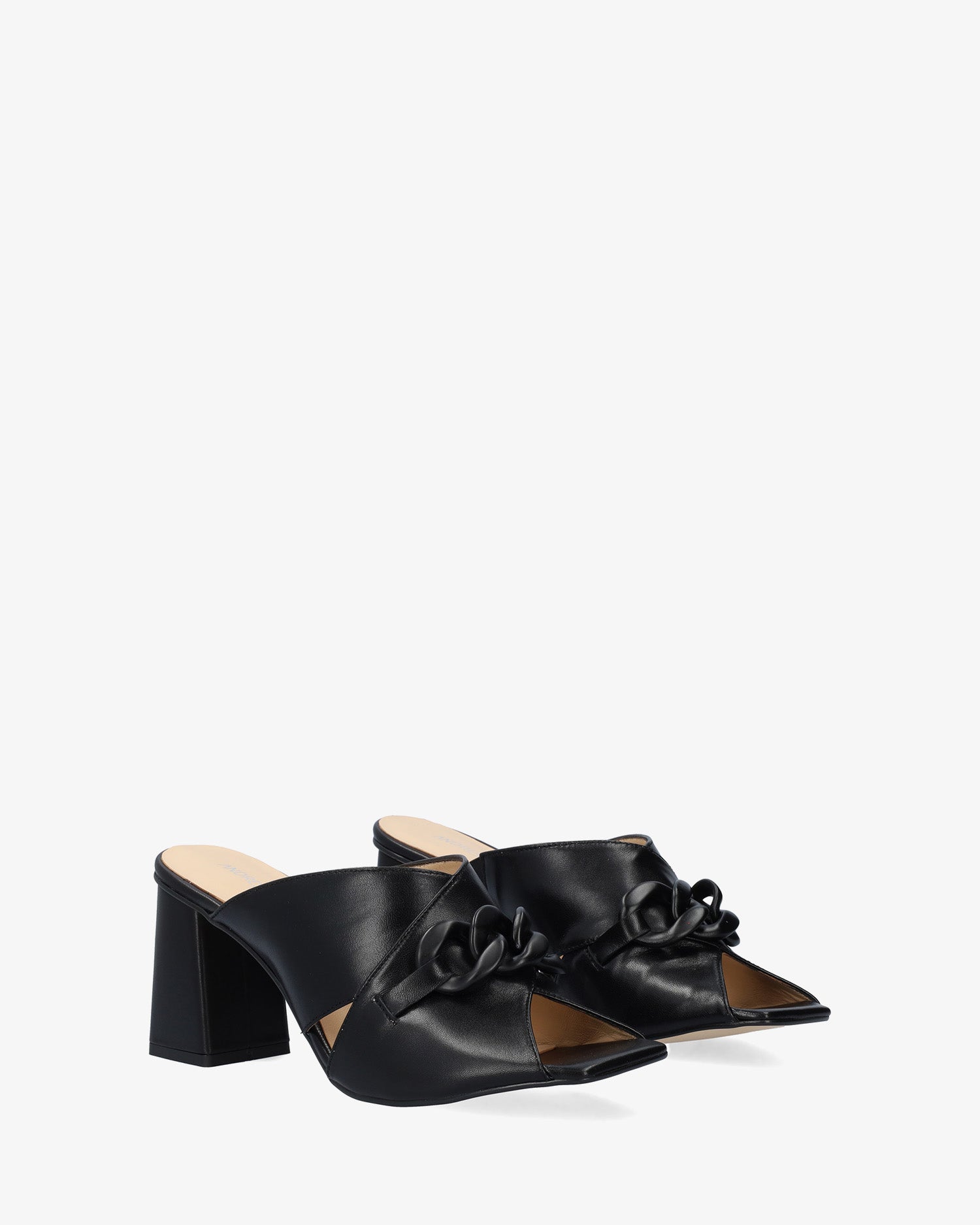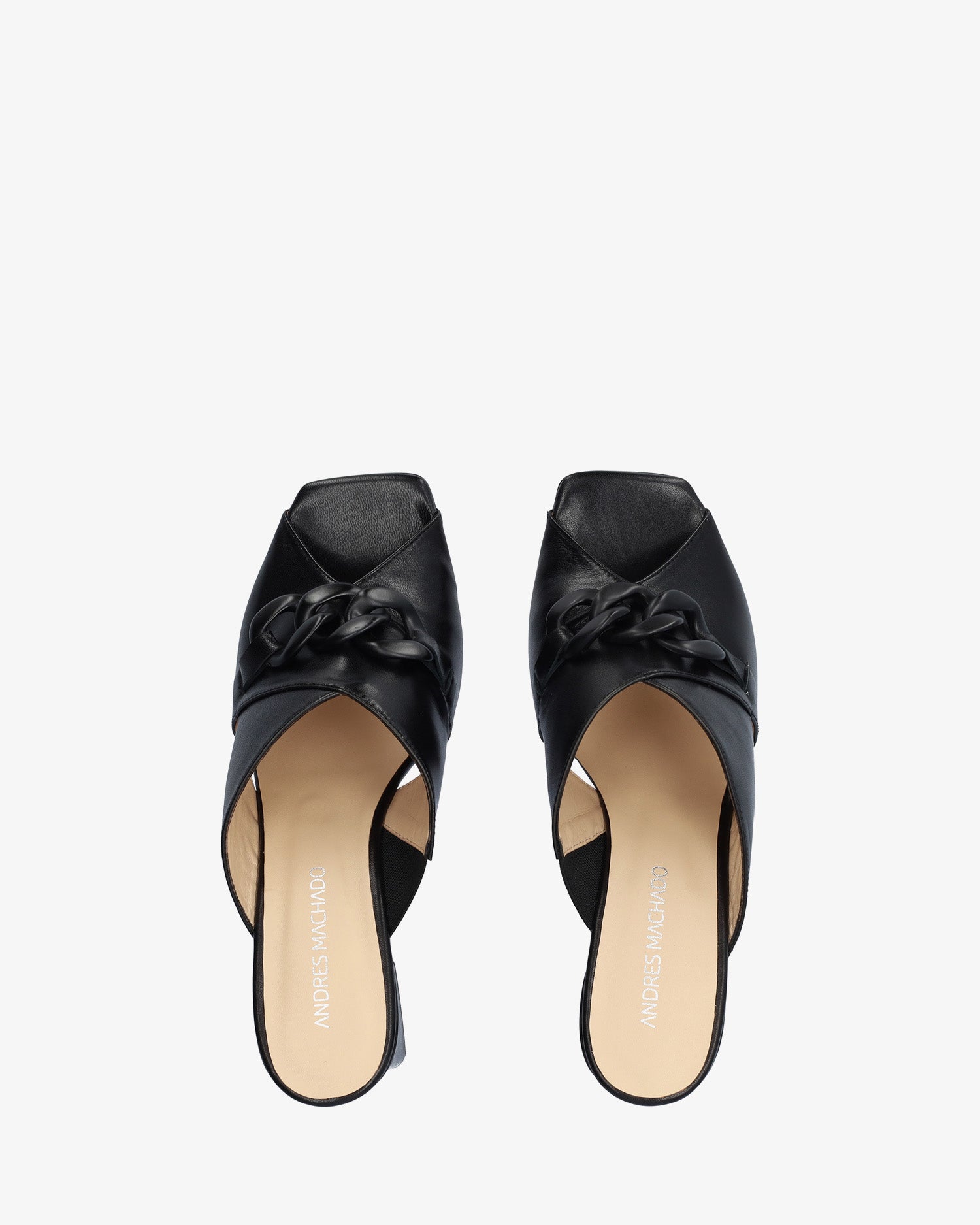 Sandalen mit quadratischem Absatz aus schwarzem Leder. Design mit zwei breiten, gekreuzten Trägern mit Maxi-Gliederketten-Detail auf dem Ton-in-Ton-Rist. Quadratische Zehenpartie. 7,5 cm hoher quadratischer Absatz in passenden Farben für die kleinen Größen 32 bis 35. 9 cm hoher Absatz für die großen Größen 42 bis 45. Hergestellt in Spanien