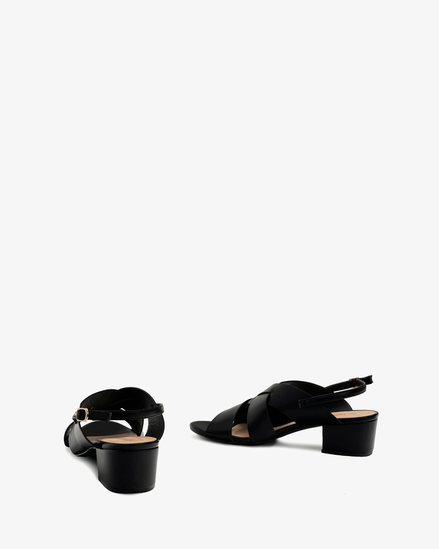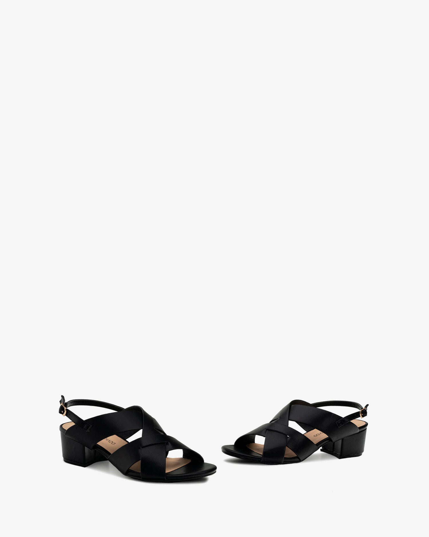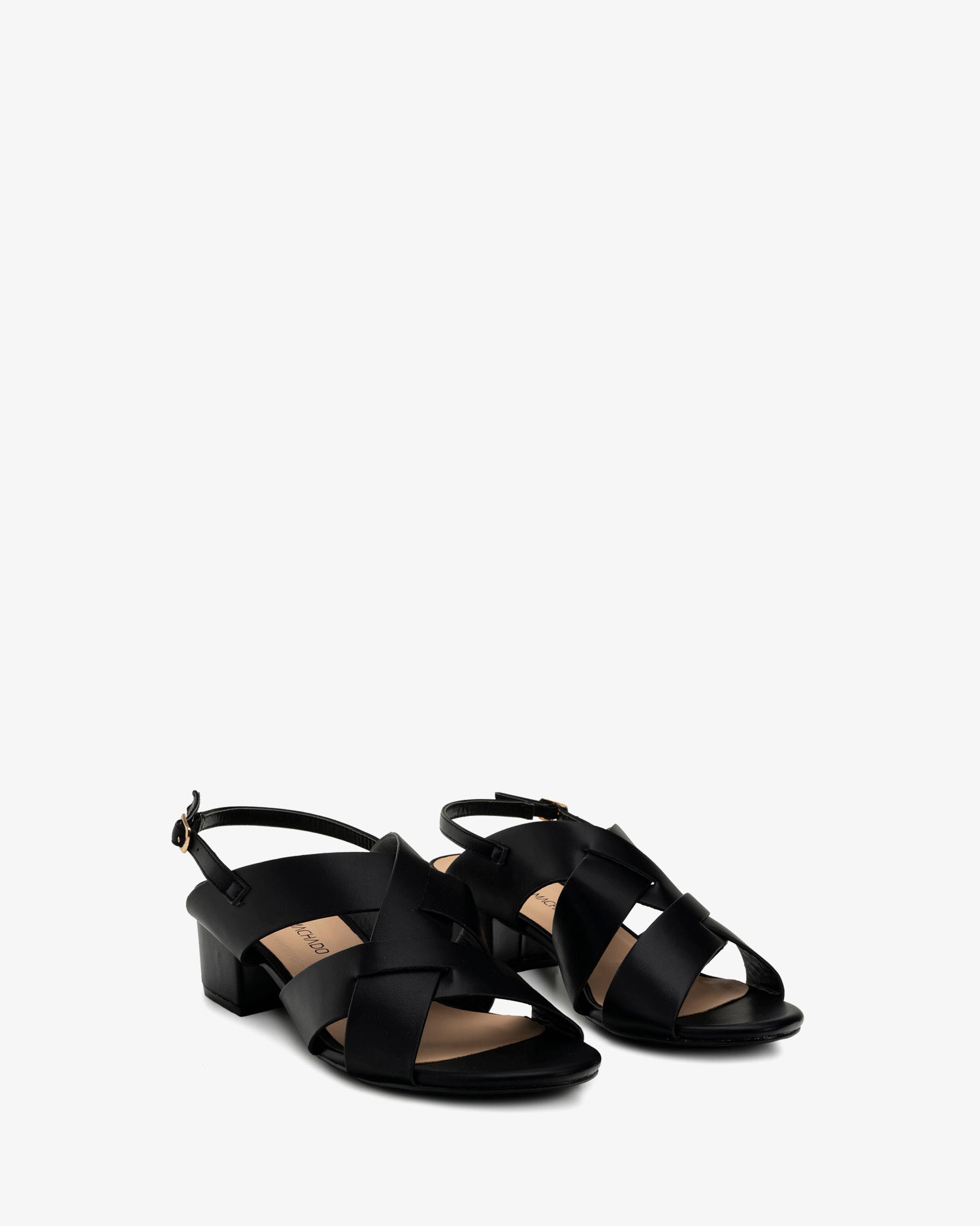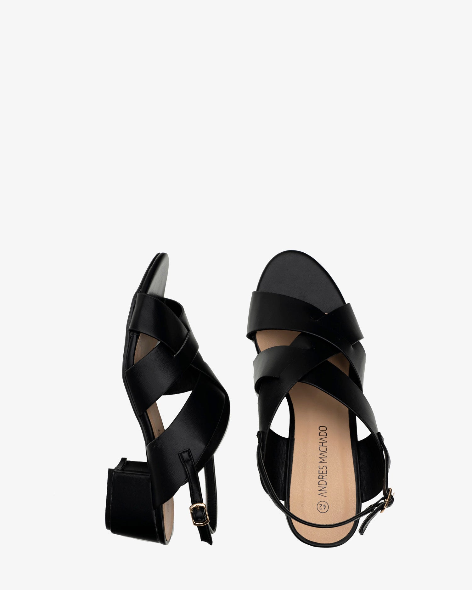 Schwarze weiche Sandalen. Design aus breiten, Ton-in-Ton-Riemen, die um den Spann herum verschlungen sind. Schnallenverschluss mit passendem Rückenriemen. Abgerundete Spitze. Offene Ferse. 4,5 cm breiter, Ton-in-Ton gefütterter Absatz bei den kleinen Größen 32 bis 35. 5 cm Absatz bei den großen Größen 42 bis 45.