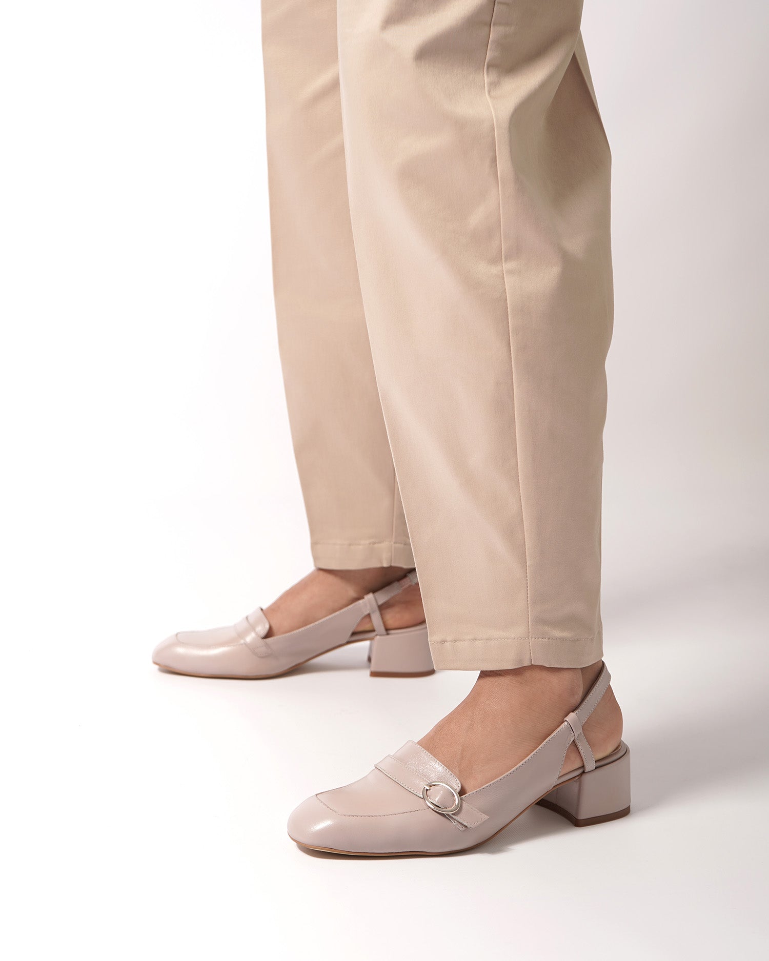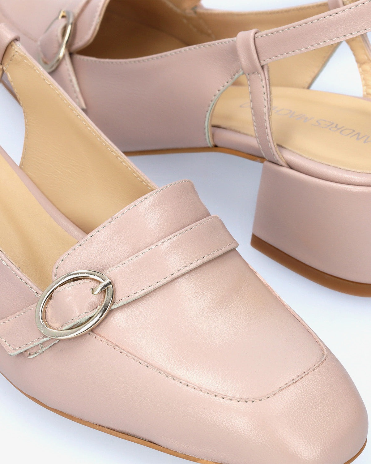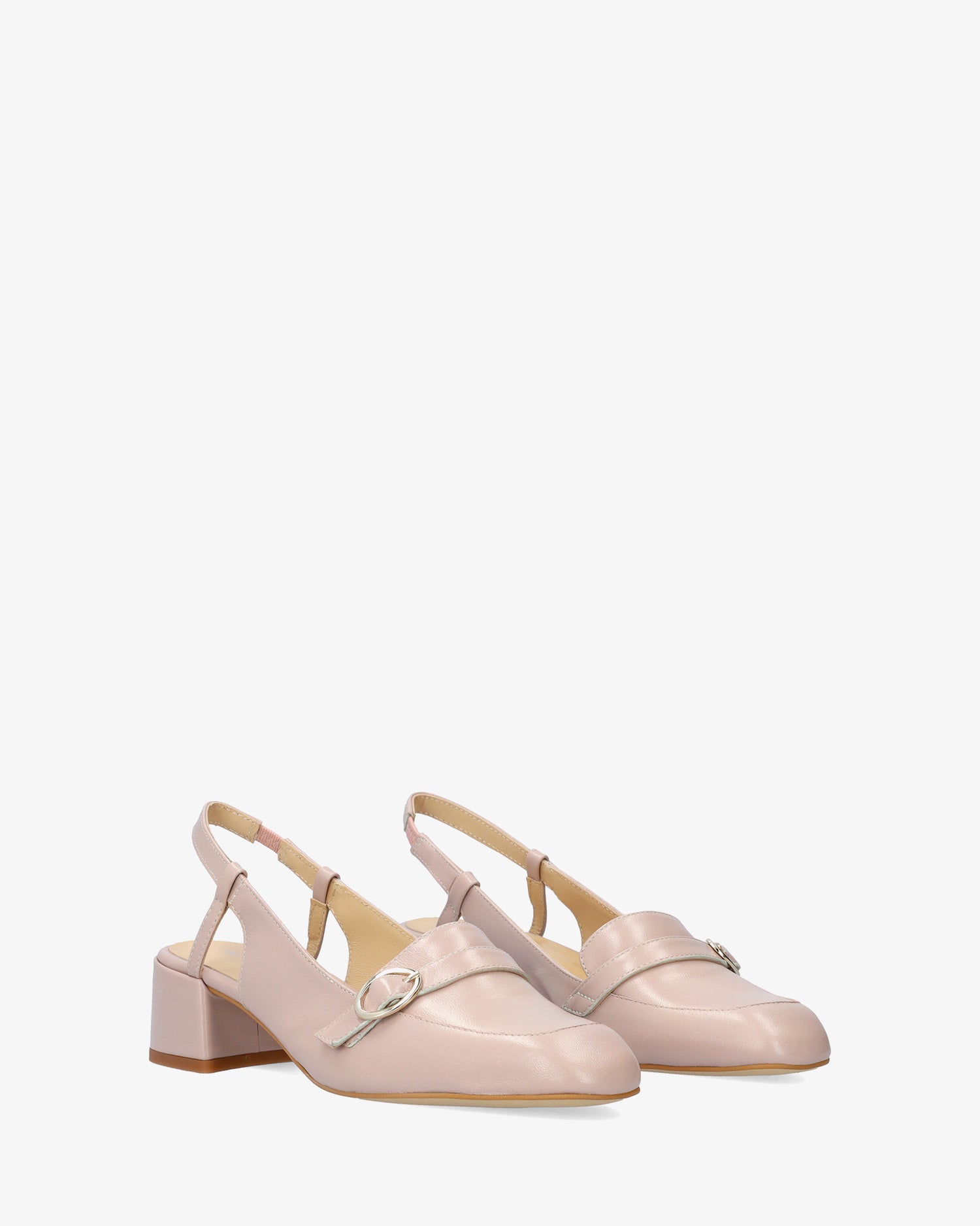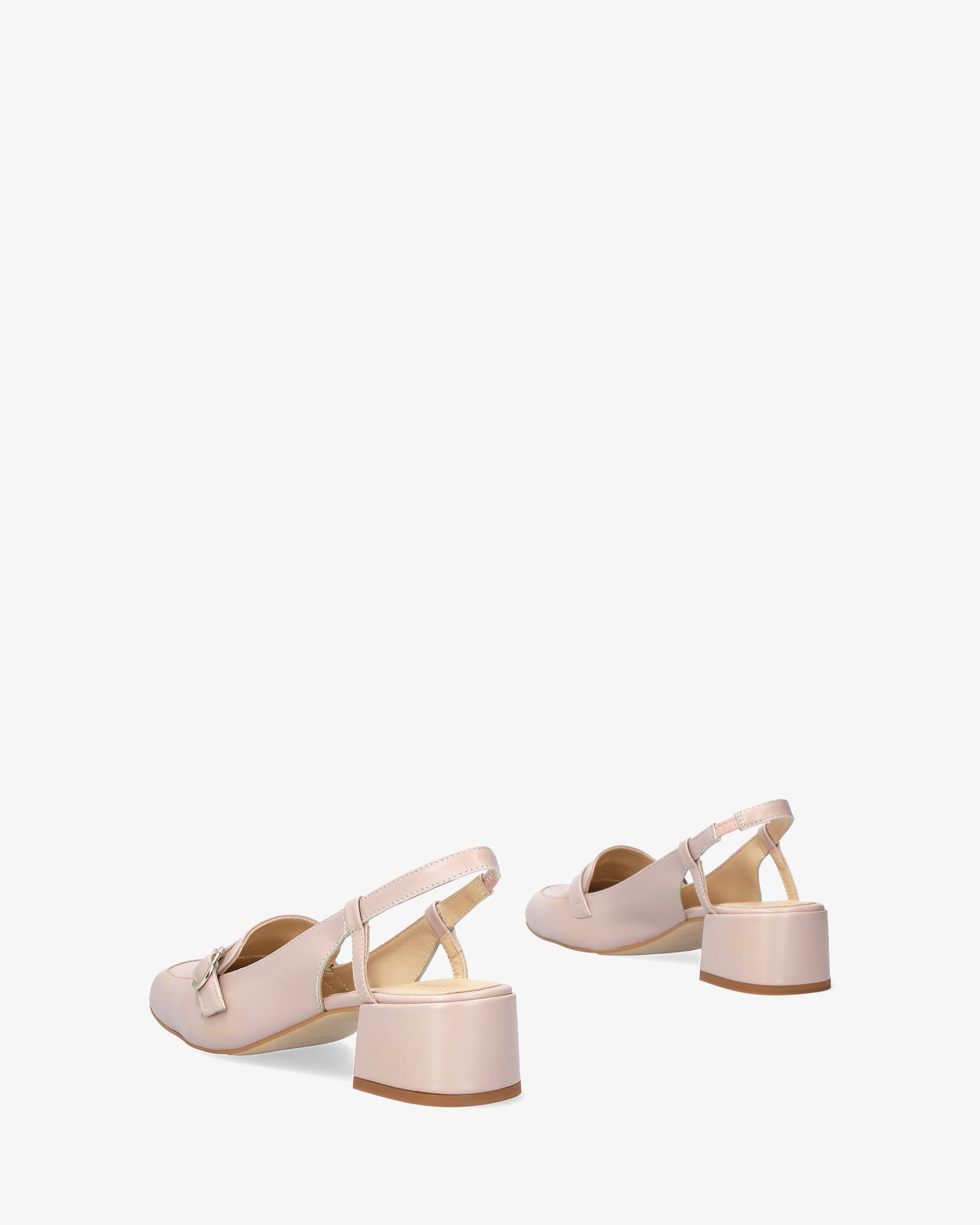 Slingback-Schuh im Mokassin-Stil mit Absatz aus glattem rosa Leder. Quadratisches Zehendesign mit dekorativem Riemendetail mit Metallschnalle auf dem Spann. Dekorative Steppnaht mit passendem Garn an der Spitze. Elastischer Knöchelriemen in passender Farbe für zusätzlichen Halt. Innenfutter aus beigefarbenem Leder. 4,5 cm gefütterter Blockabsatz in passenden Farben für die kleinen Größen 32 bis 35 und 5 cm für die großen Größen 42 bis 45. Hergestellt in Spanien.