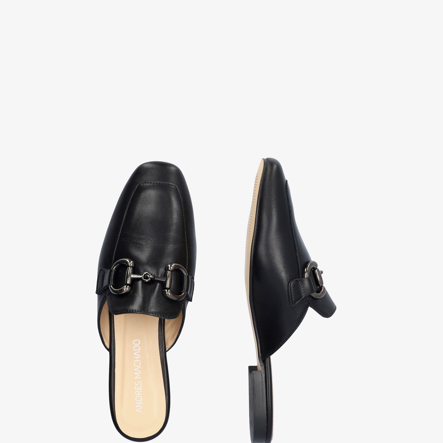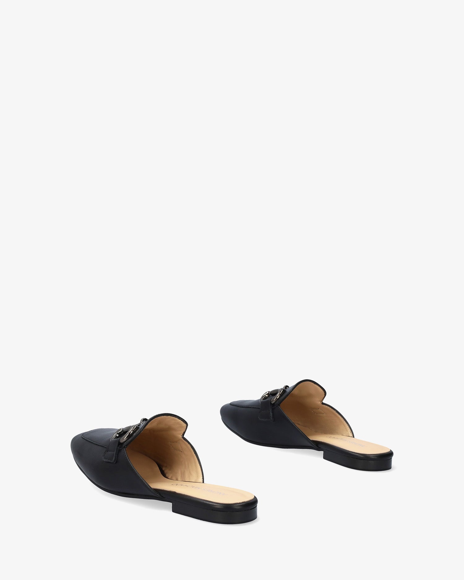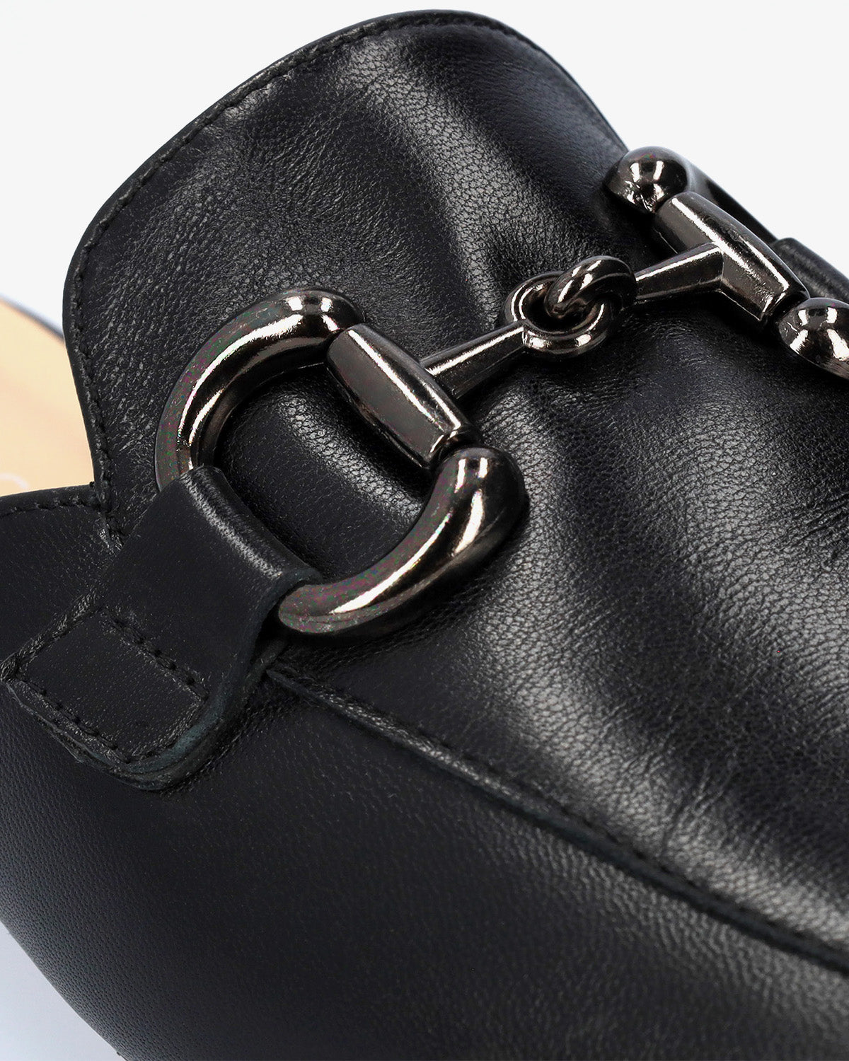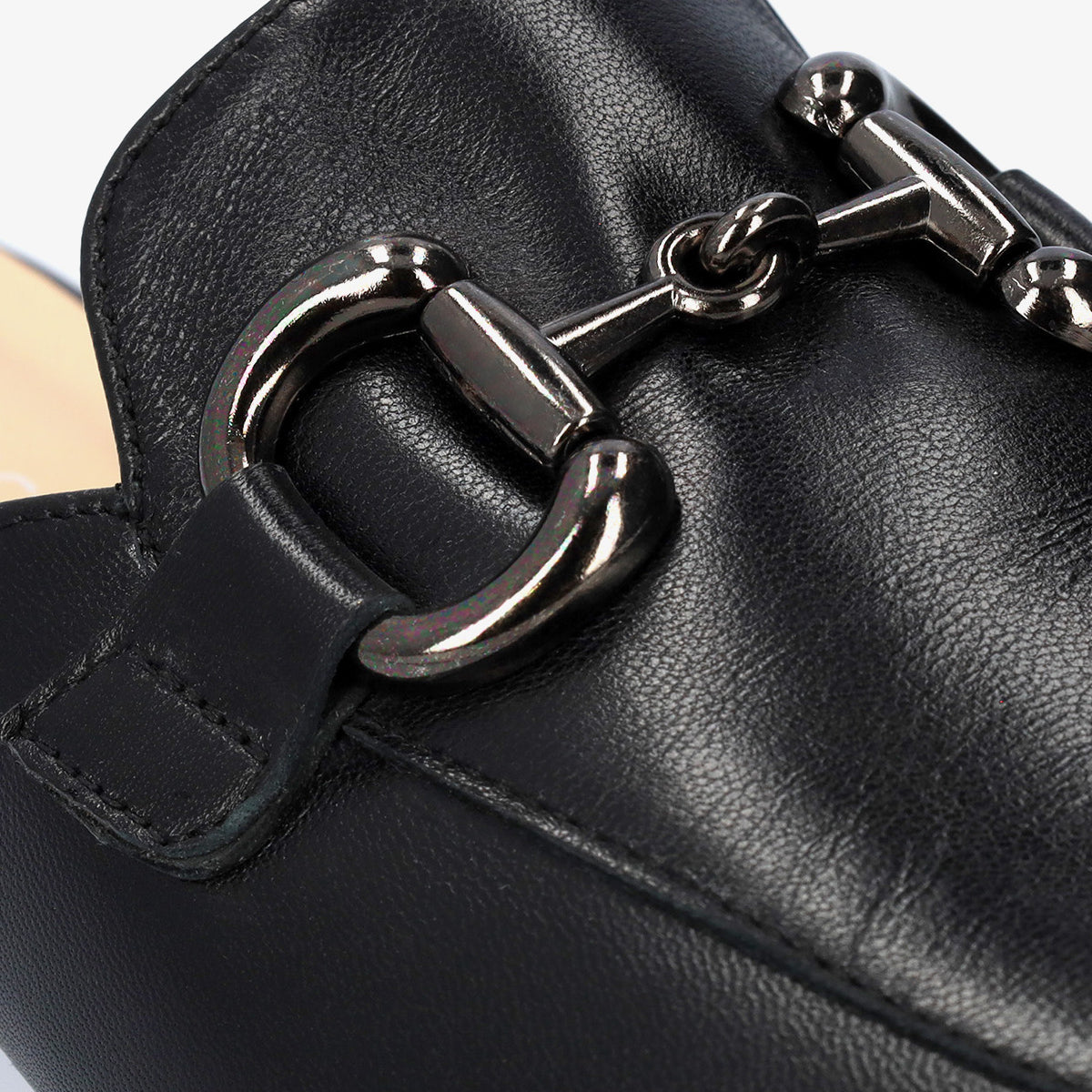 Schwarzer Mokassin-Schuh aus glattem Leder ohne Fersenpartie. Quadratisches Zehendesign mit antikgrauer Metallschnalle auf dem Vorderblatt. Dekorative Steppnaht mit passendem Garn an der Spitze. Innenfutter aus beigefarbenem Leder. Ton in Ton gefütterter Blockabsatz für die kleinen Größen 32 bis 35 und für die großen Größen 42 bis 45. Hergestellt in Spanien.