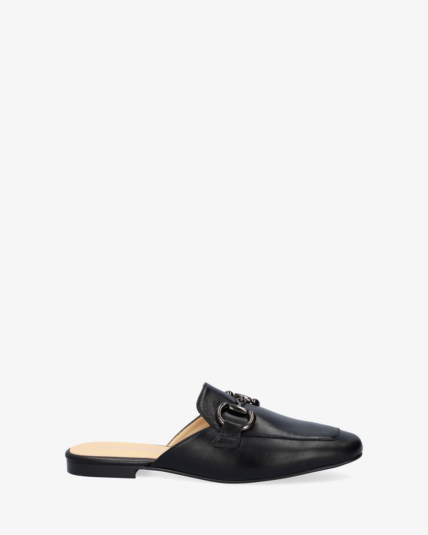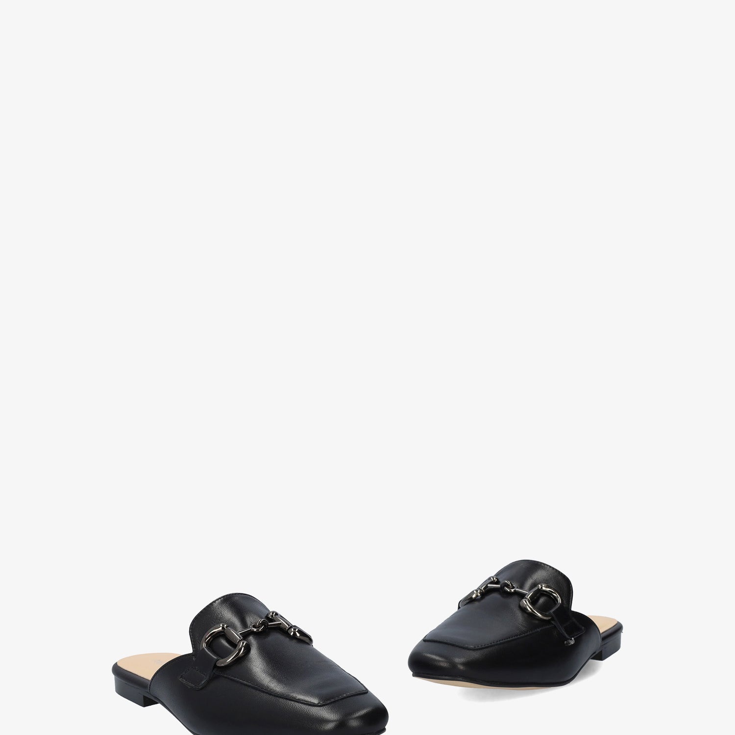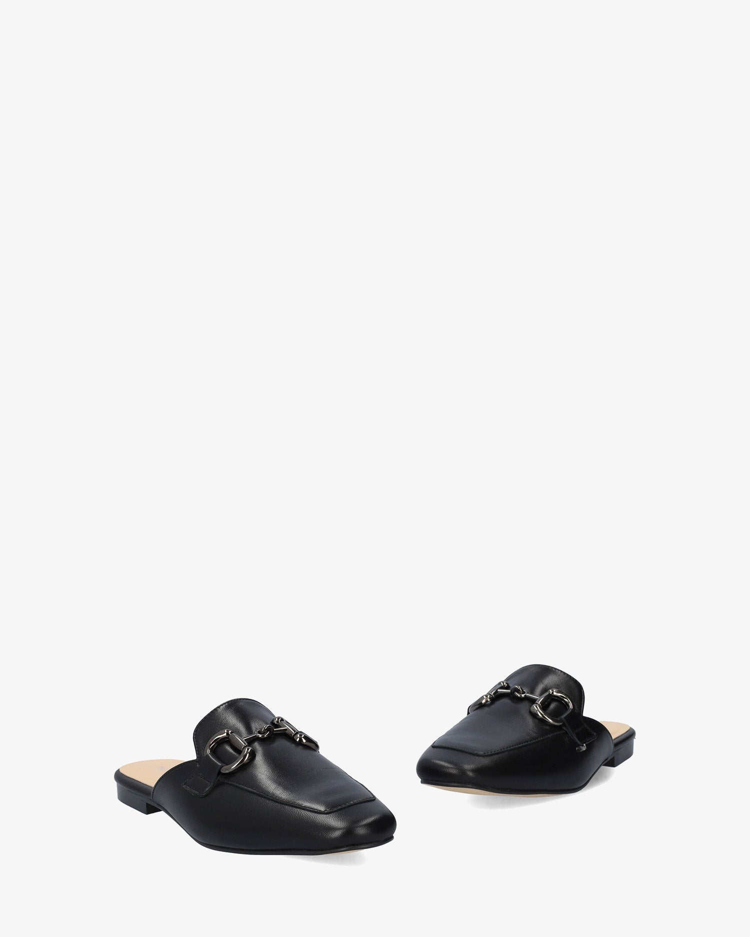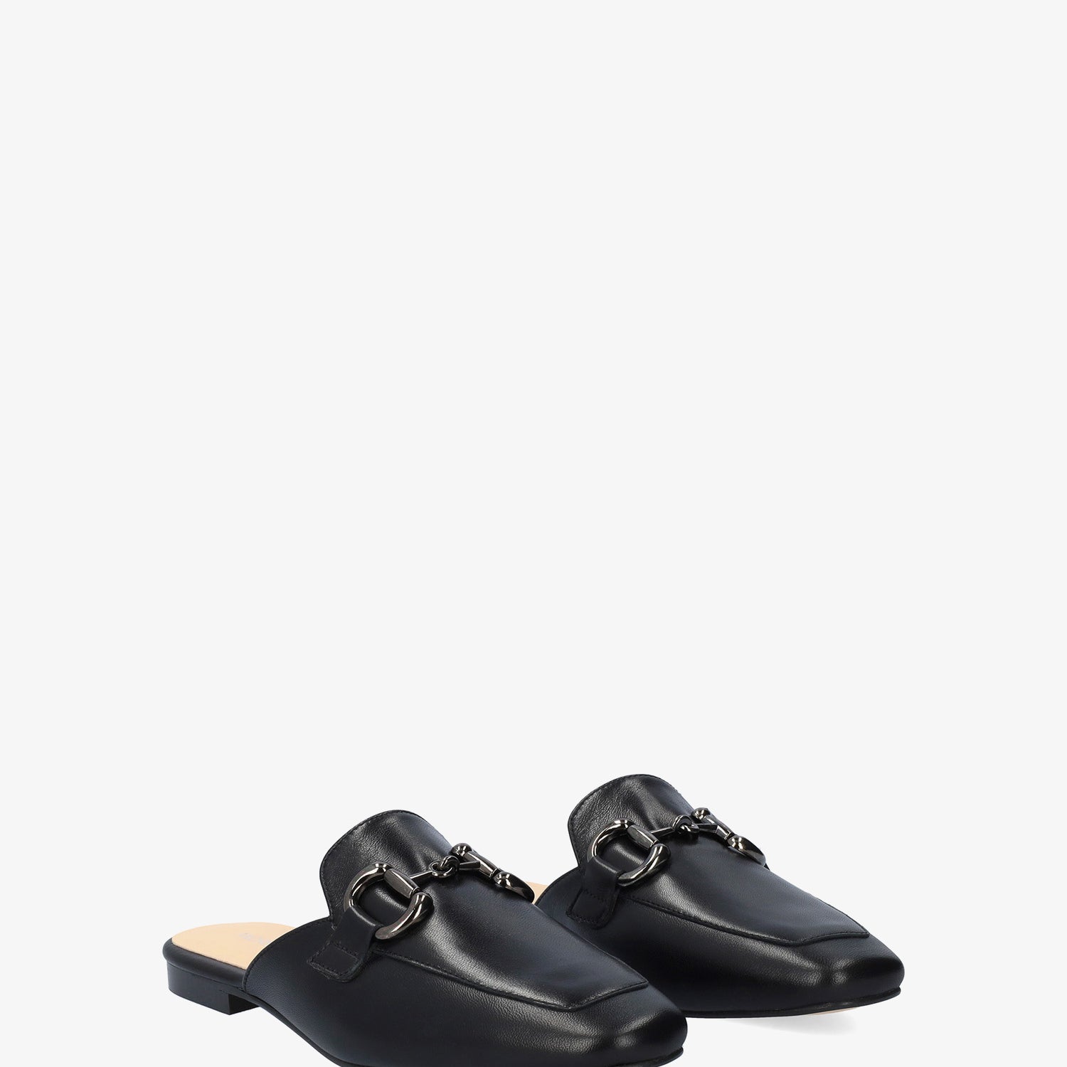 Schwarzer Mokassin-Schuh aus glattem Leder ohne Fersenpartie. Quadratisches Zehendesign mit antikgrauer Metallschnalle auf dem Vorderblatt. Dekorative Steppnaht mit passendem Garn an der Spitze. Innenfutter aus beigefarbenem Leder. Ton in Ton gefütterter Blockabsatz für die kleinen Größen 32 bis 35 und für die großen Größen 42 bis 45. Hergestellt in Spanien.