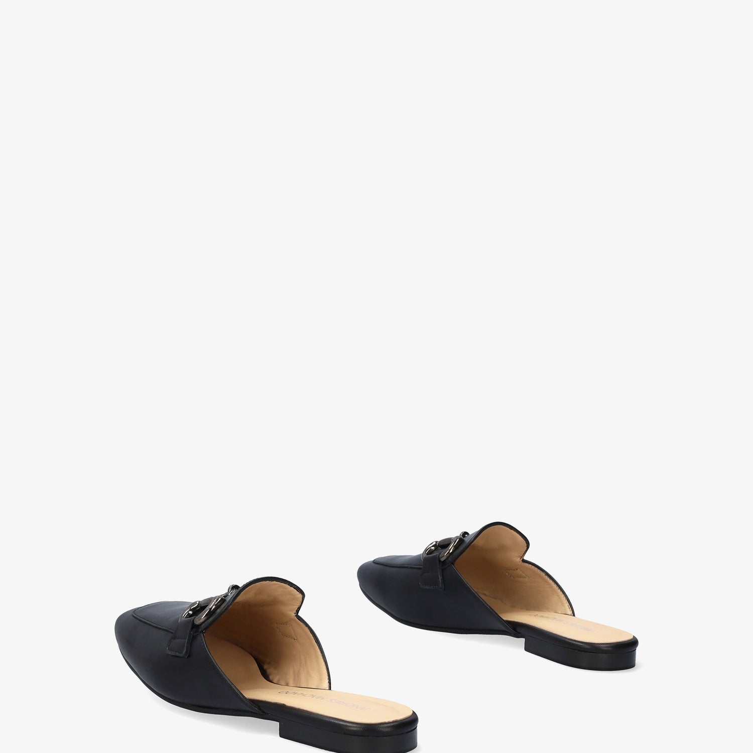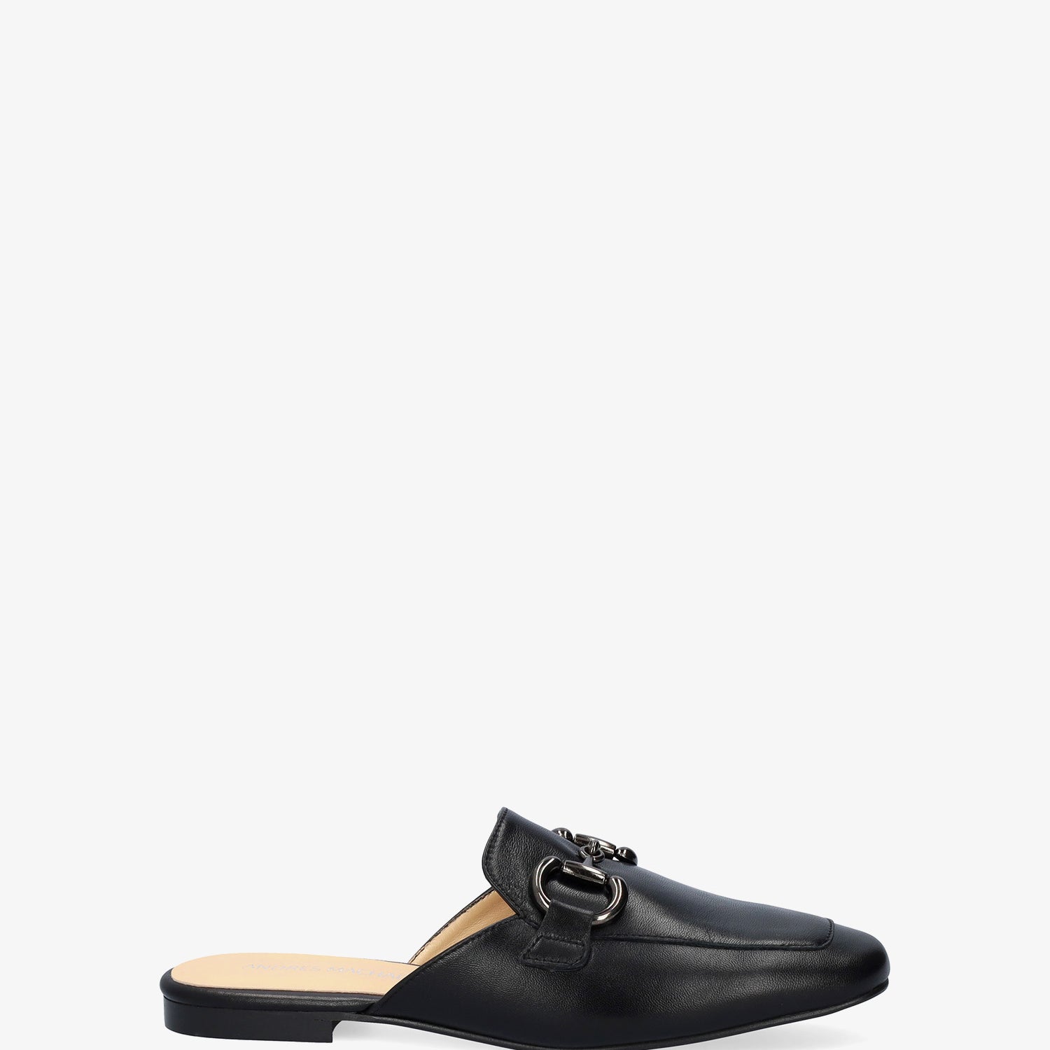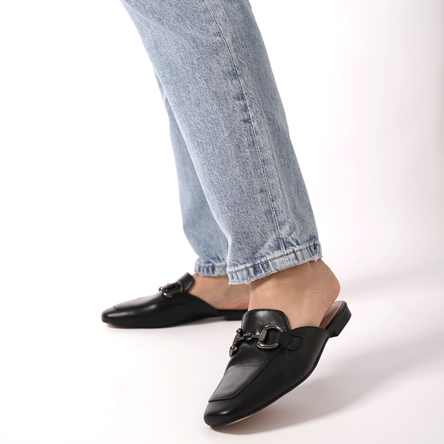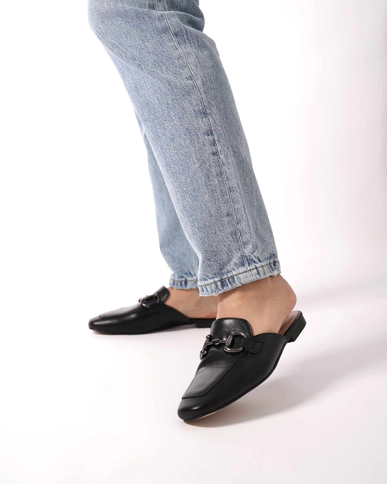 Schwarzer Mokassin-Schuh aus glattem Leder ohne Fersenpartie. Quadratisches Zehendesign mit antikgrauer Metallschnalle auf dem Vorderblatt. Dekorative Steppnaht mit passendem Garn an der Spitze. Innenfutter aus beigefarbenem Leder. Ton in Ton gefütterter Blockabsatz für die kleinen Größen 32 bis 35 und für die großen Größen 42 bis 45. Hergestellt in Spanien.