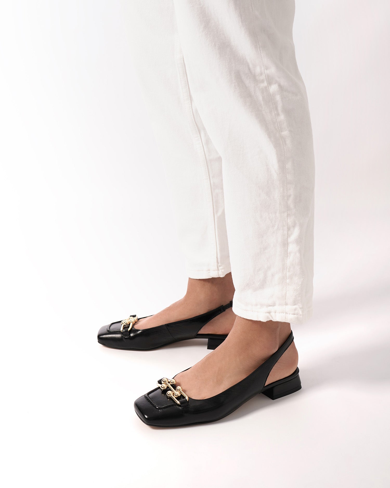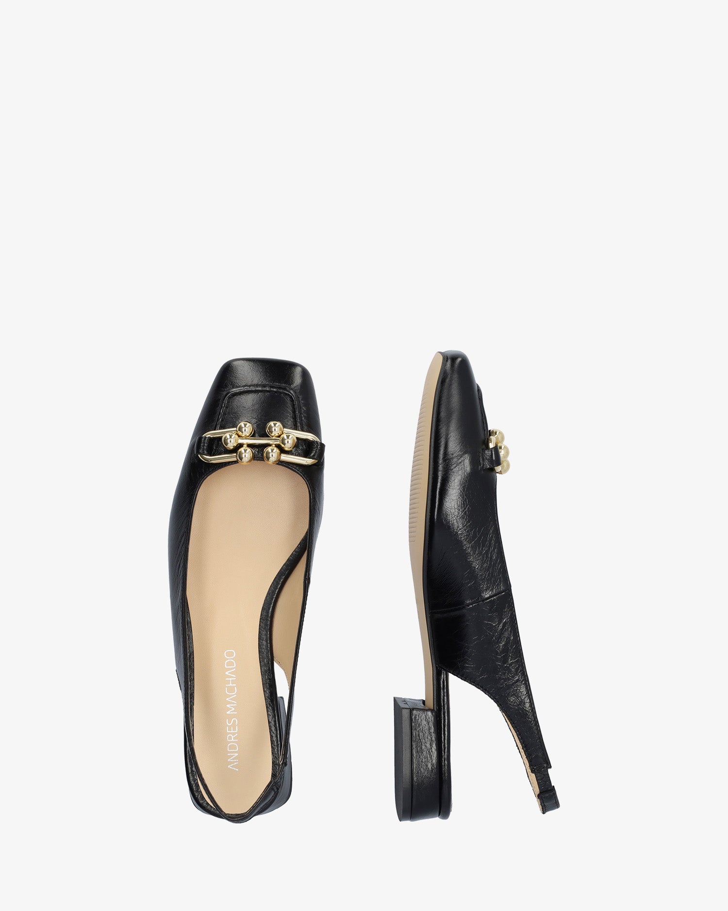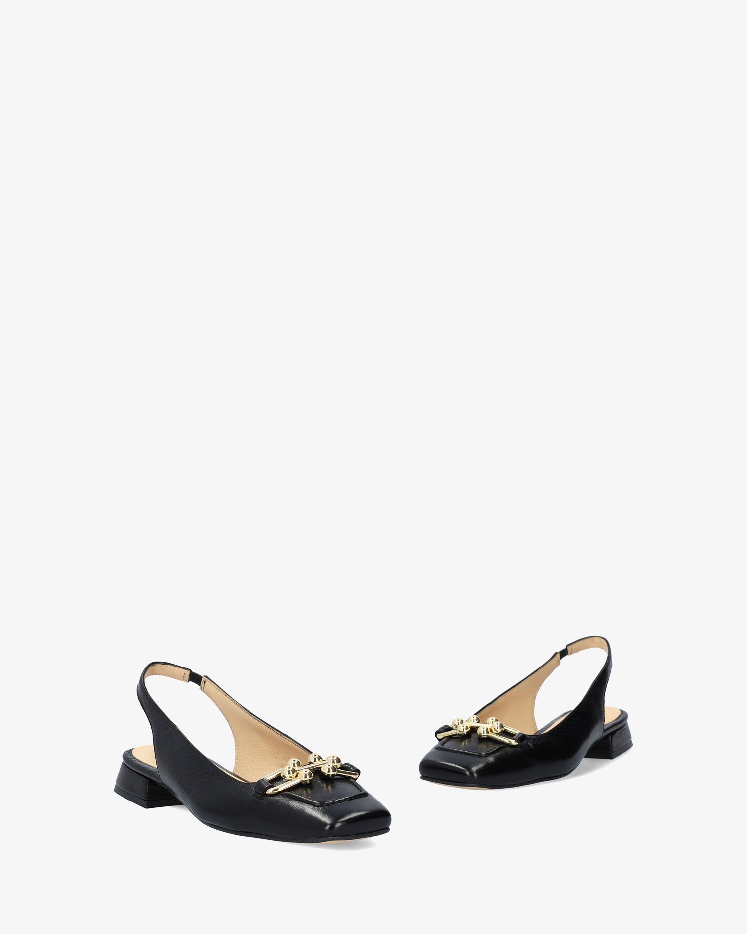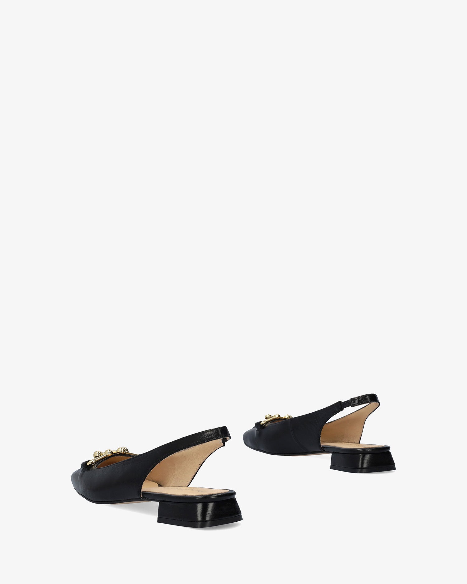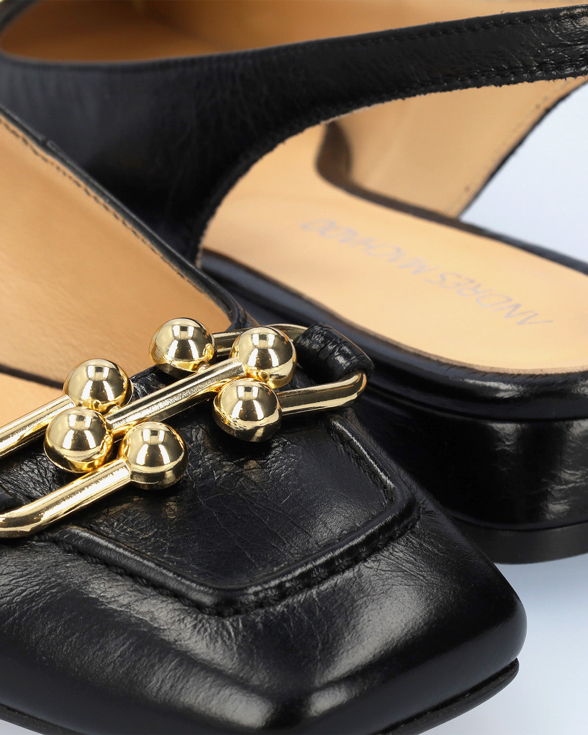 Schwarzer Mokassin-Schuh aus glattem Leder ohne Fersenpartie. Quadratisches Zehendesign mit goldenen Perlendetails und Metallschnalle vorne. Dekorative Steppnaht mit passendem Garn an der Spitze. Elastischer Knöchelriemen in passender Farbe für zusätzlichen Halt. Innenfutter aus beigefarbenem Leder. 2,5 cm gefütterter Blockabsatz in passenden Farben für die kleinen Größen 32 bis 35 und 3 cm für die großen Größen 42 bis 45. Hergestellt in Spanien.