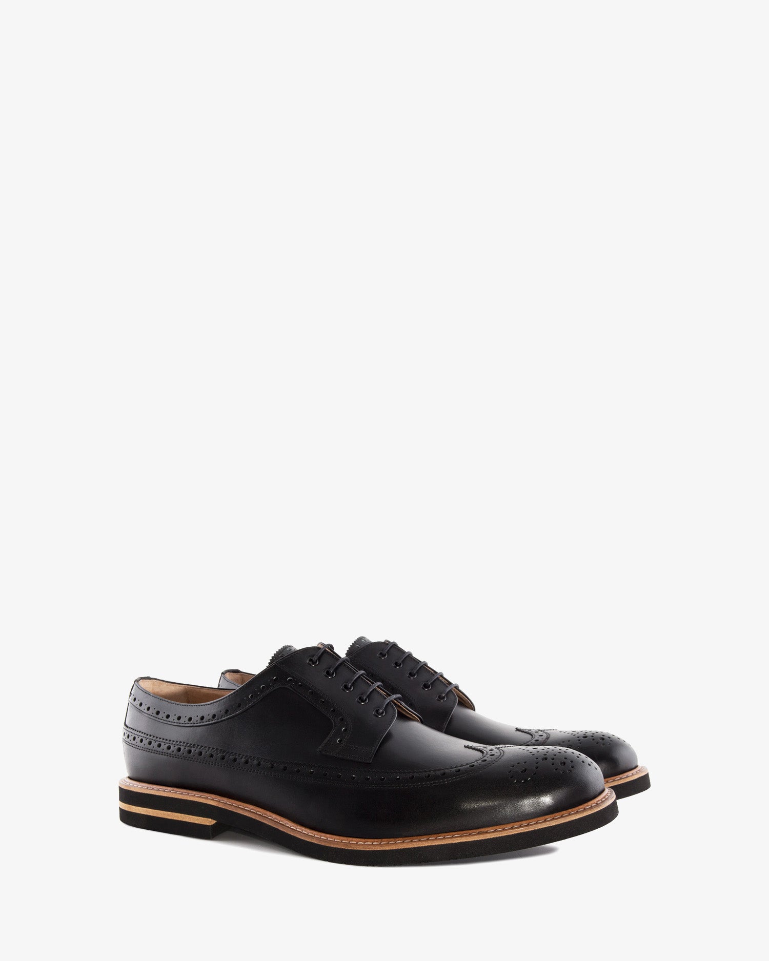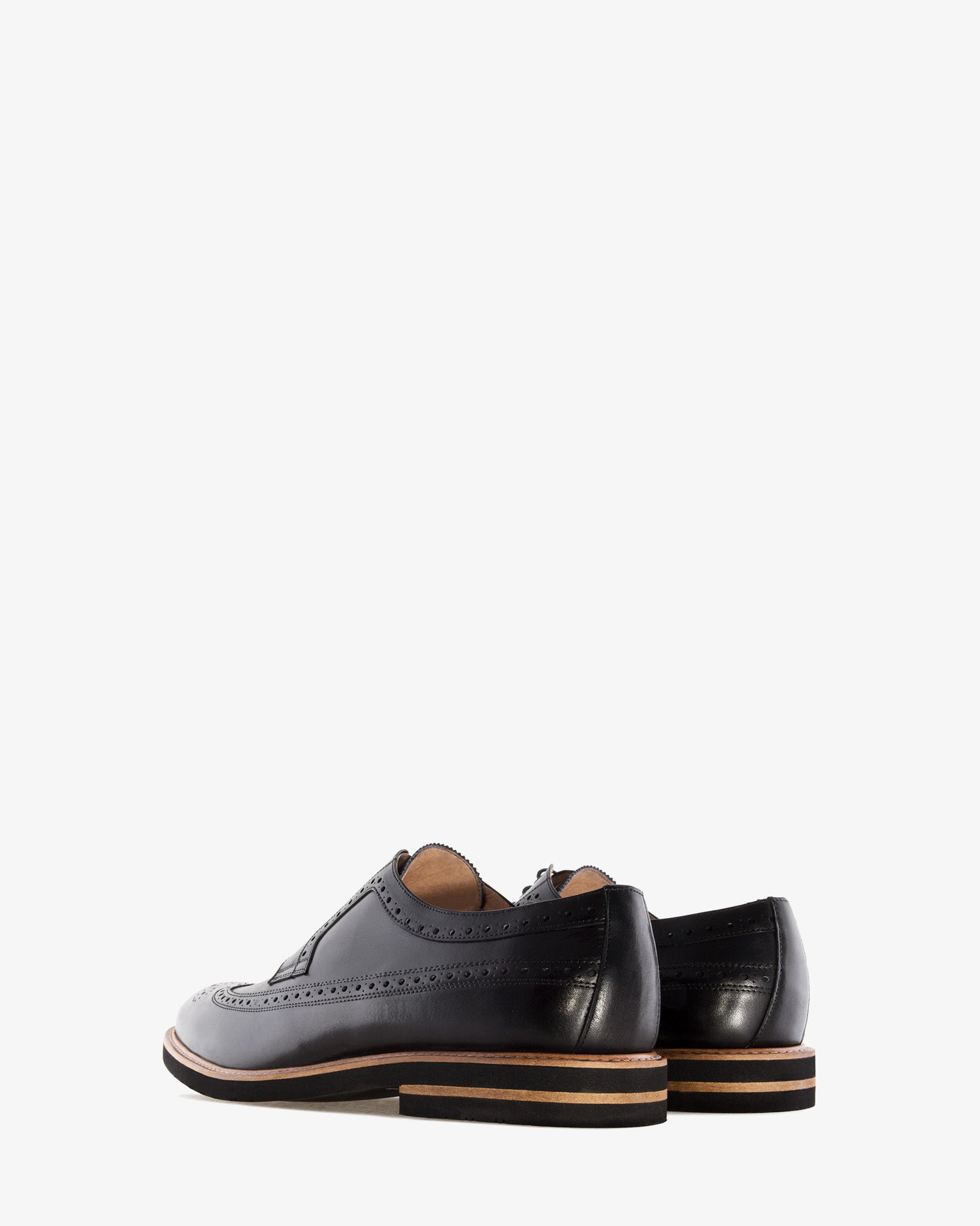 Herrenschuh im Oxford-Stil aus schwarzem Leder mit passendem Schnürverschluss. Charakteristisch für diesen Stil sind die abgehackten Kanten am Spann und an den Seiten. Innenfutter aus beigefarbenem Leder. Schwarze, genähte EVA-Gummisohle. Spanische Herstellung. Kleine Größen von 37 bis 40. Große Größen von 47 bis 52.