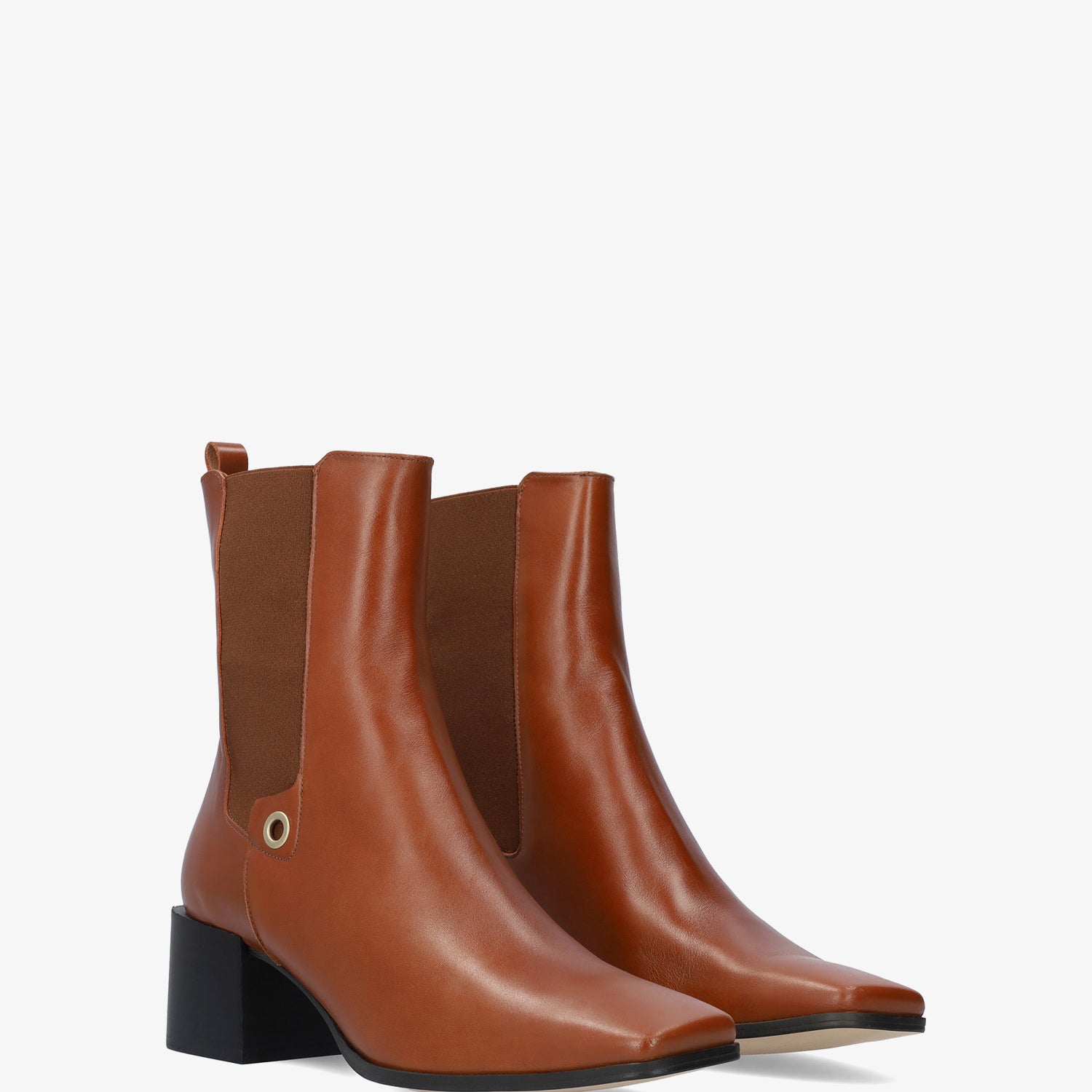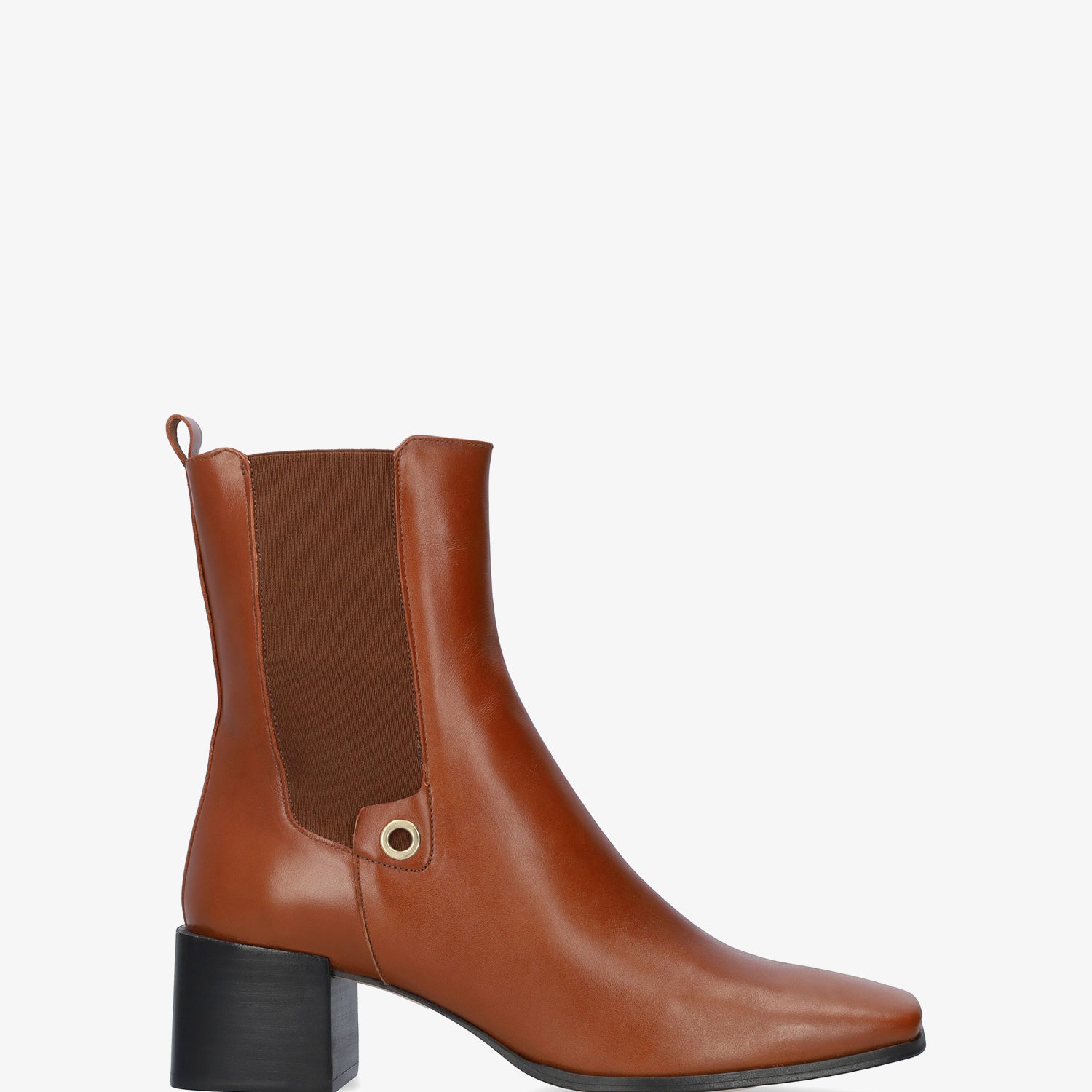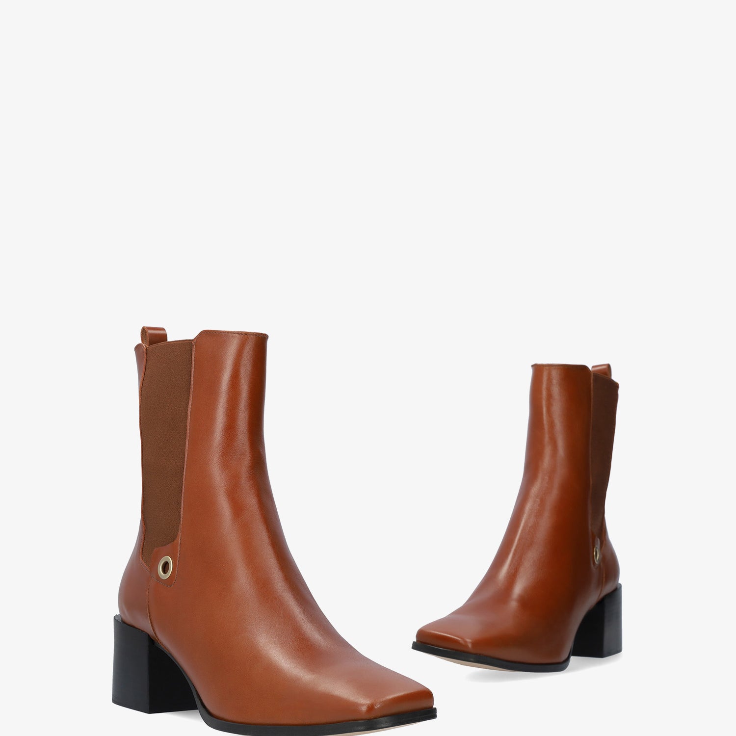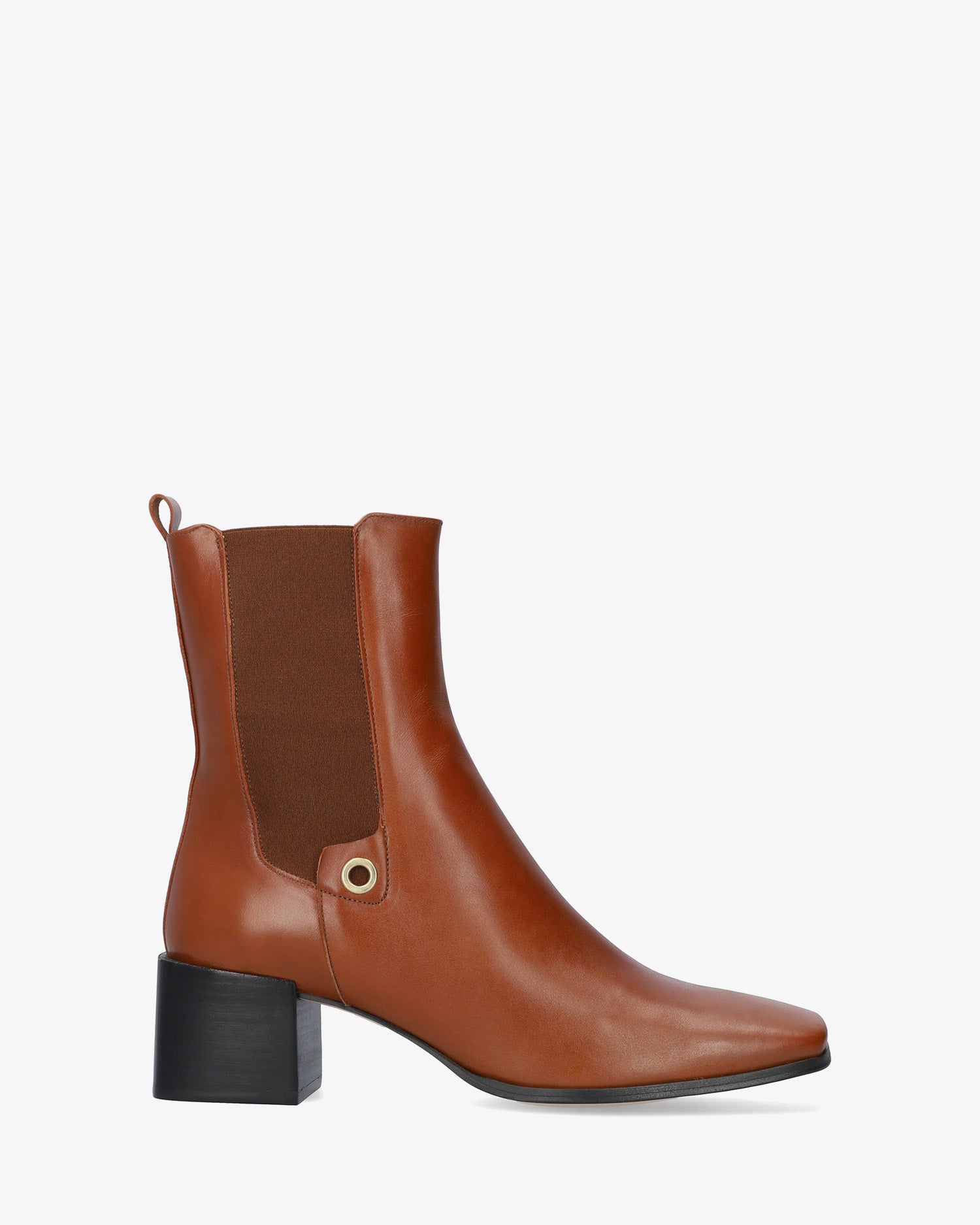Stiefel im Chelsea-Stil aus cognacfarbenem Leder. Passendes Gummiband an den Seiten mit goldenem Nietendetail an der Außenseite und passender Lederzuglasche. Lederfutter und quadratische Zehenpartie. 5 cm hoher quadratischer Absatz in Holzoptik für die kleinen Größen 32 bis 35. 6 cm hoher Absatz für die großen Größen 42 bis 45. Hergestellt in Spanien.