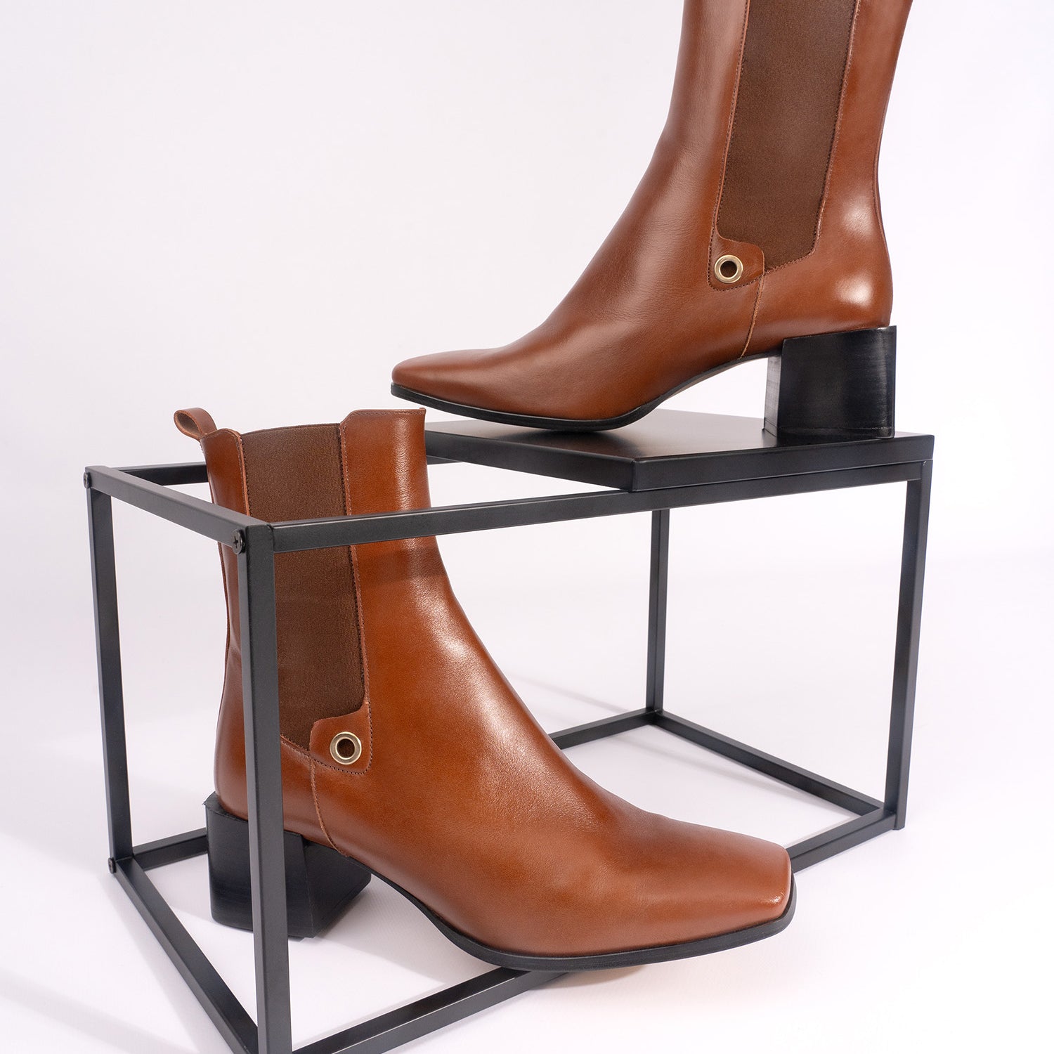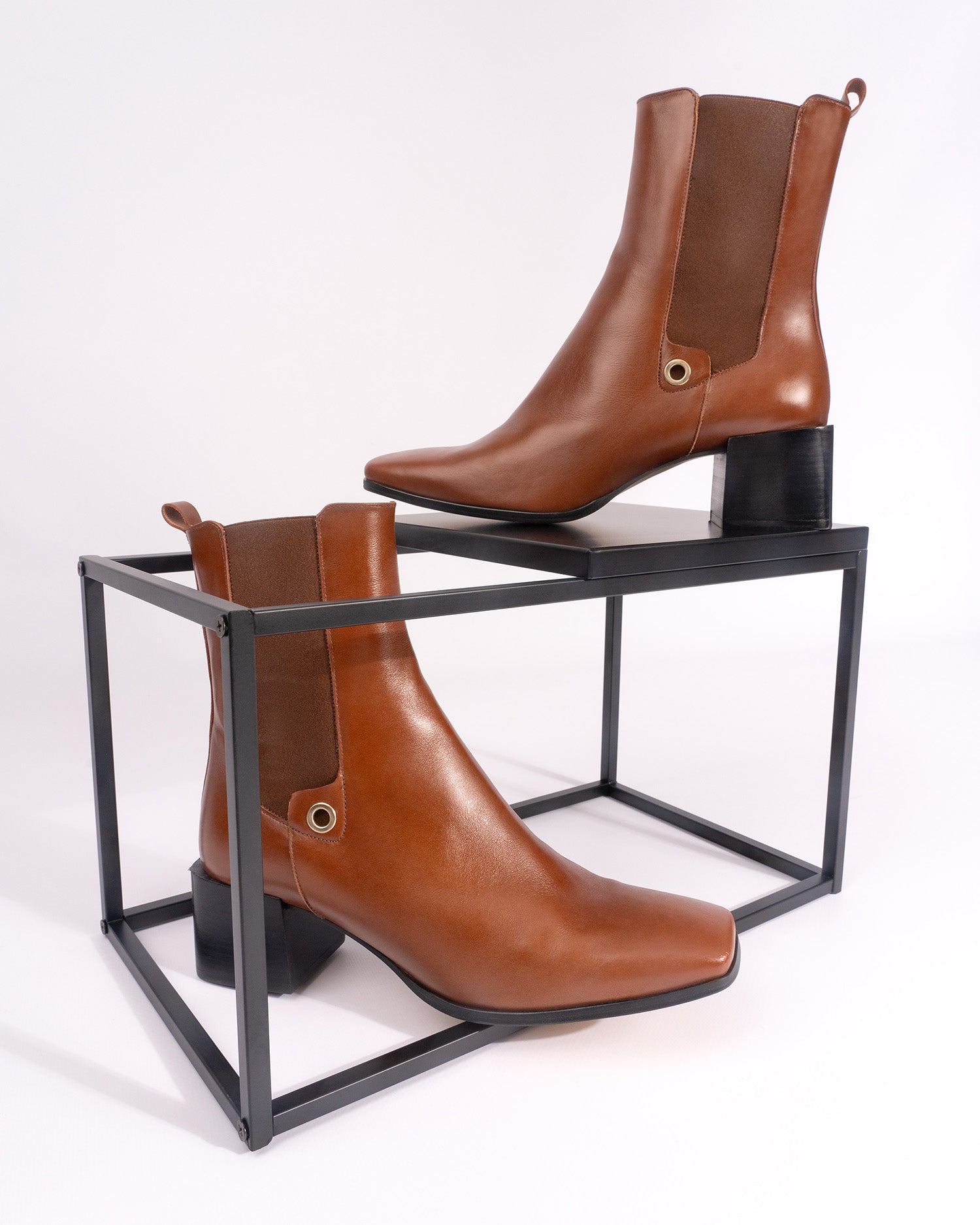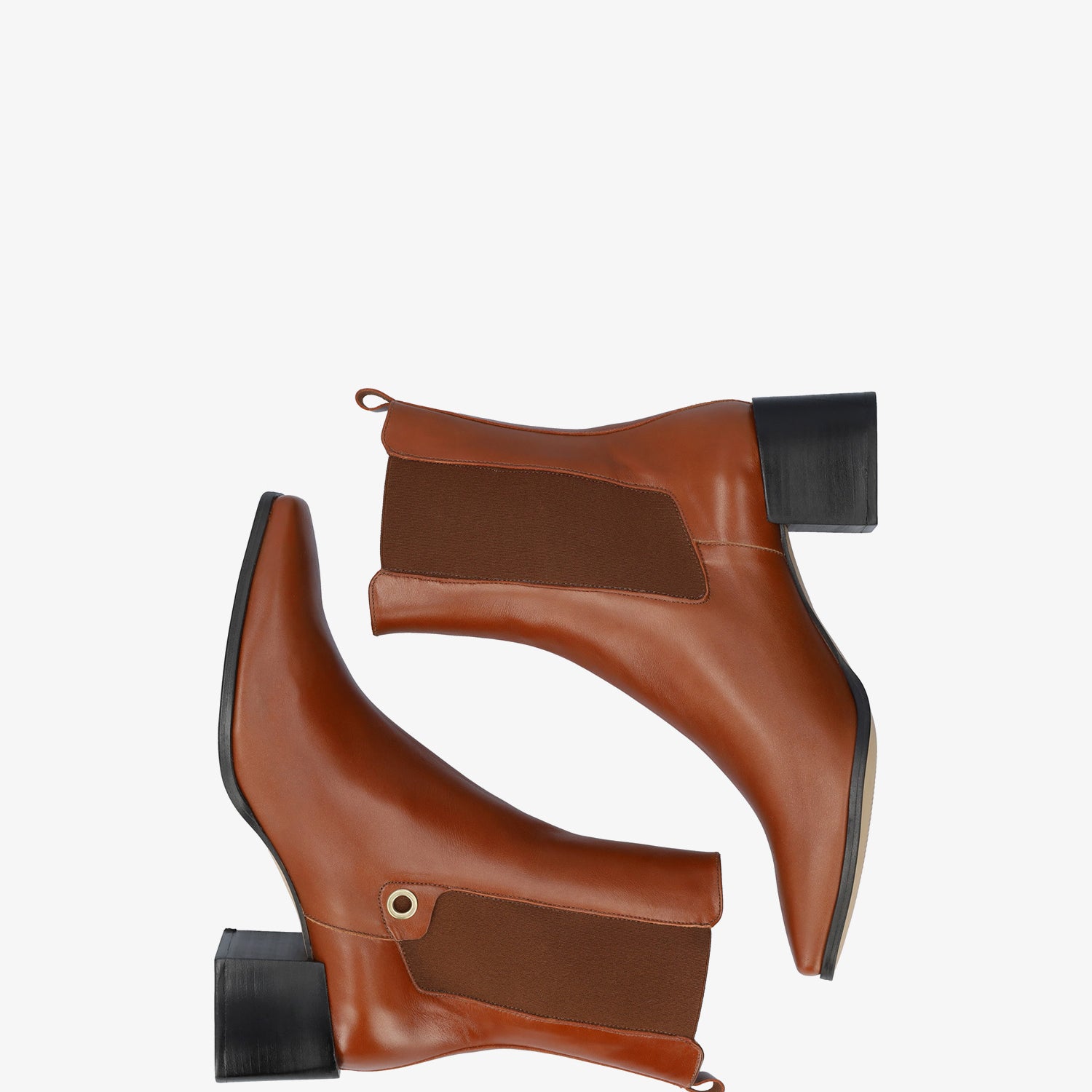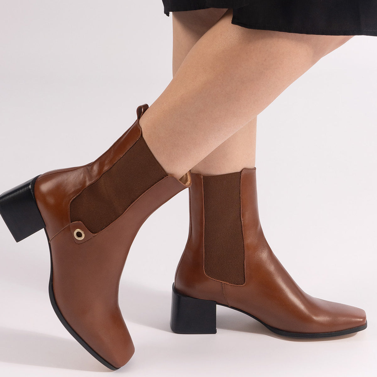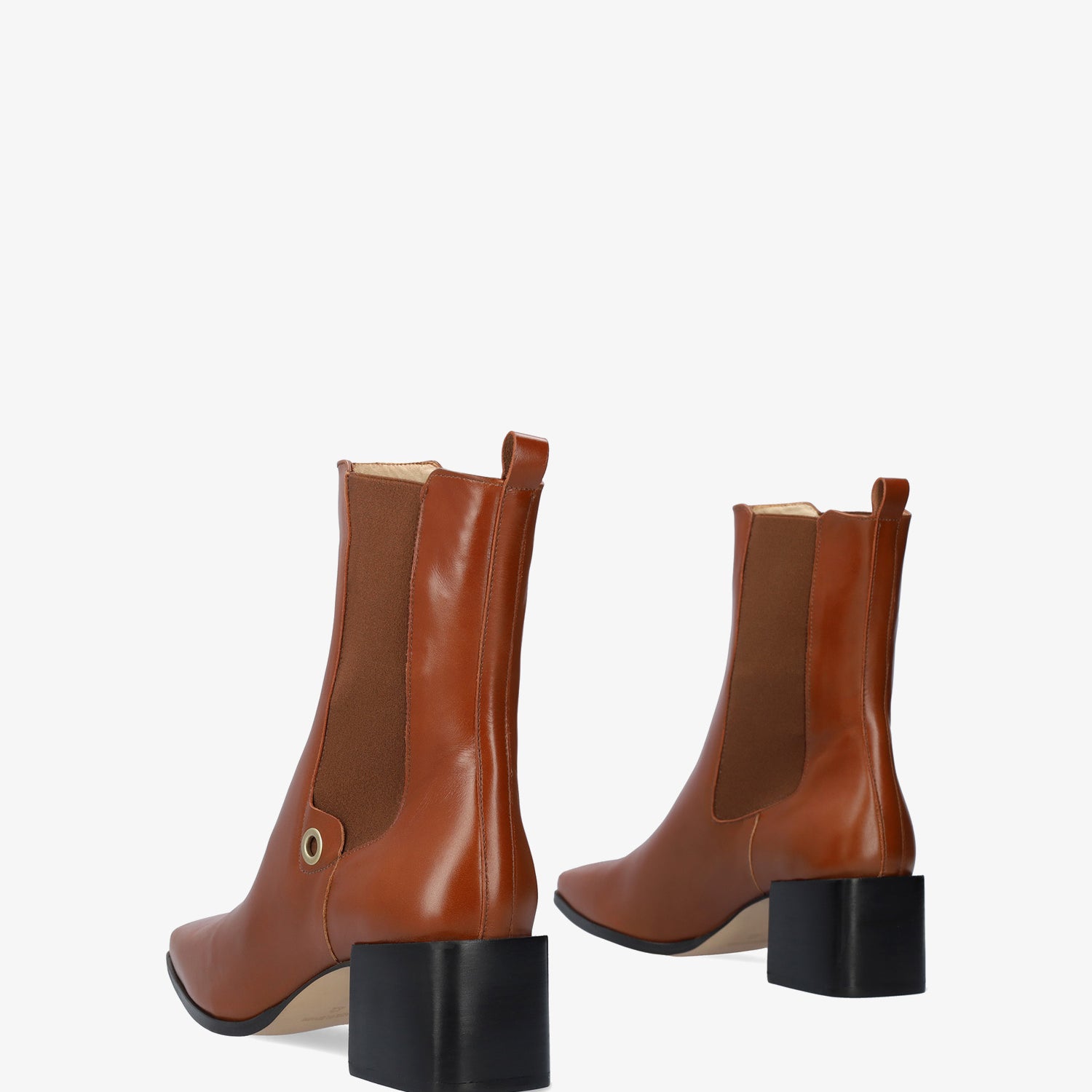 Stiefel im Chelsea-Stil aus cognacfarbenem Leder. Passendes Gummiband an den Seiten mit goldenem Nietendetail an der Außenseite und passender Lederzuglasche. Lederfutter und quadratische Zehenpartie. 5 cm hoher quadratischer Absatz in Holzoptik für die kleinen Größen 32 bis 35. 6 cm hoher Absatz für die großen Größen 42 bis 45. Hergestellt in Spanien.