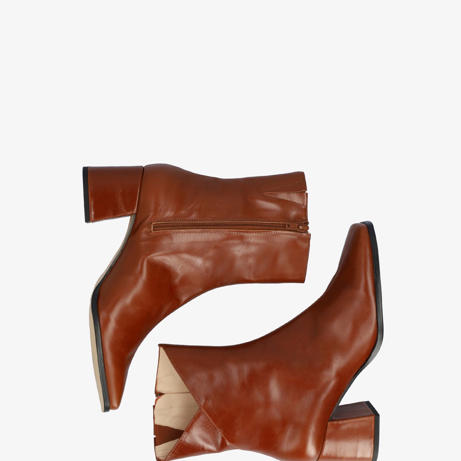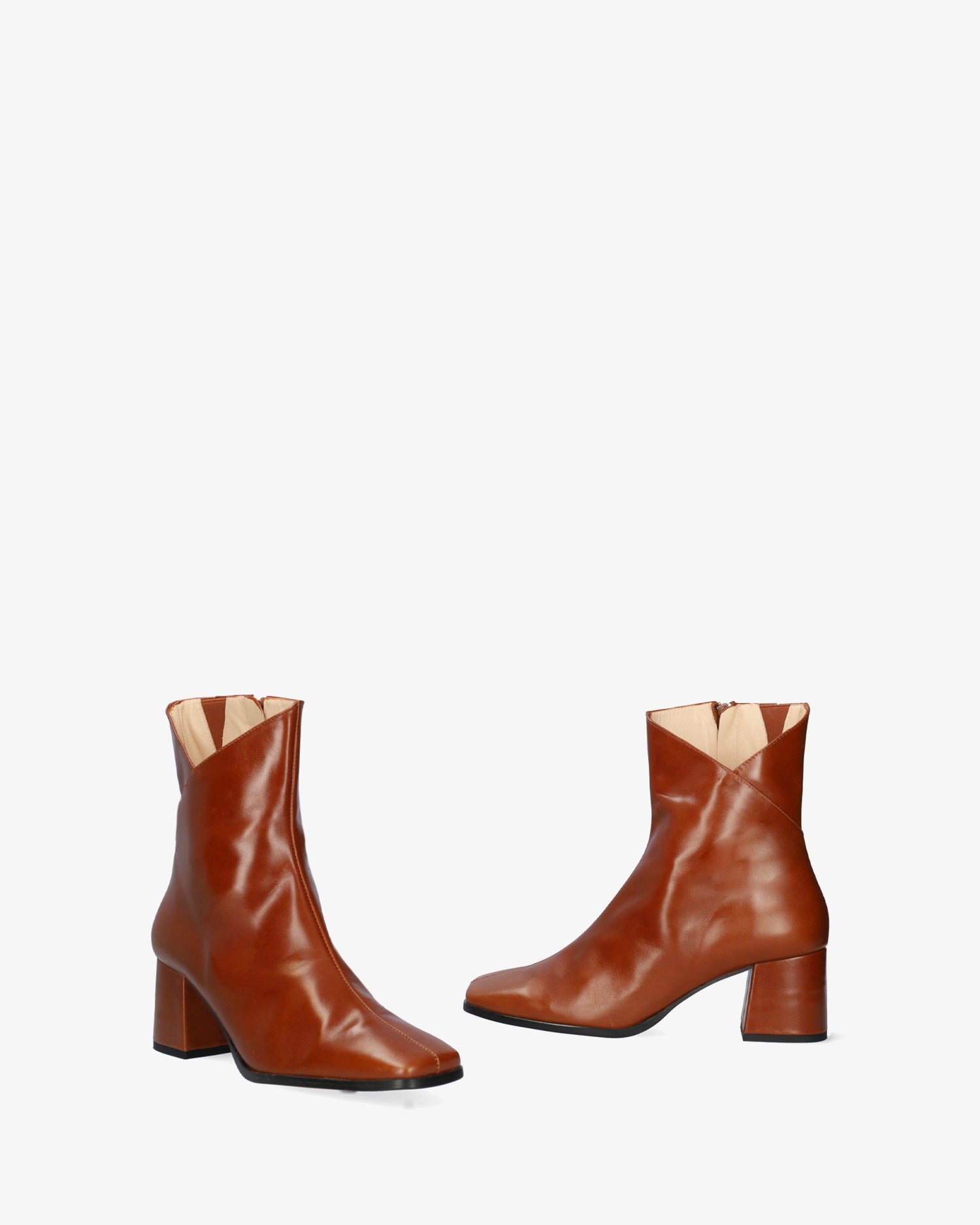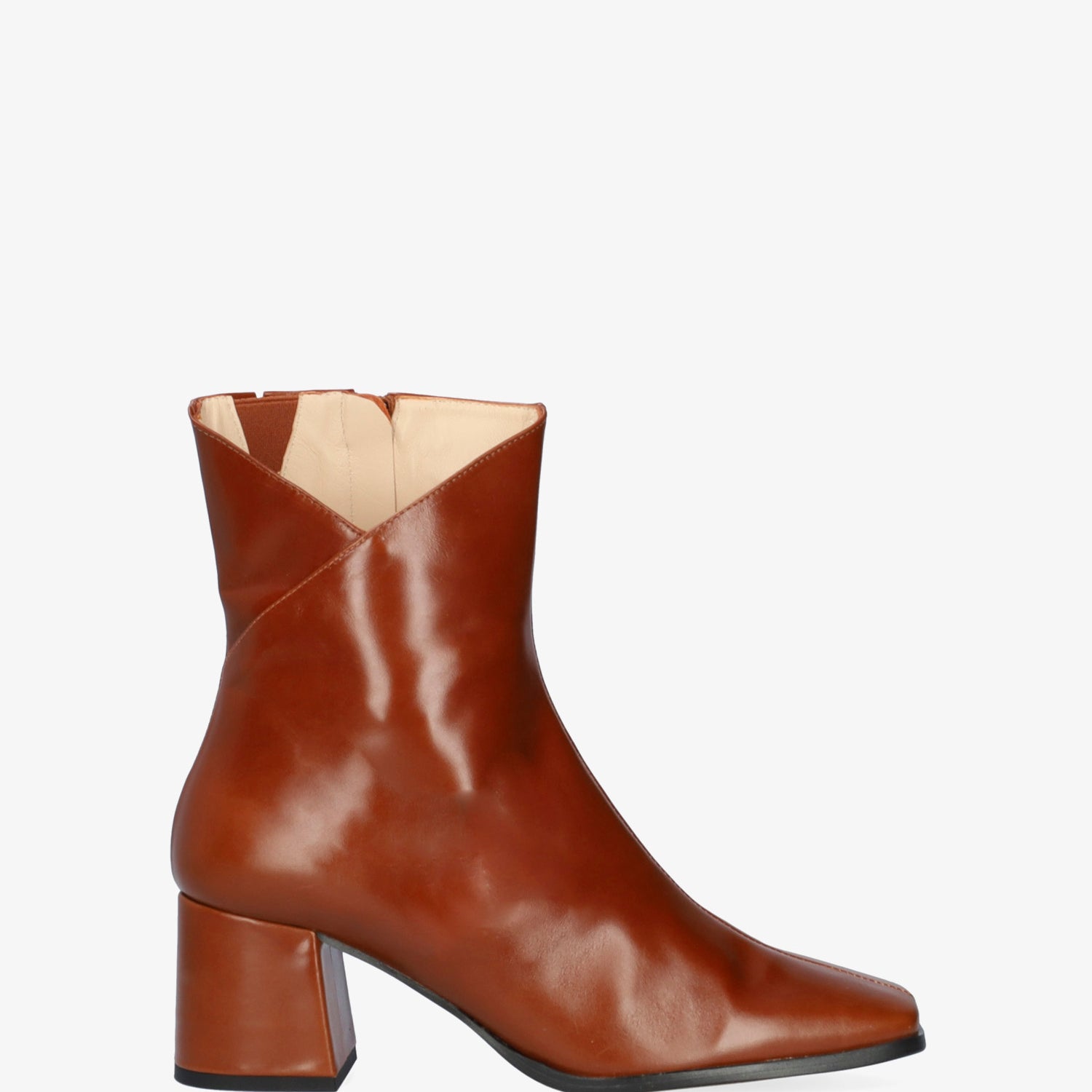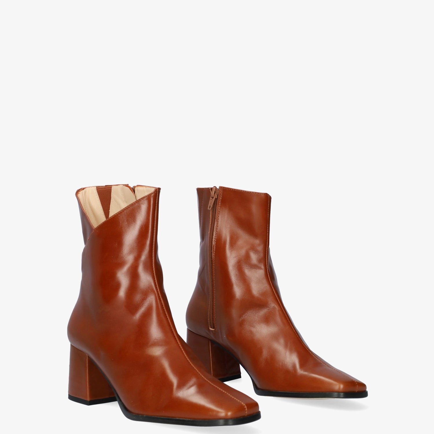 Lederstiefel in hellbrauner Farbe. Mittelnaht von der Spitze bis zur Schaftoberseite. Detail des offenen V-förmigen Schaftes an der Außenseite. Passender Reißverschluss auf der Innenseite. Beiges Lederfutter. Quadratische Zehenpartie. 6 cm hoher, Ton-in-Ton gefütterter breiter Absatz für die kleinen Größen 32 bis 35. 6 cm hoher Absatz für die mittleren Größen 36 bis 41. 6,5 cm hoher Absatz für die großen Größen 42 bis 45. Hergestellt in Spanien.