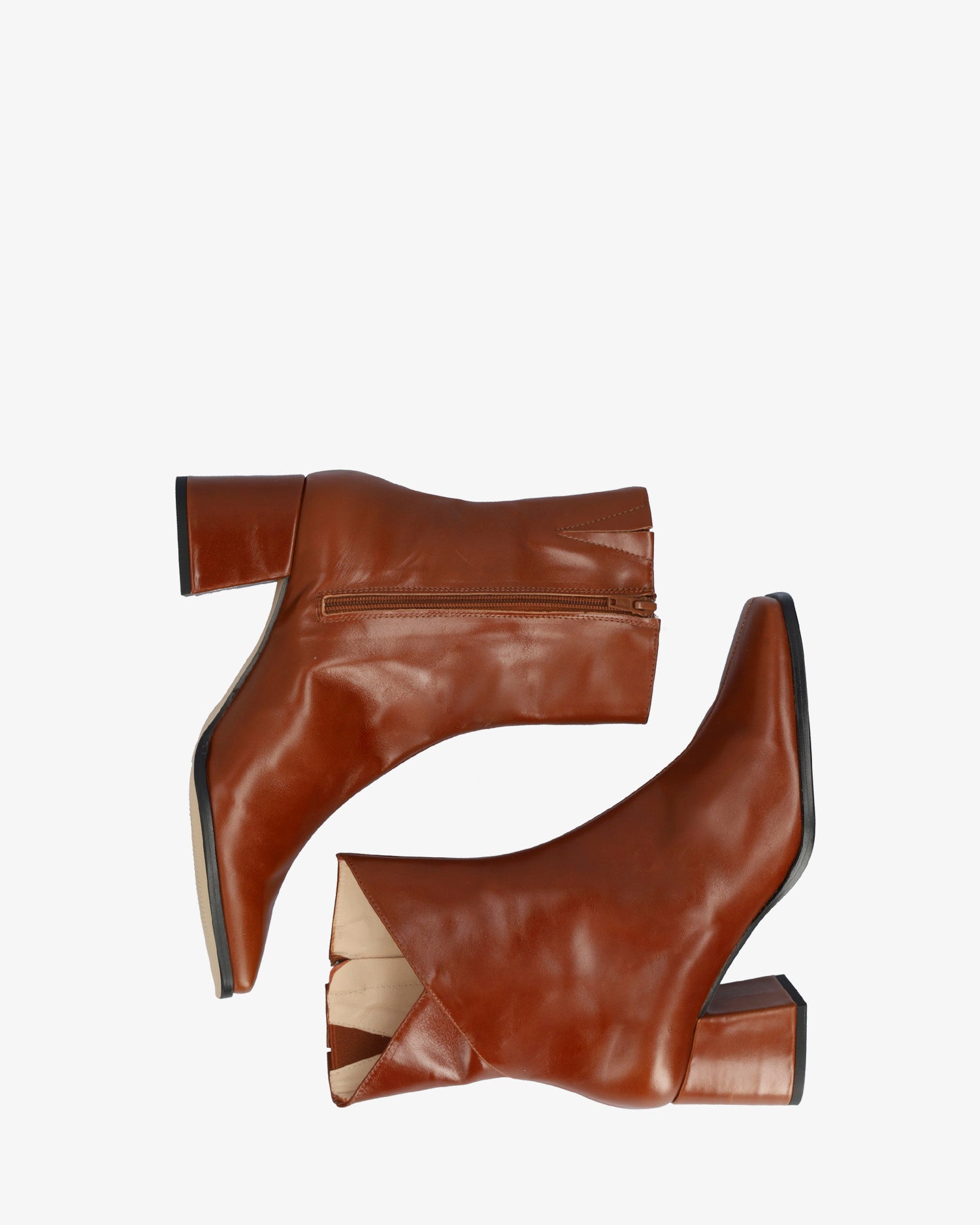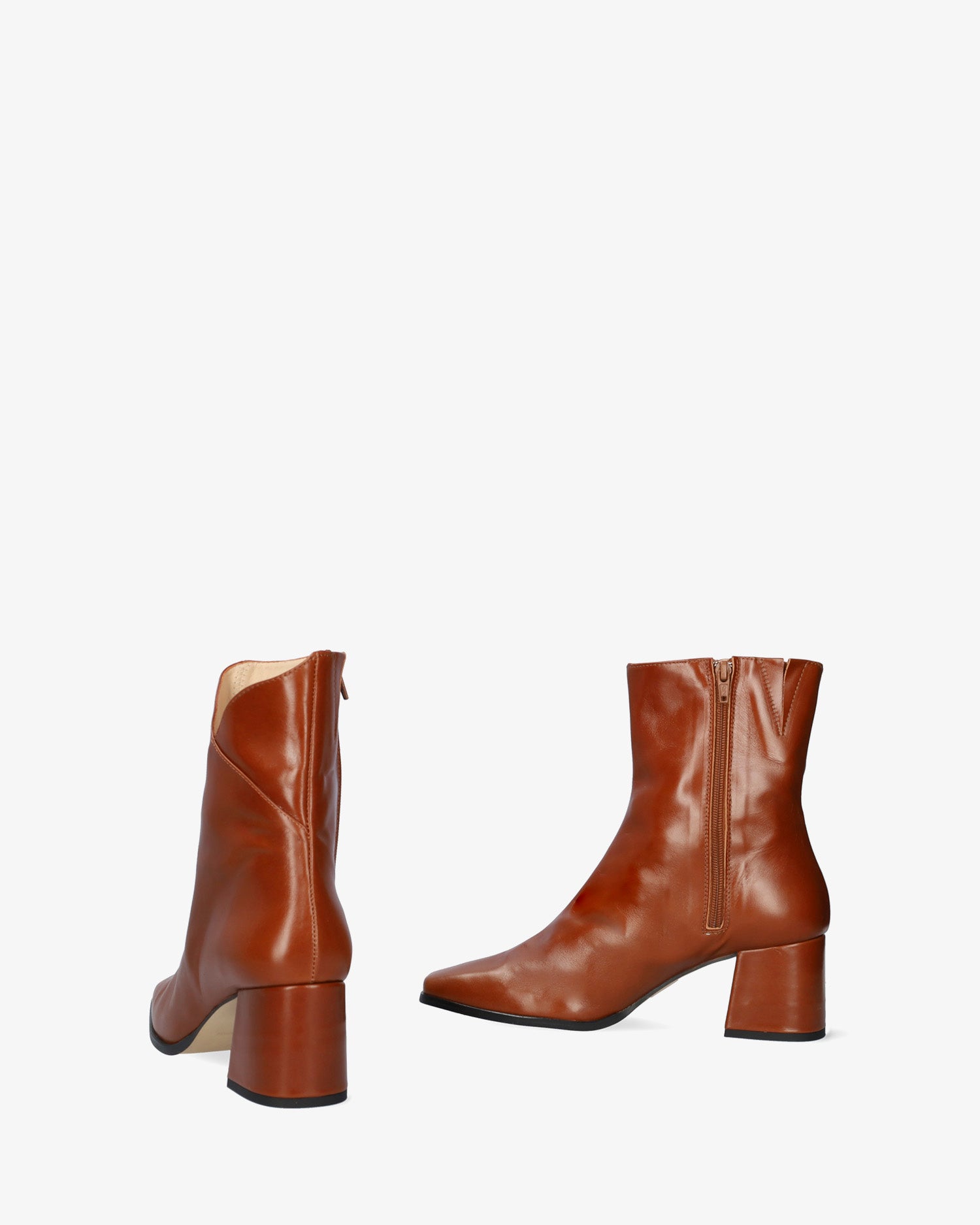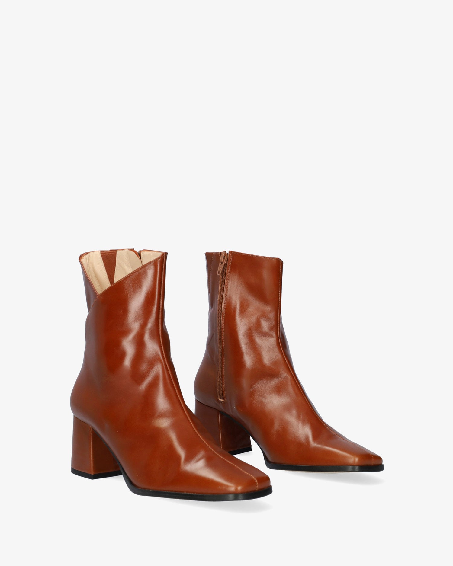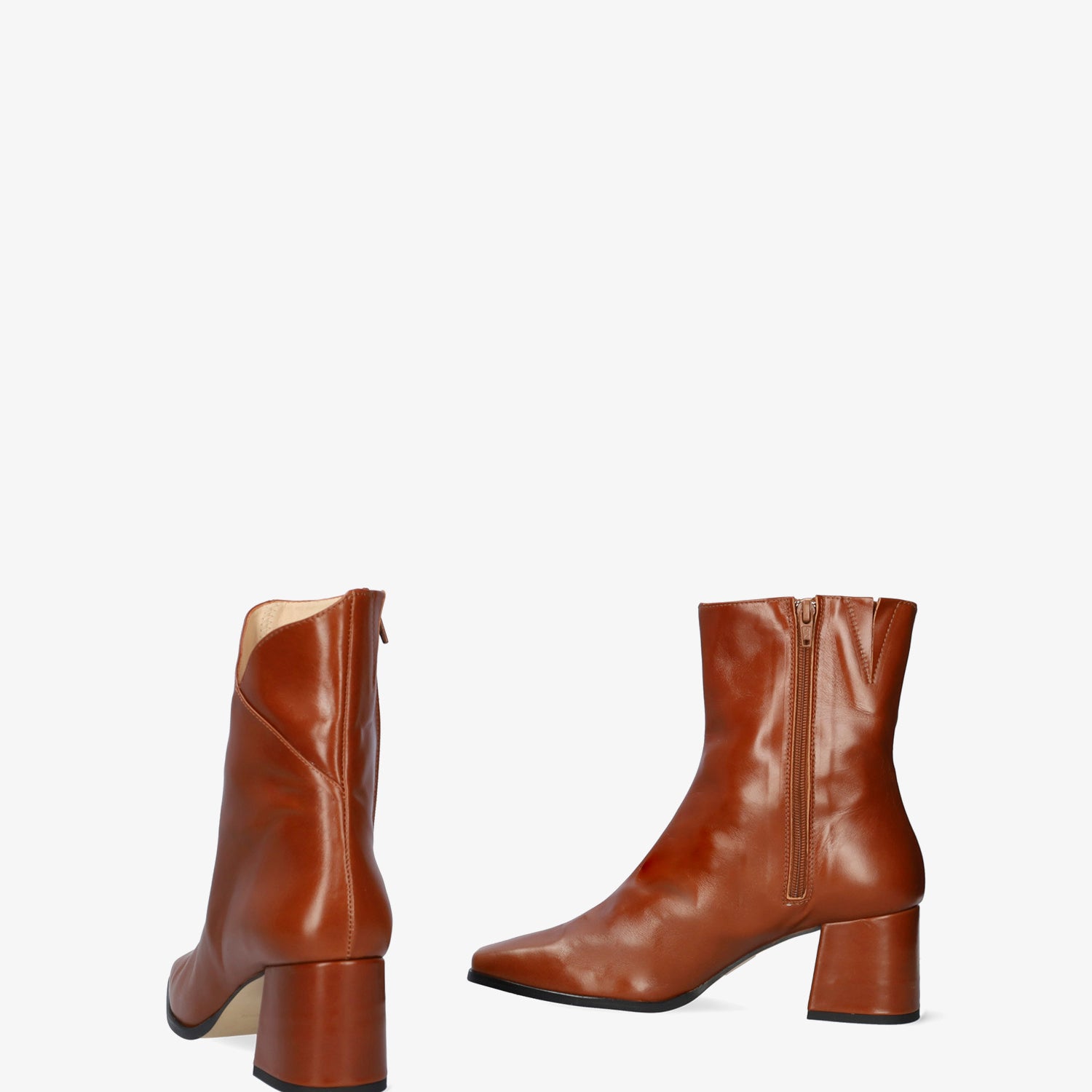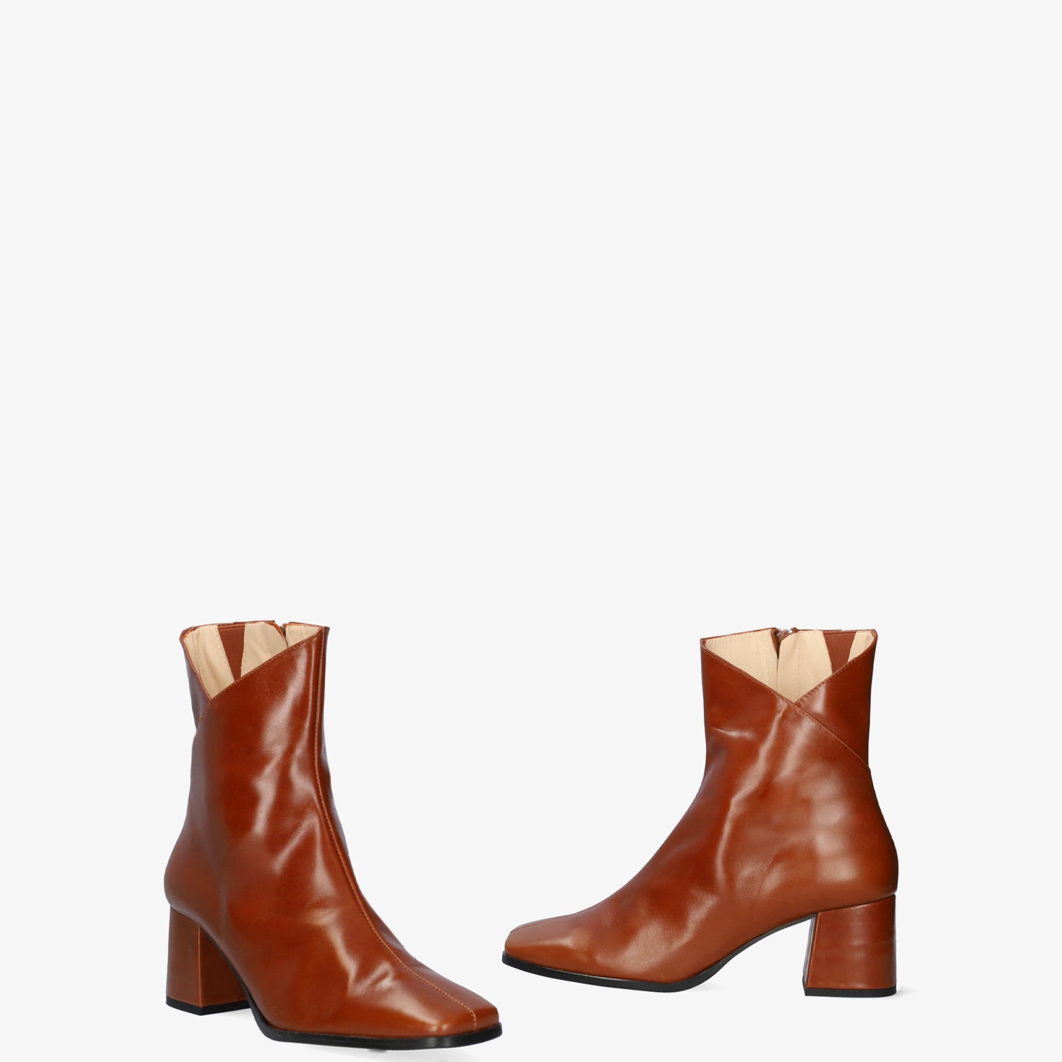 Lederstiefel in hellbrauner Farbe. Mittelnaht von der Spitze bis zur Schaftoberseite. Detail des offenen V-förmigen Schaftes an der Außenseite. Passender Reißverschluss auf der Innenseite. Beiges Lederfutter. Quadratische Zehenpartie. 6 cm hoher, Ton-in-Ton gefütterter breiter Absatz für die kleinen Größen 32 bis 35. 6 cm hoher Absatz für die mittleren Größen 36 bis 41. 6,5 cm hoher Absatz für die großen Größen 42 bis 45. Hergestellt in Spanien.