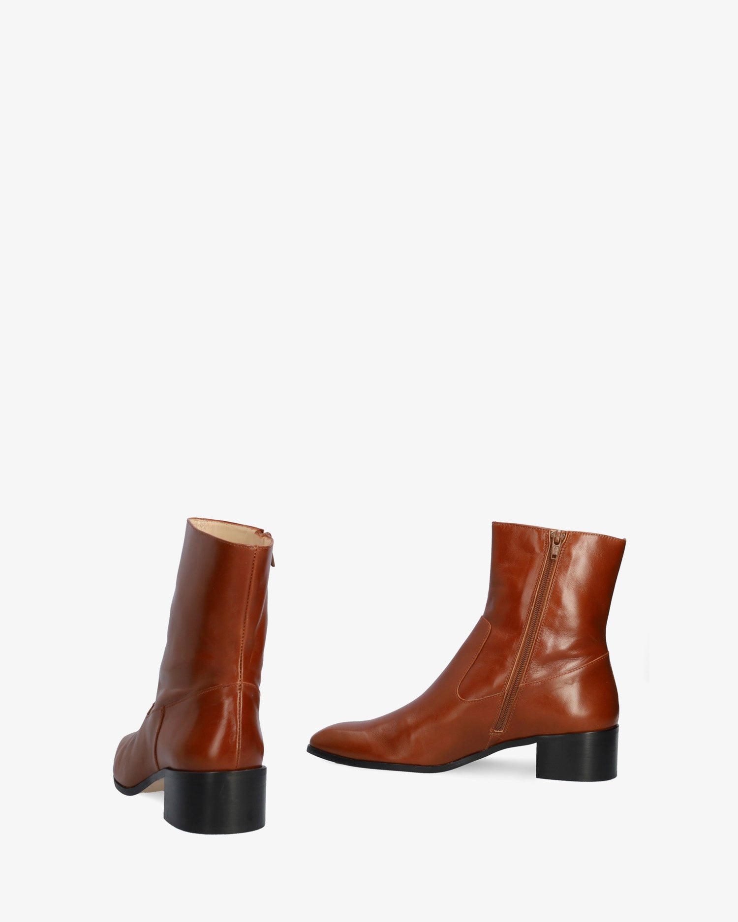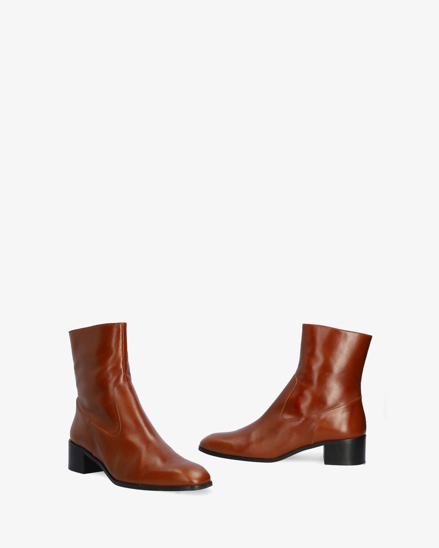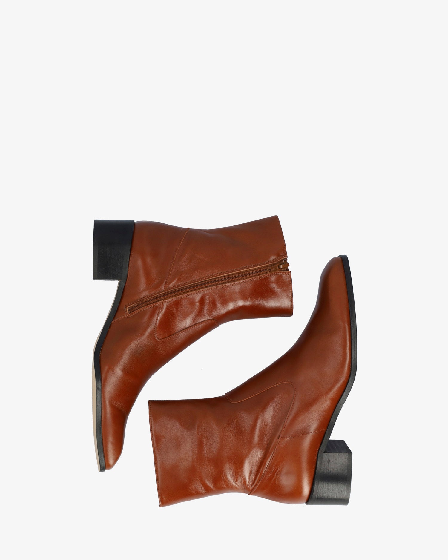 Lederstiefel in hellbrauner Farbe. Dekorative Nähte auf dem Obermaterial. Passender Reißverschluss auf der Innenseite. Beiges Lederfutter. Quadratische Zehenpartie. Breiter schwarzer Absatz, 4 cm hoch, für die kleinen Größen 32 bis 35. 4 cm hoher Absatz für die mittleren Größen 36 bis 41. 4,5 cm hoher Absatz für die großen Größen 42 bis 45. Hergestellt in Spanien.