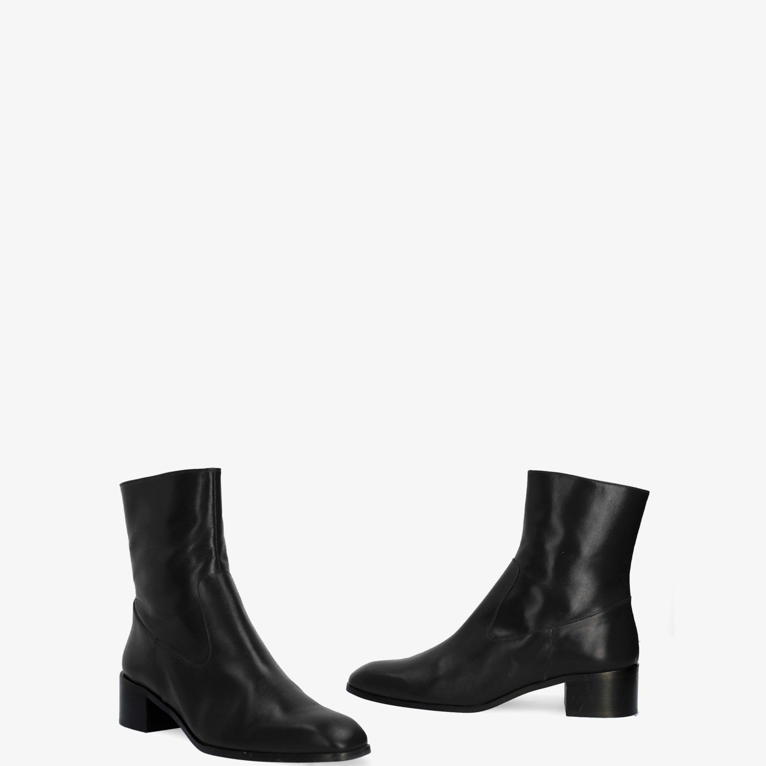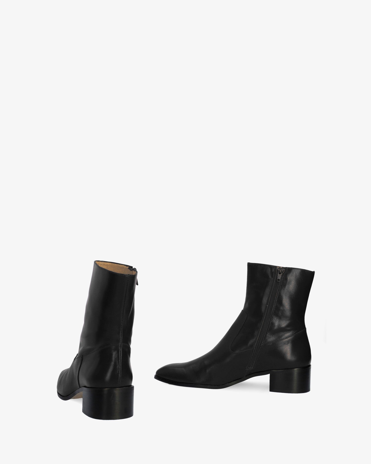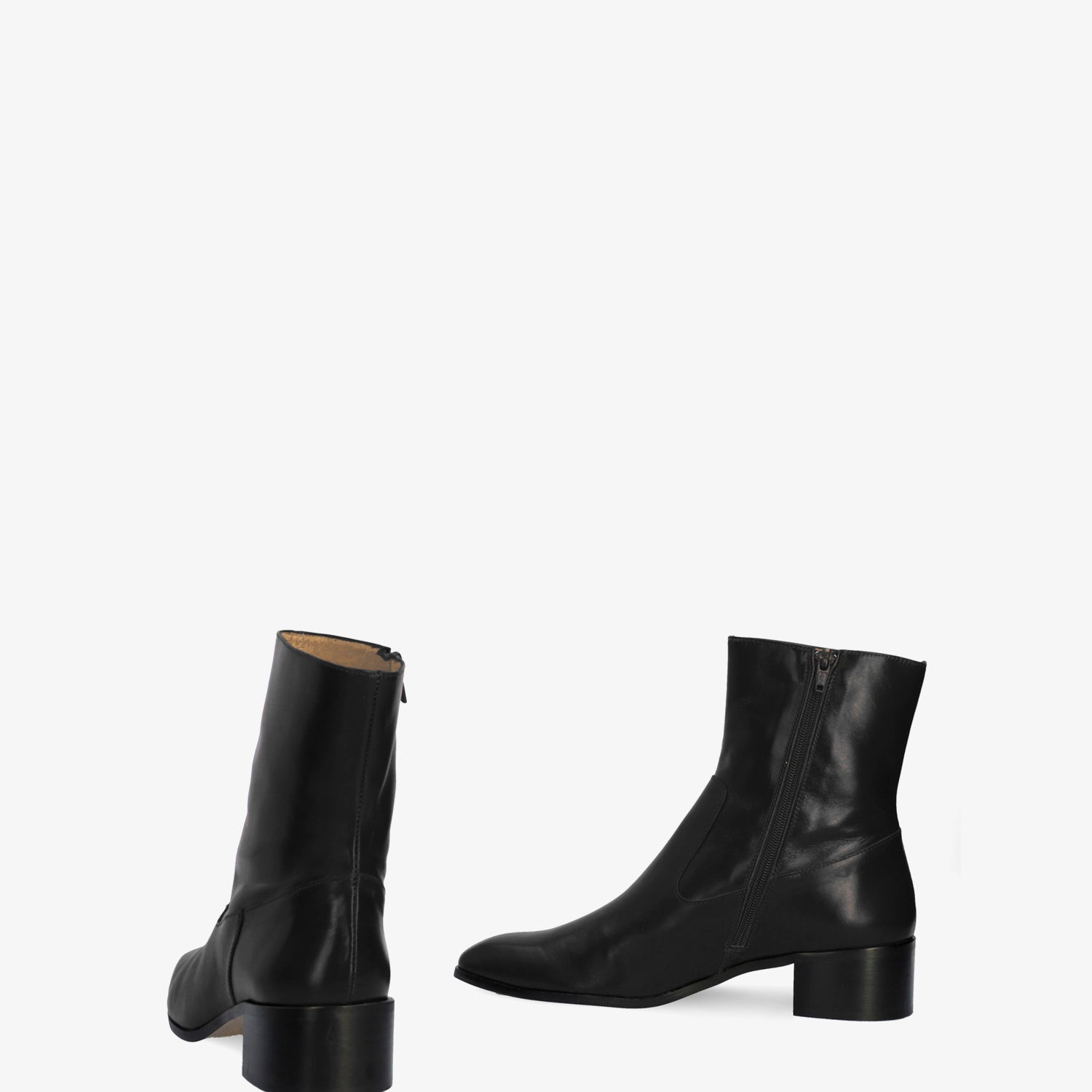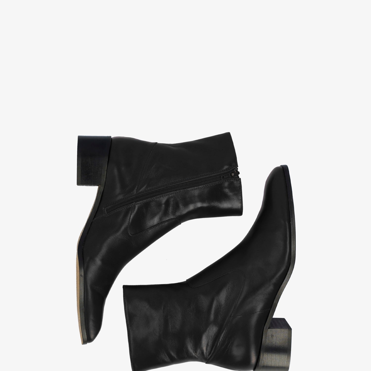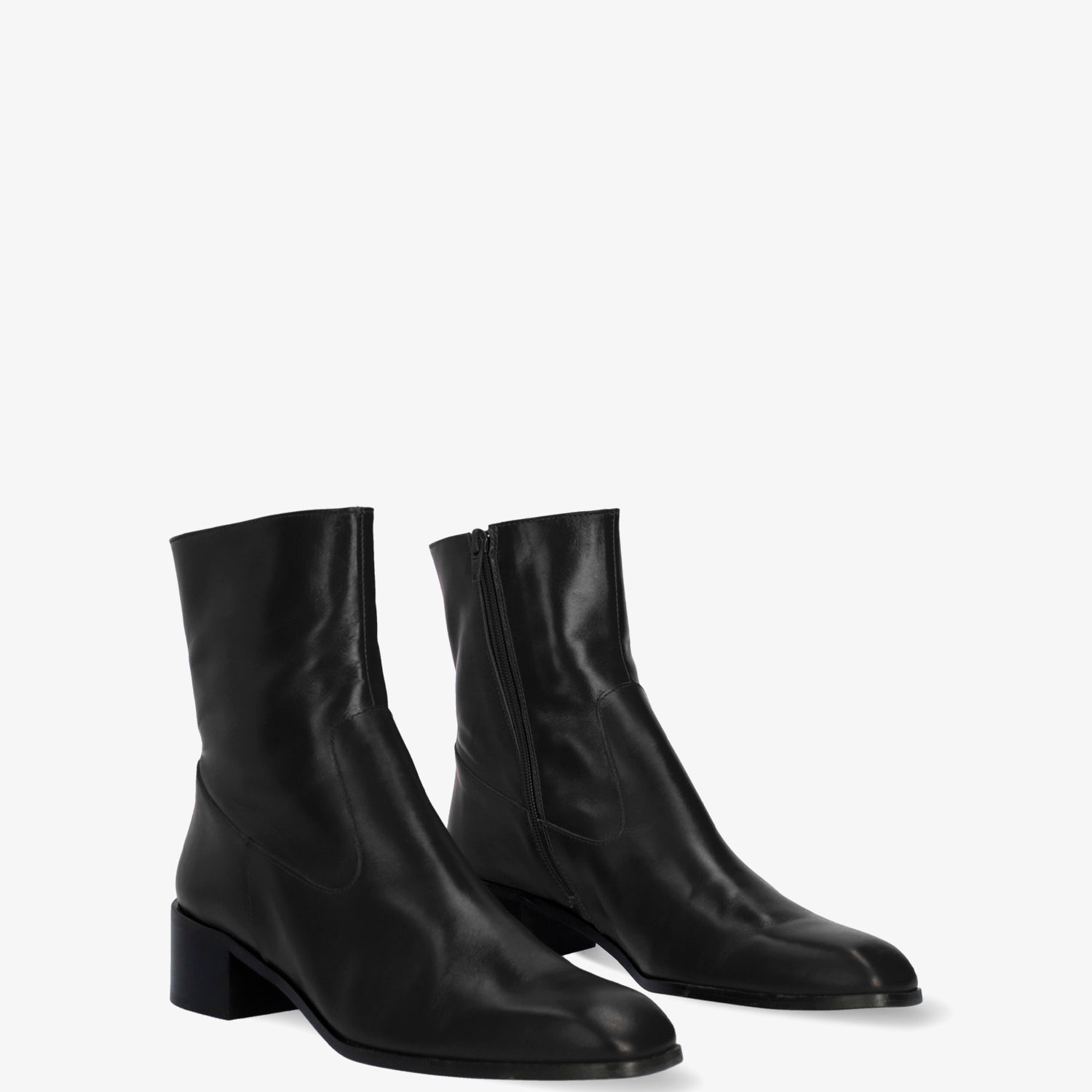 Schwarzer Lederstiefel. Dekorative Nähte auf dem Obermaterial. Passender Reißverschluss auf der Innenseite. Beiges Lederfutter. Quadratische Zehenpartie. Breiter schwarzer Absatz, 4 cm hoch, für die kleinen Größen 32 bis 35. 4 cm hoher Absatz für die mittleren Größen 36 bis 41. 4,5 cm hoher Absatz für die großen Größen 42 bis 45. Hergestellt in Spanien.