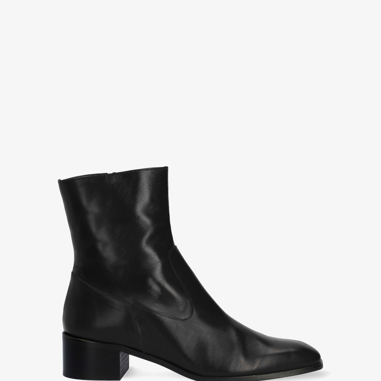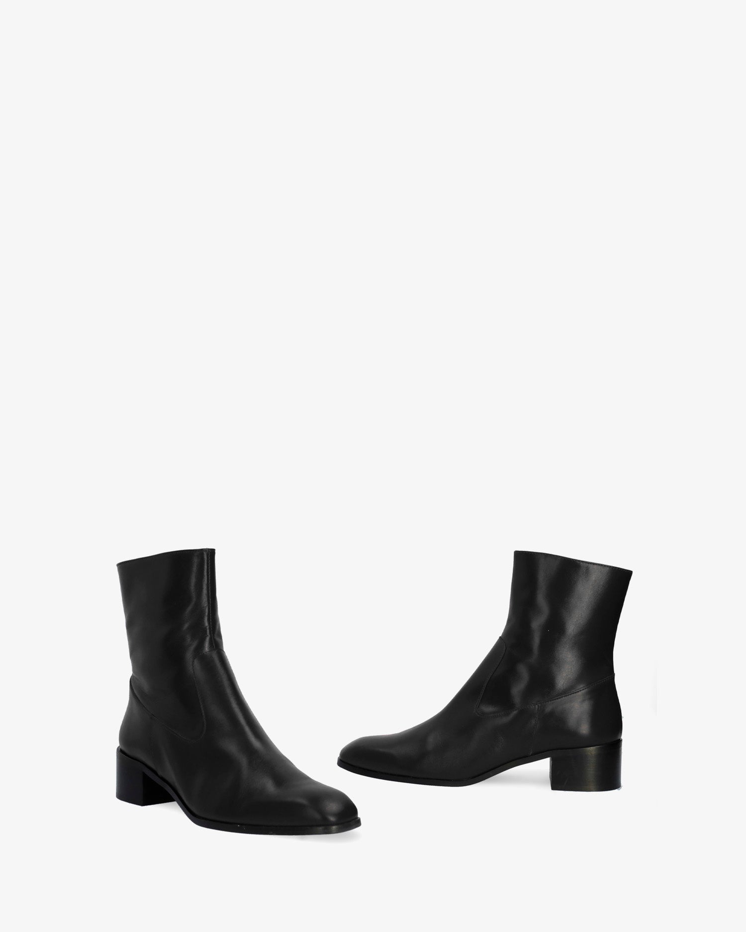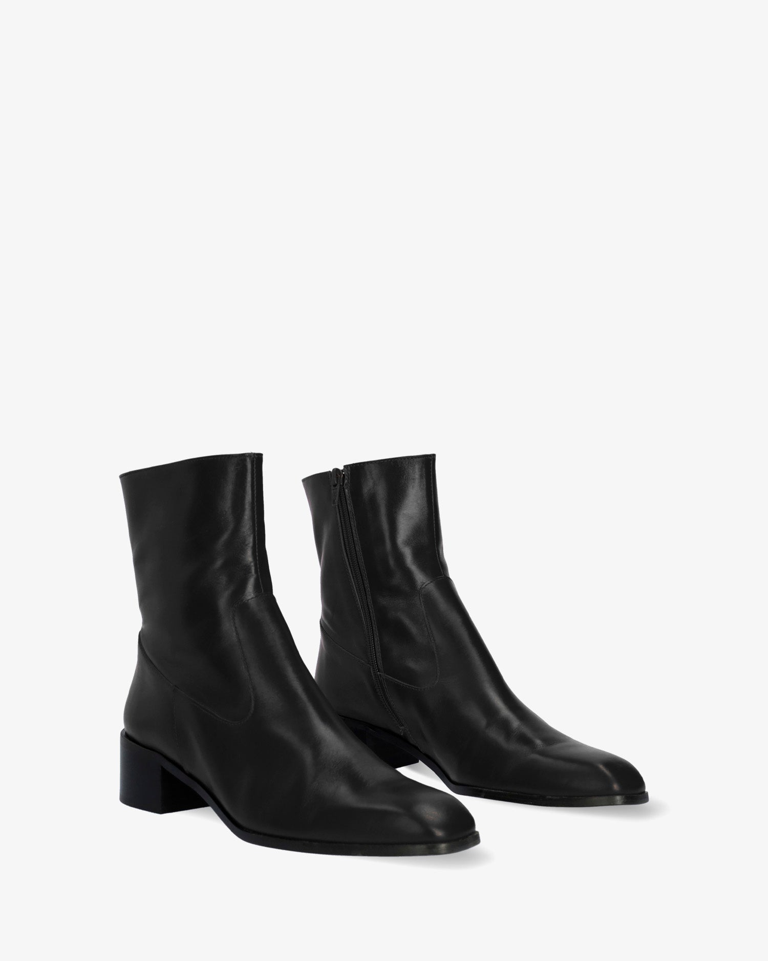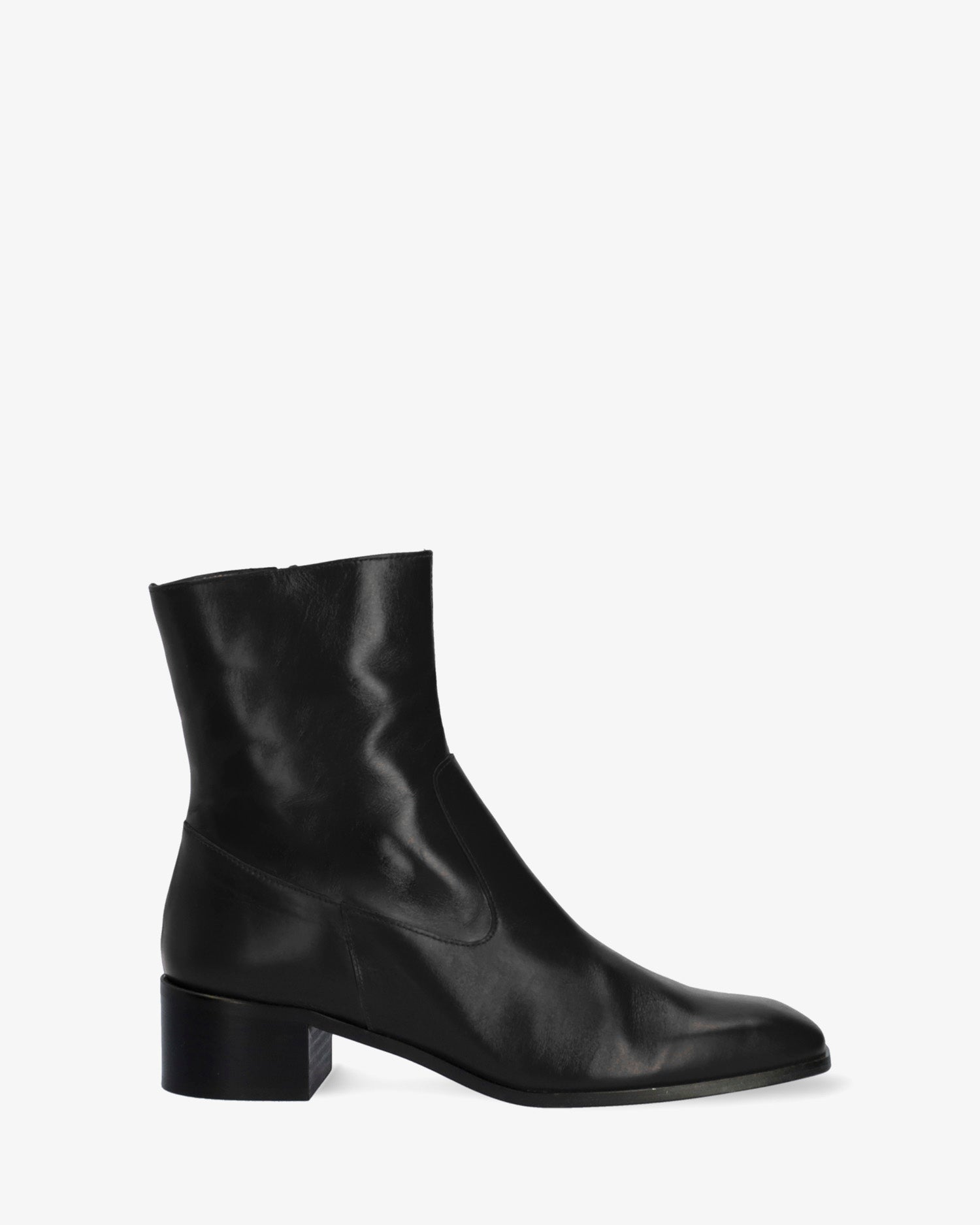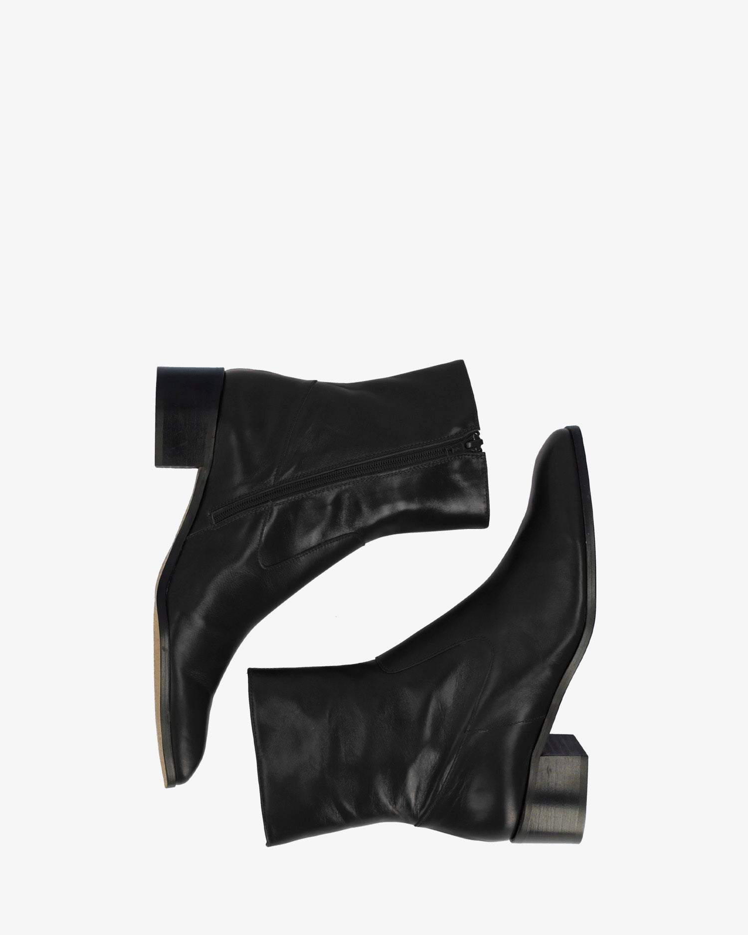 Schwarzer Lederstiefel. Dekorative Nähte auf dem Obermaterial. Passender Reißverschluss auf der Innenseite. Beiges Lederfutter. Quadratische Zehenpartie. Breiter schwarzer Absatz, 4 cm hoch, für die kleinen Größen 32 bis 35. 4 cm hoher Absatz für die mittleren Größen 36 bis 41. 4,5 cm hoher Absatz für die großen Größen 42 bis 45. Hergestellt in Spanien.