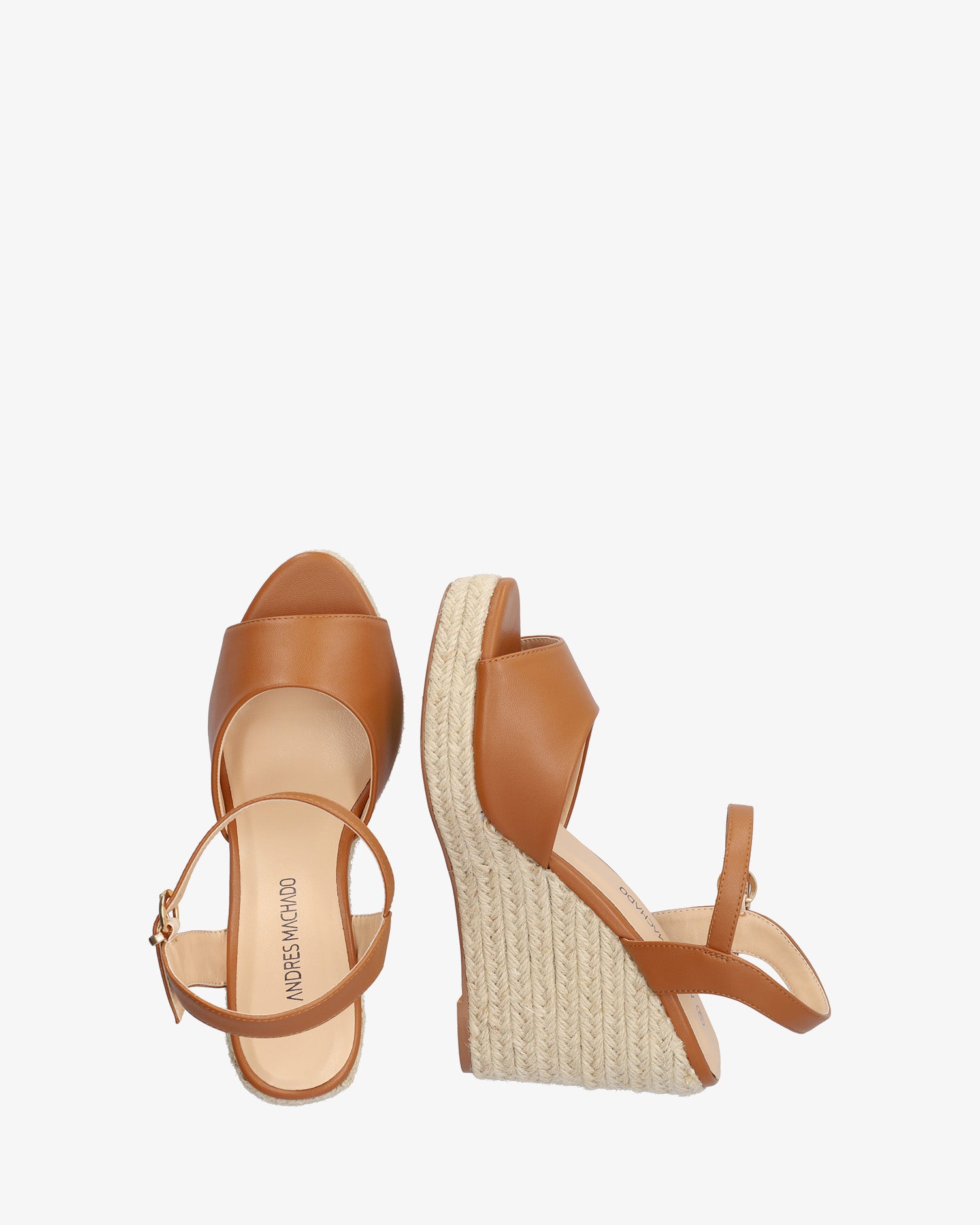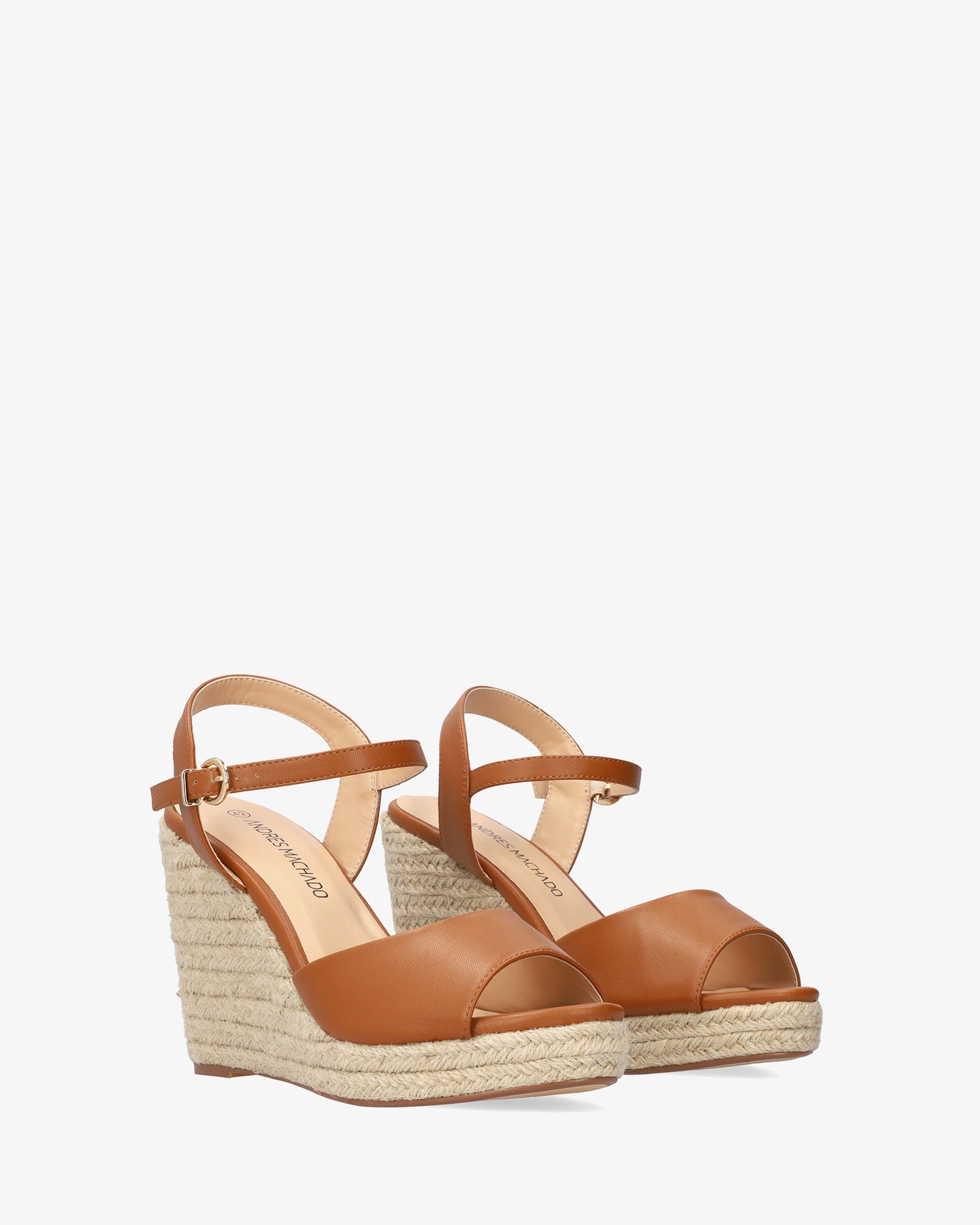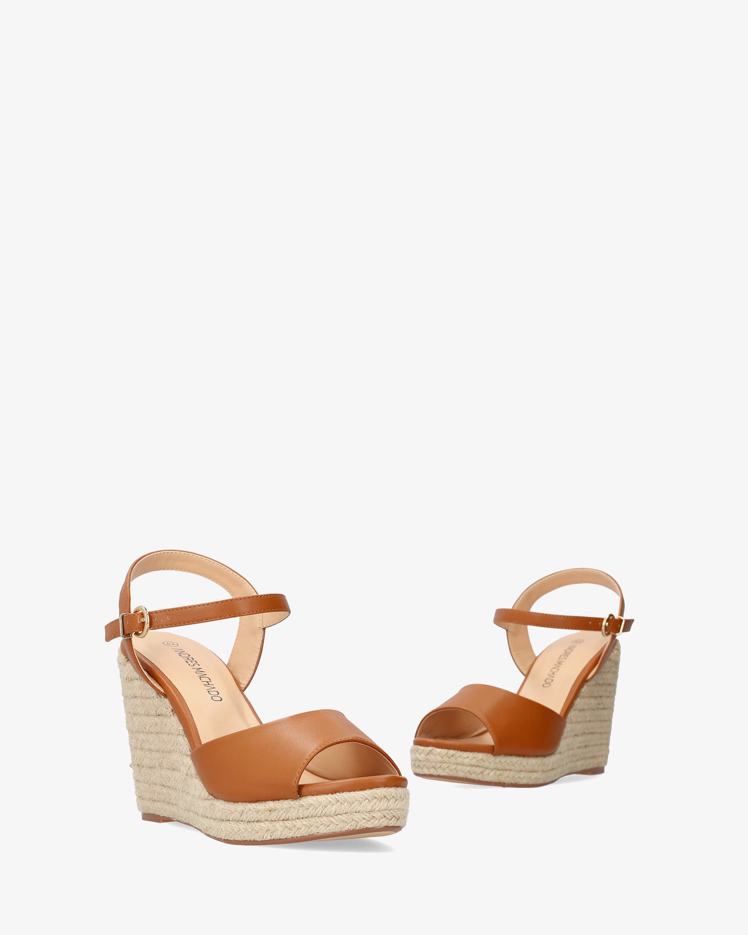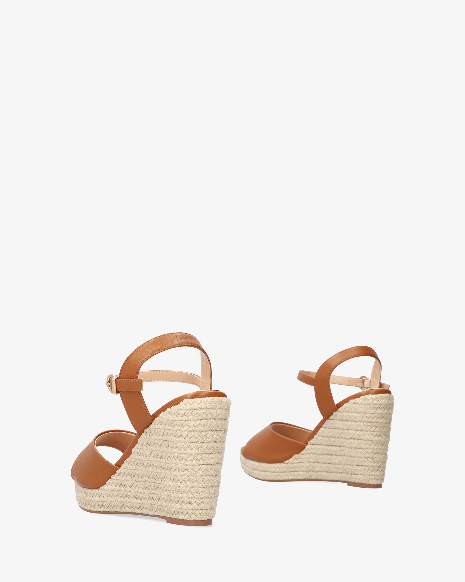 Braune, weiche Keilsandalen. Rückenfreies Design mit breitem Riemen vorne. Metallschnallenverschluss mit passendem Knöchelriemen. Offene Zehenpartie. Keilabsätze und Plateau vorne aus Jute. 10 cm Keilabsatz und 2,5 cm Plateau für die kleinen Größen 32 bis 35. 11,5 cm Keilabsatz und 3 cm Plateau für die großen Größen 42 bis 45. Schmale Passform. Wenn Sie breite Füße haben oder zwischen zwei Größen liegen, empfehlen wir Ihnen, die größere Größe zu wählen.