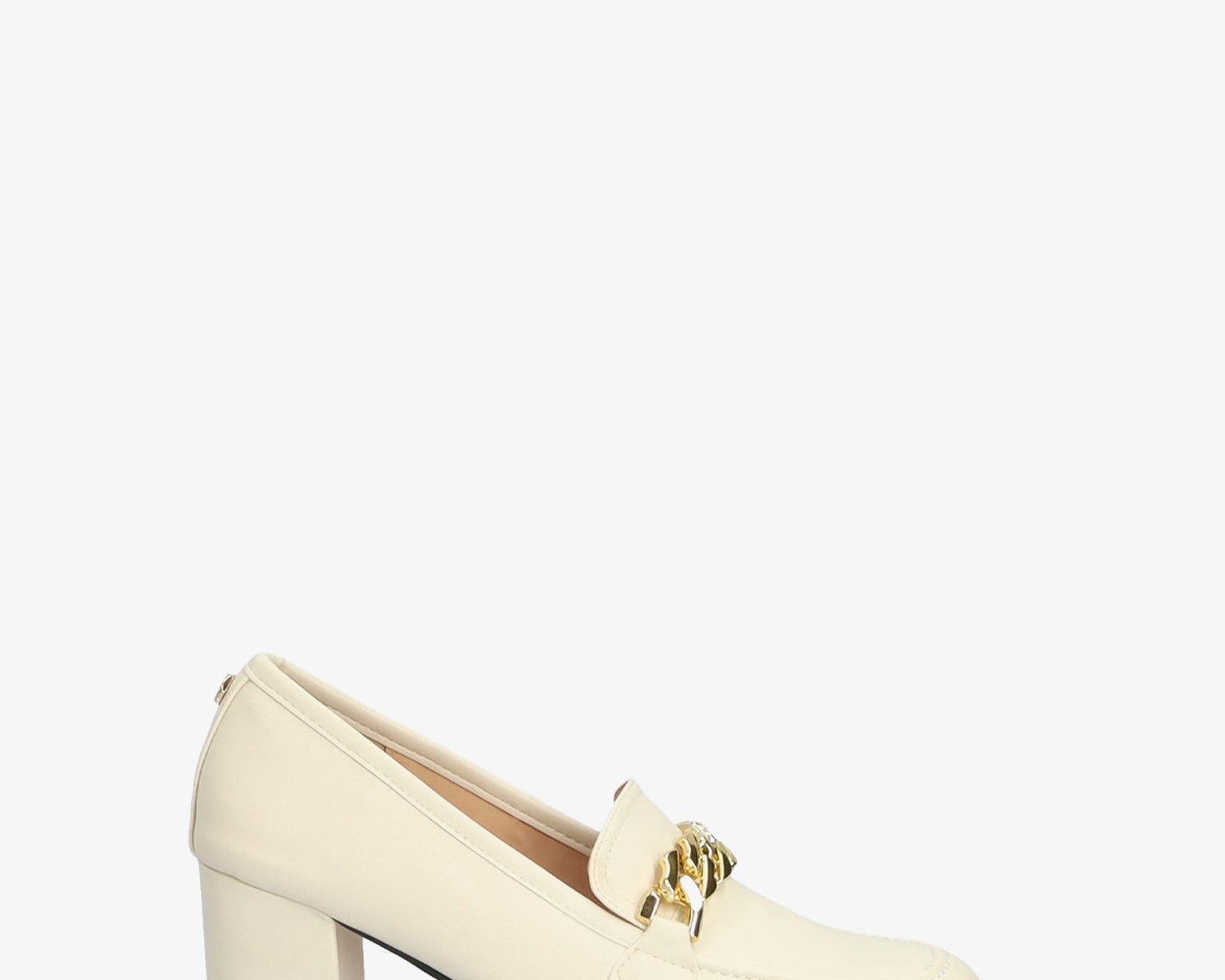 Heeled moccasins in white faux leather and gold chain link detail