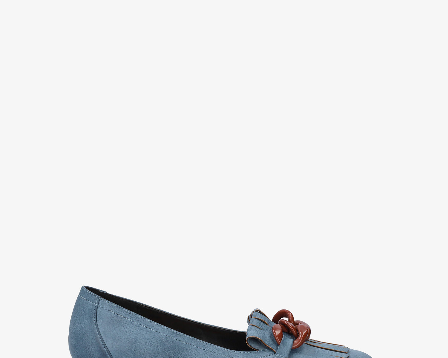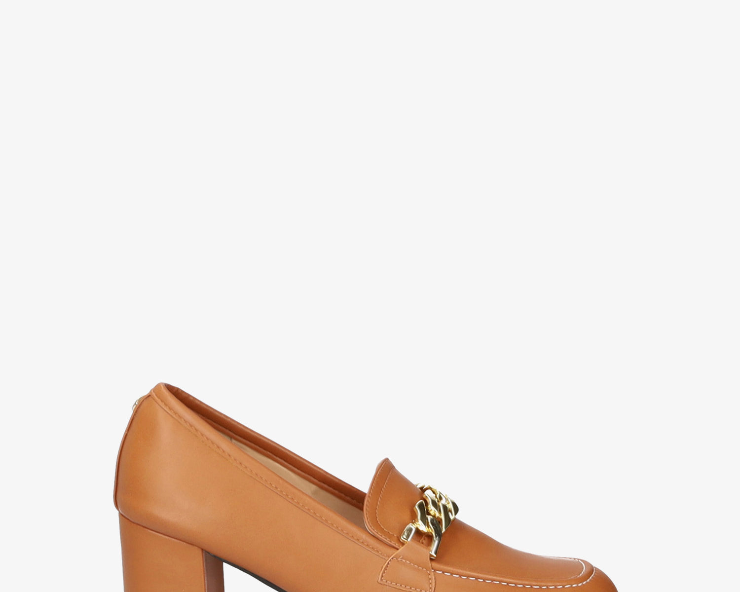 Heeled moccasins in camel colored faux leather and gold chain link detail