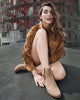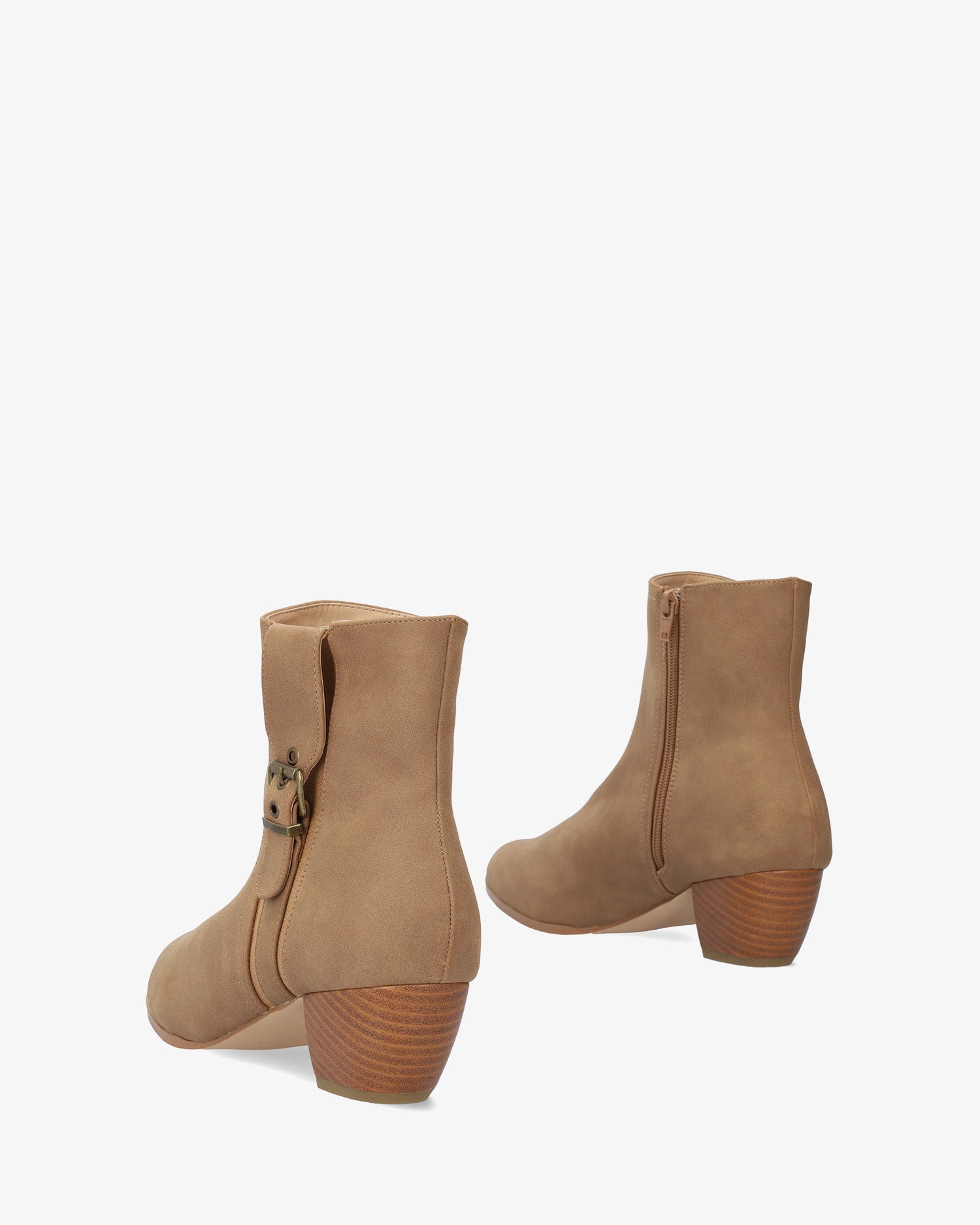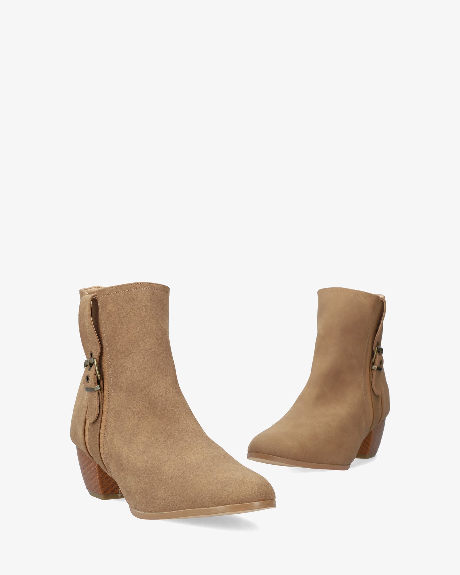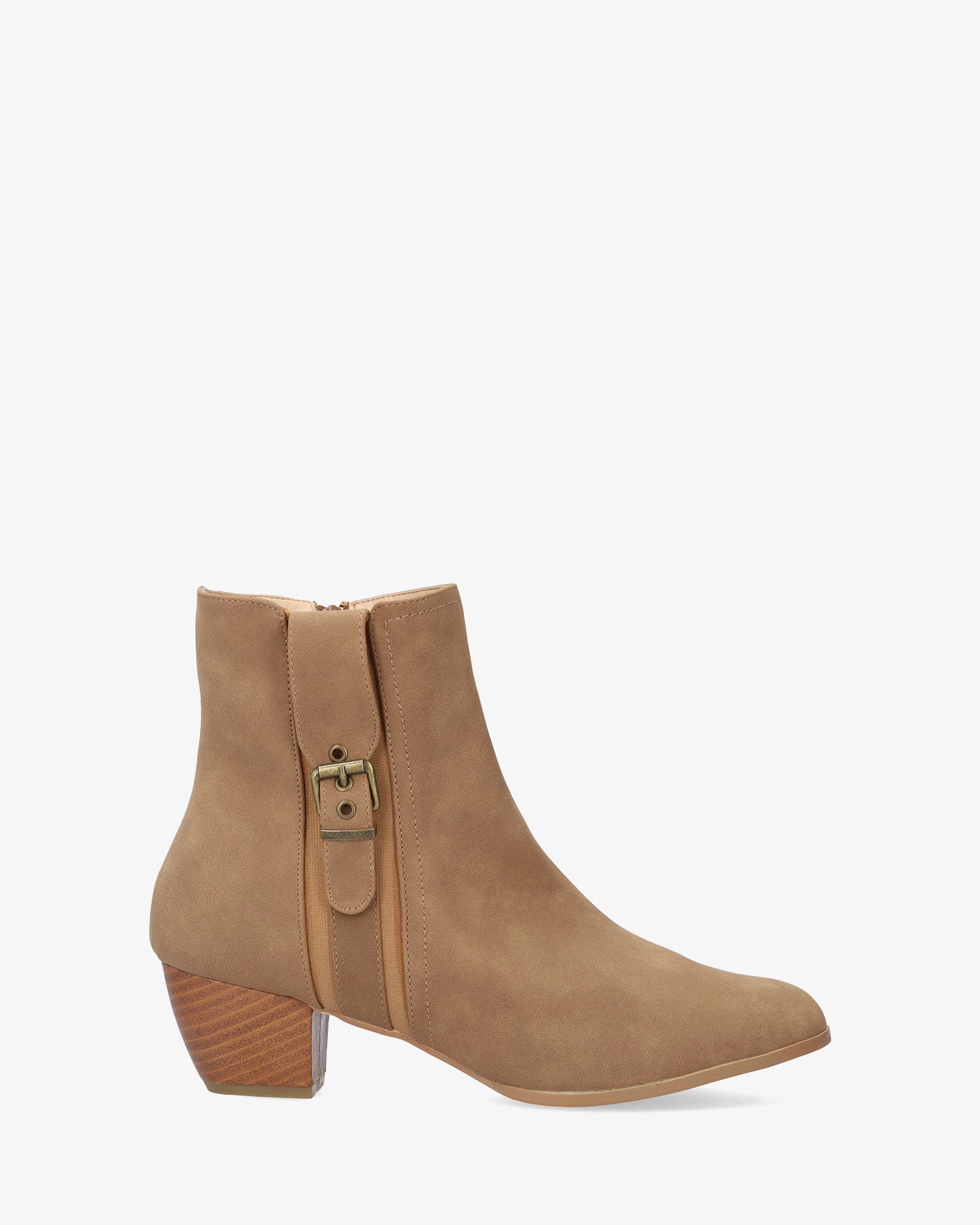 Ankle boots in faux brown nubuck. Detailed with a tone-on-tone elastic strap on the outer side with decorative buckle. Matching zipper on the internal side. Rounded tope. The laminated wooden effect heel is 5cm high for small sizes from 32 to 35 EU and 5,5cm high for large sizes from 42 to 45 EU.