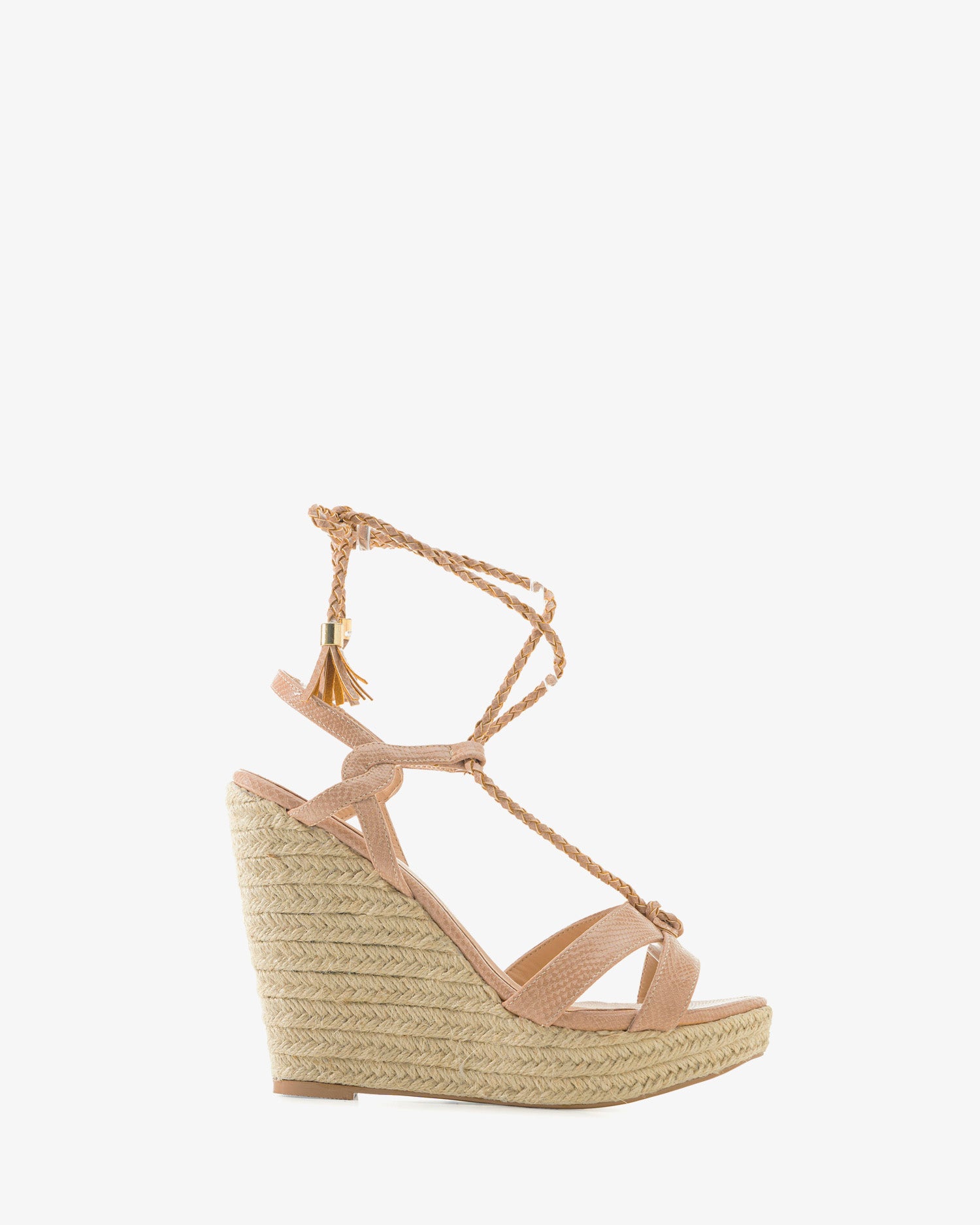 Wedges made of Nude engraved faux leather. The upper is formed by 2 bands linked at the centre . Ankle-tie braided straps with tassled ends. Jute wedge of 4.13" / 10.5 cm of height, and front platform of 0.98" / 2.5 cm for the small sizes UK 0.5 to 2.5 / EU 32 to 35. Jute wedge of 5.12" / 13 cm of height, and front platform of 1.18" / 3 cm for the large sizes from UK 8 to 10.5 / EU 42 to 45.