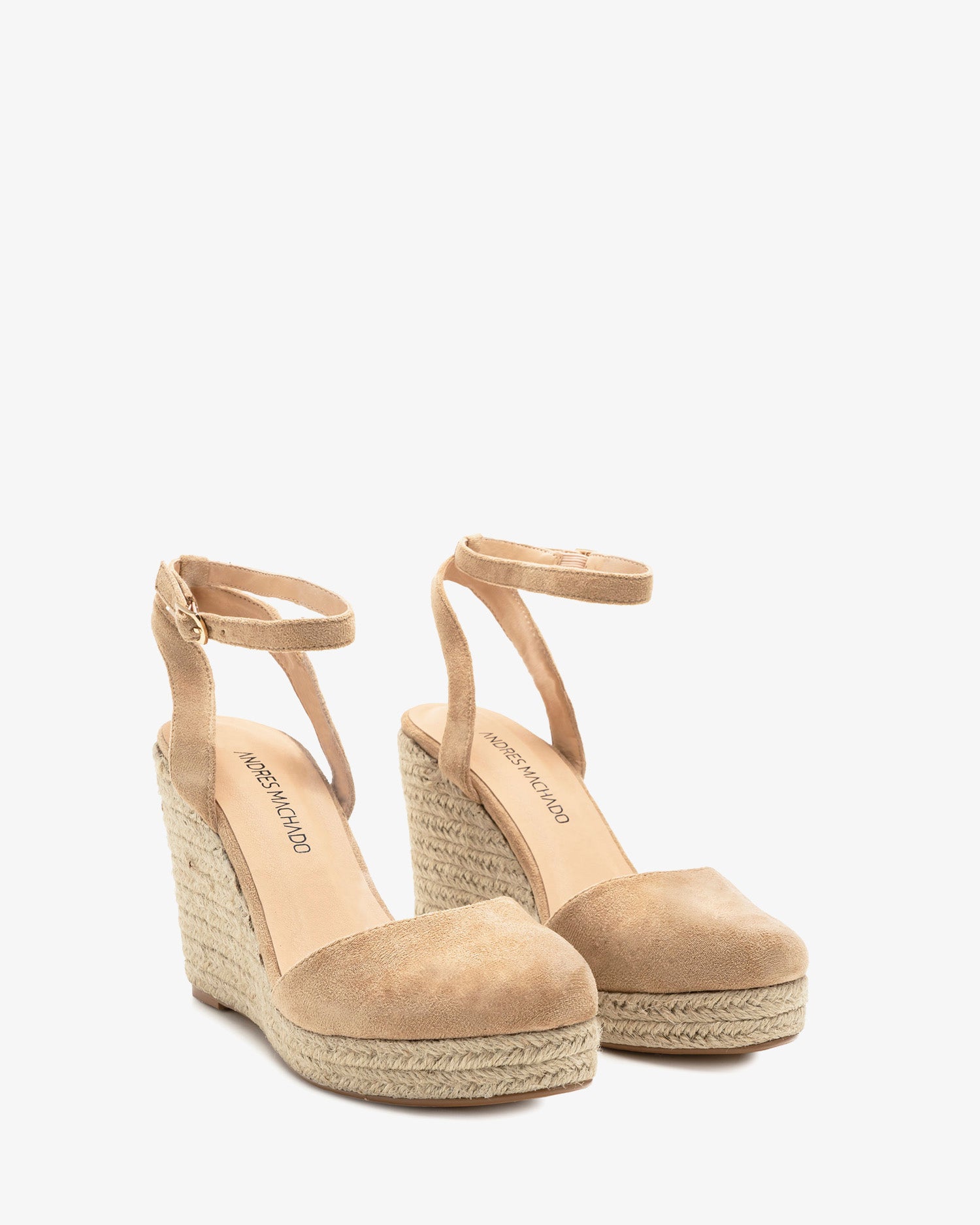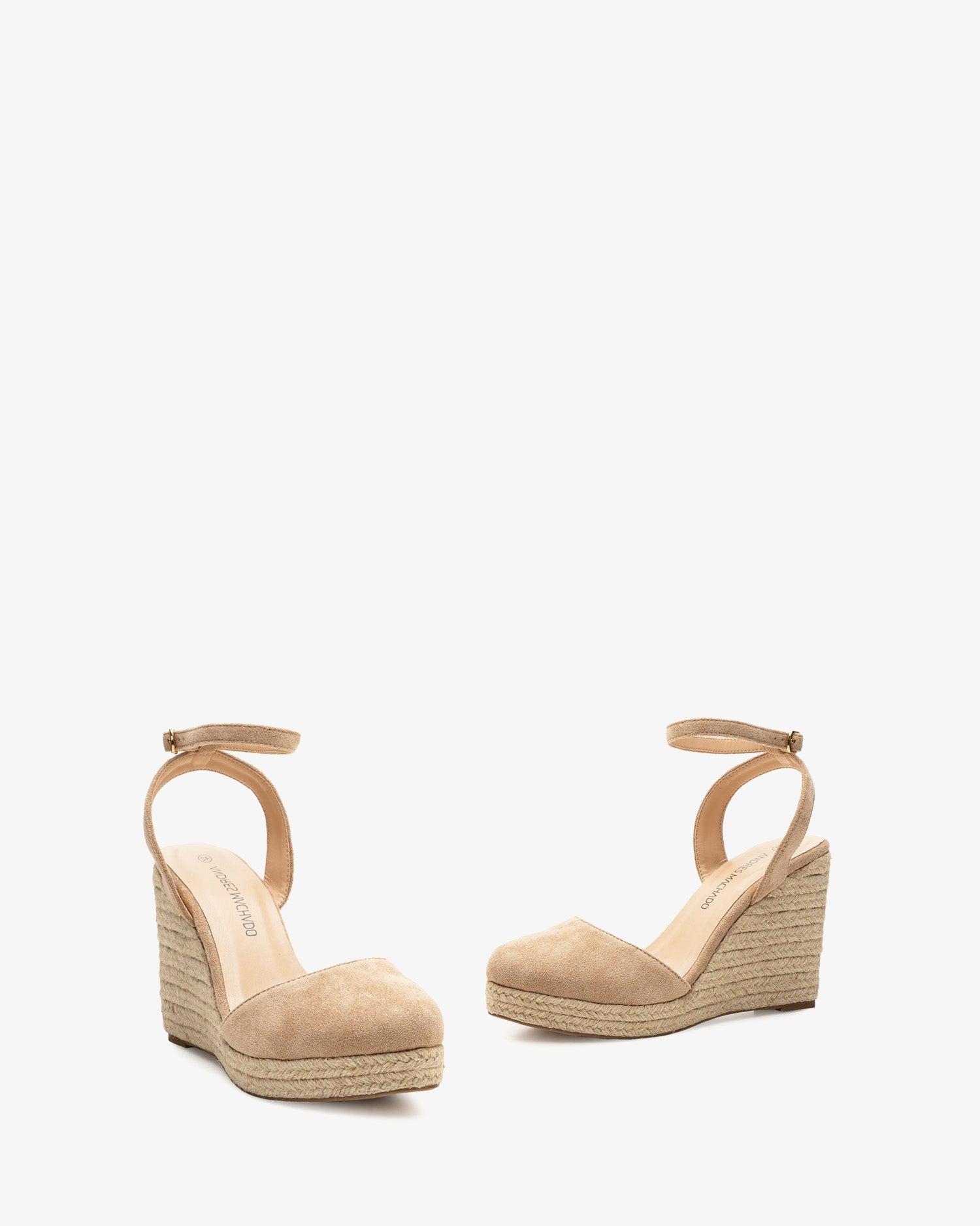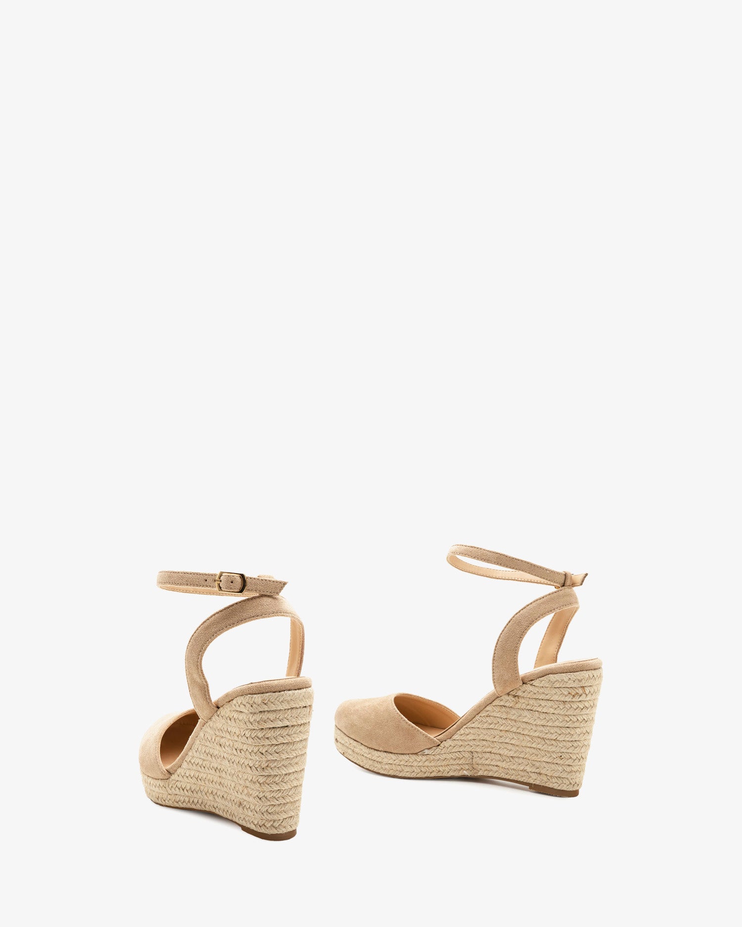 Beige faux suede espadrille with jute wedge. Slingback design, with a matching beige buckled strap around the ankle. Closed and round toe. Jute wedge and platform. The wedge is 10 cm / 3.93`` high and the platform is 2 cm / 0.78`` high for small sizes from 32 to 35 EU. The wedge is 11,5 cm / 4.52`` high and the platform is 2 cm / 0.78`` high for large sizes from 42 to 45 EU.