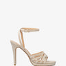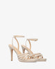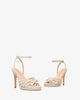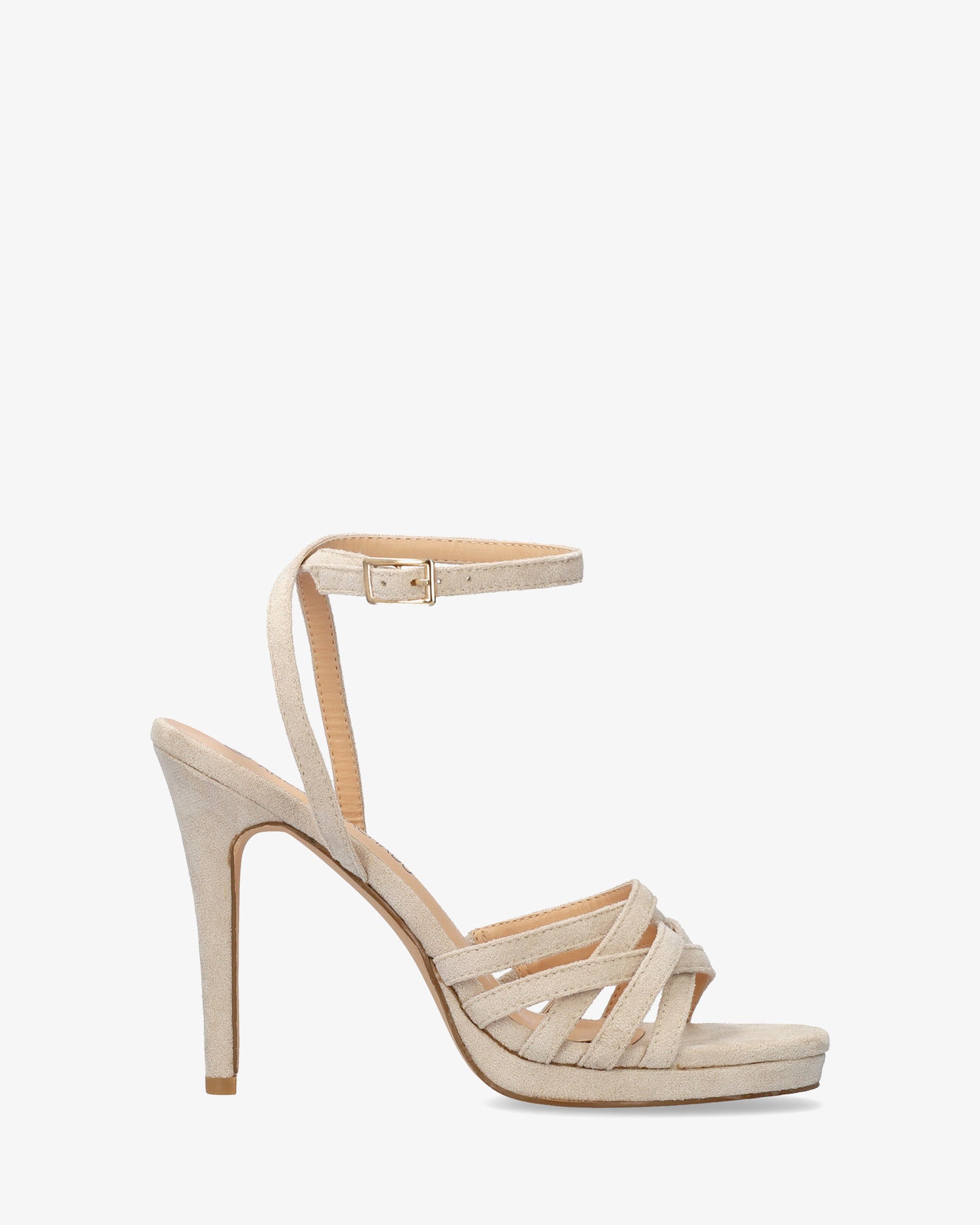 Beige suede-like color high-heeled sandals with a small platform. Open-toe design with thin straps intertwined in the front. Metallic buckle closure ankle strap. Heel height of 3,93" and platform height of 0,59" for small sizes from 32 to 35. Heel height of 4,92" and platform height of 0,78" for large sizes from 42 to 45.