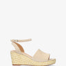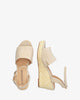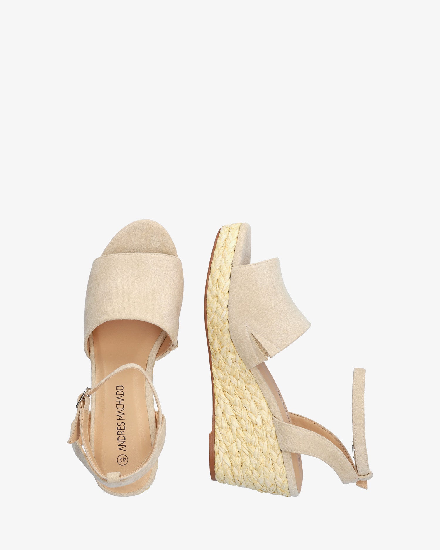 Beige faux suede sandals with a wedge. Open-back design with a wide strap matching the instep. Closure with a metal buckle fastened around the ankle. Open toe. Wedges and front platform made of jute. Wedge measures 2,95", and the platform measures 0,98" for small sizes from 32 to 35. Wedge measures 3,54", and the platform measures 1,18" for large sizes from 42 to 45. This model may vary from the standard, we recommend you check the cms of the insole.