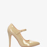 Heeled Mary Jane in beige coloured patent soft faux leather. The design features a strap over the vamp with a metallic buckle that finishes in a pointed toe. The tone on tone lined heel measures 3,74 inch for small sizes 32-35 and 4,33 inch for large sizes 42-45.