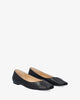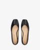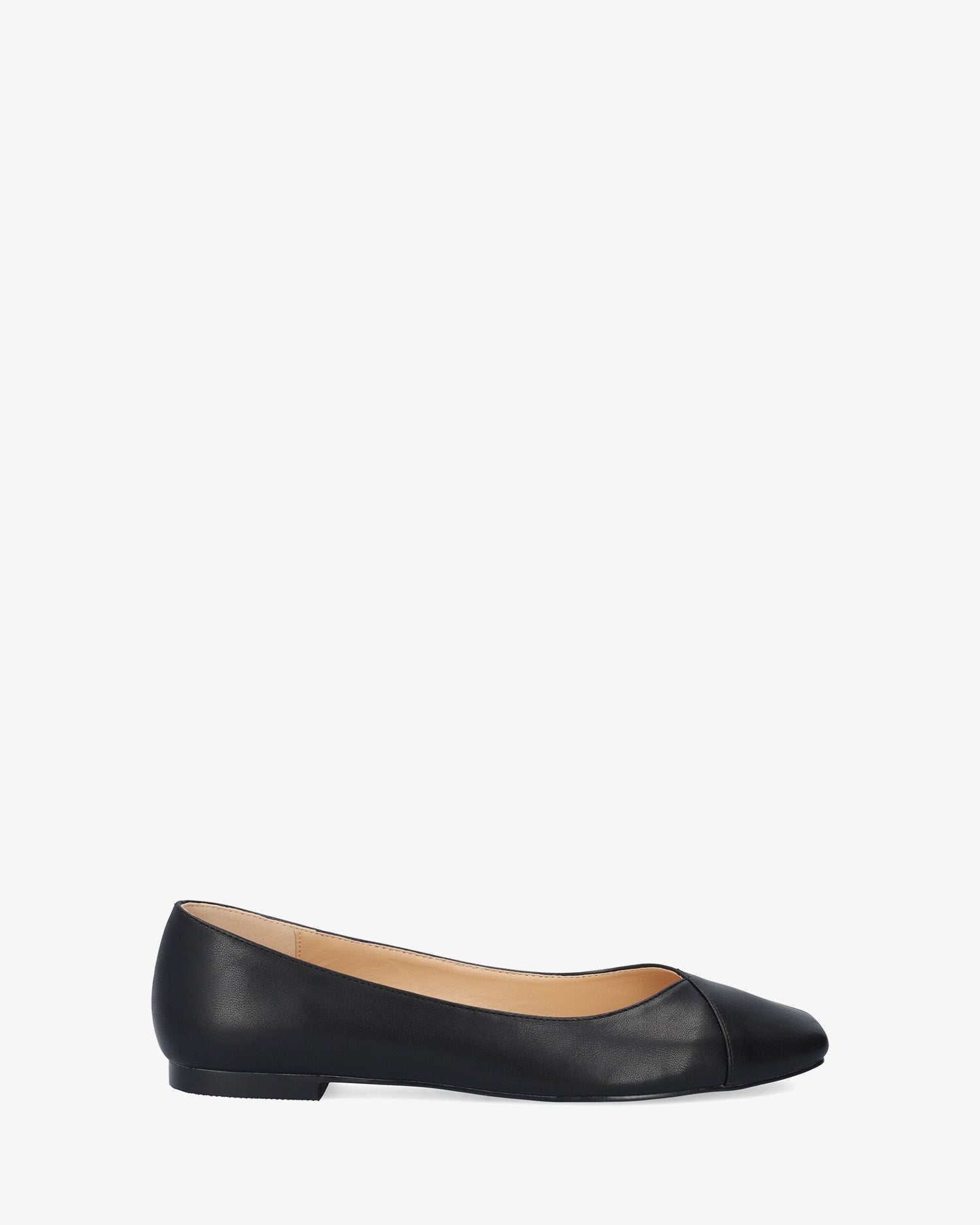 Black faux leather ballerina finished in a squared toe with decorative crossed matching straps. Tone-on-tone stitching over the toe. Mini-block heel for large sizes from 42 to 45 EU. This model fits small, we recommend taking one size larger than usual.