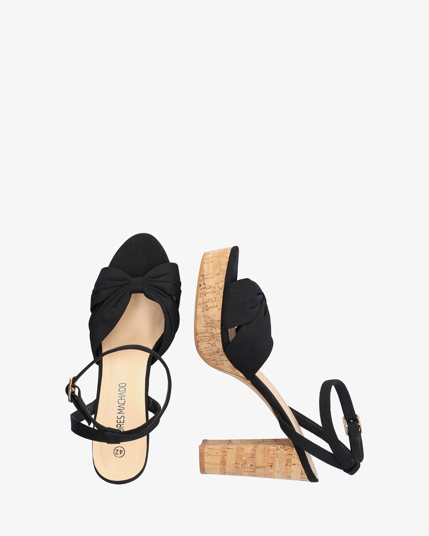 Black fabric sandals with cork-effect heel. Wide fabric strap design with a matching bow on the front. Metal buckle closure with an ankle strap. Open heel and toe. Cork-effect heel and front platform. Heel measures 4,33", and the platform measures 1,18" for small sizes from 32 to 35. Heel measures 4,92", and the platform measures 1,18" for large sizes from 42 to 45.