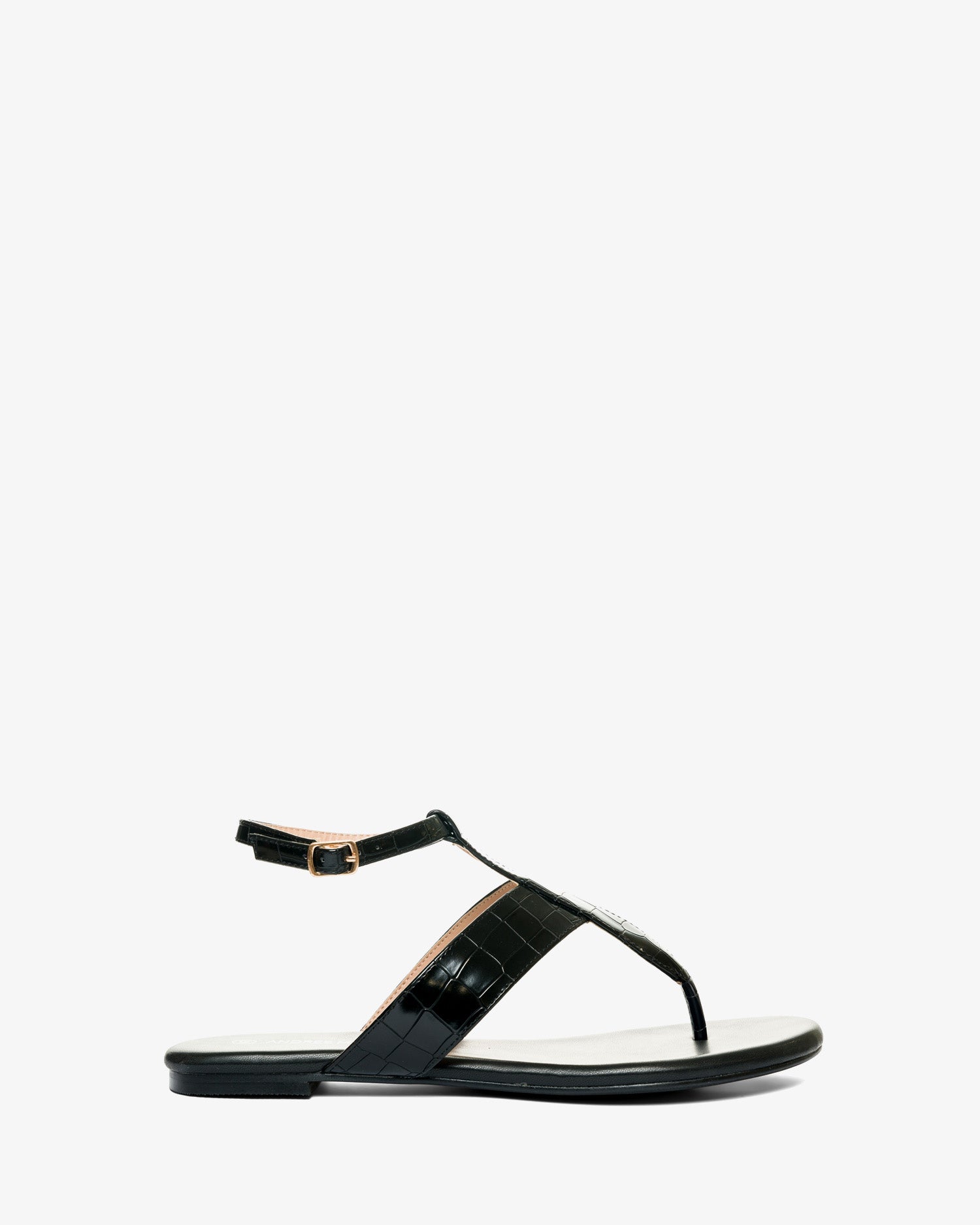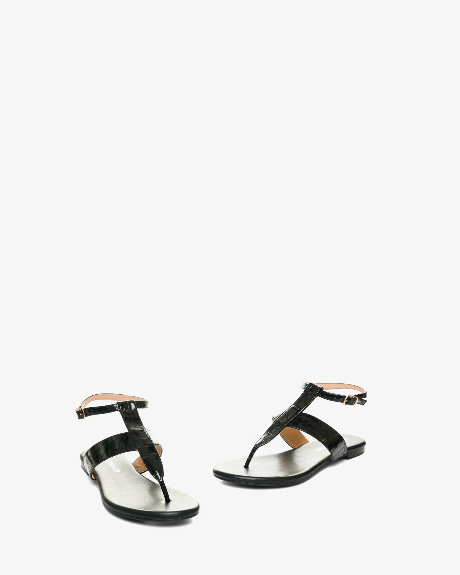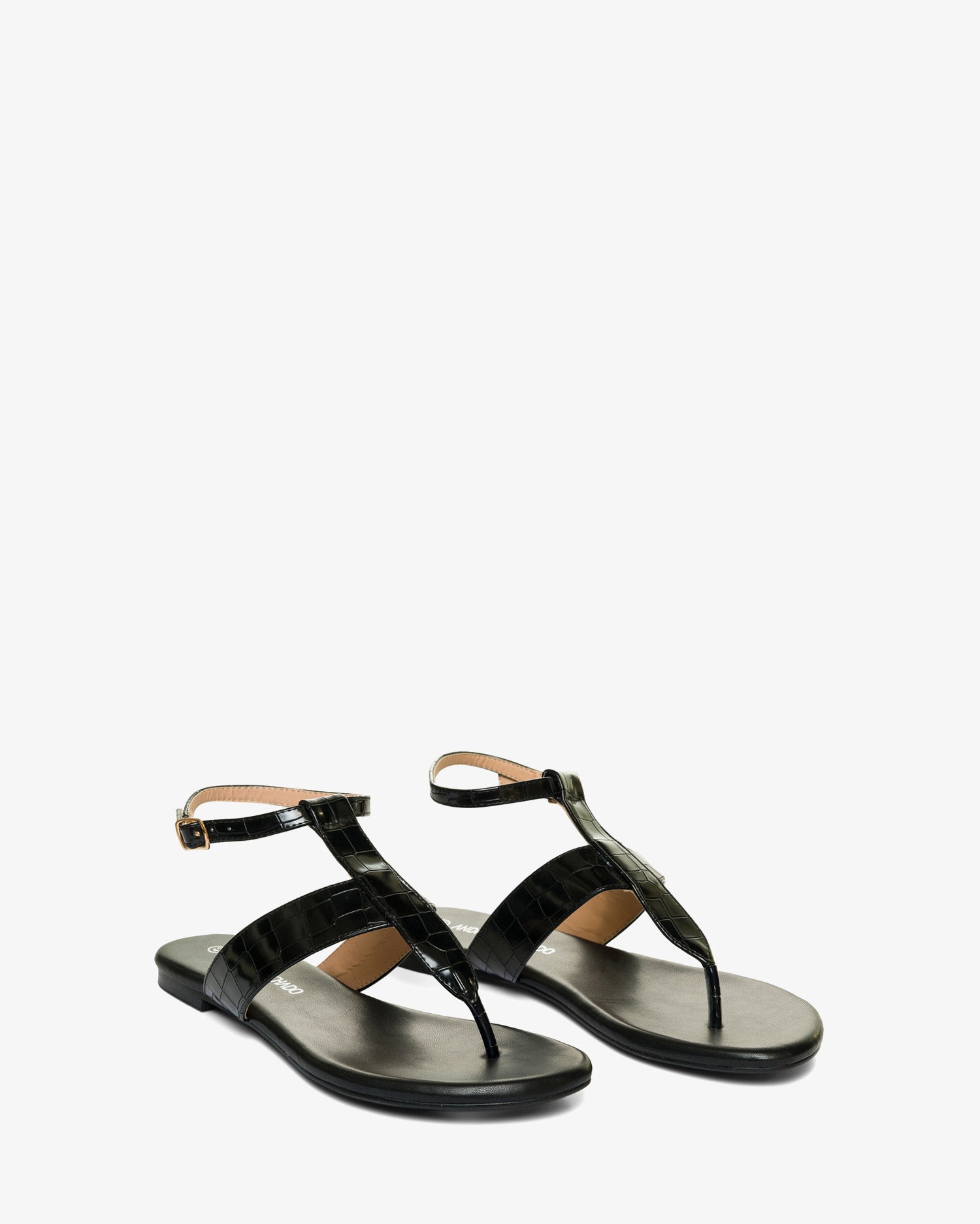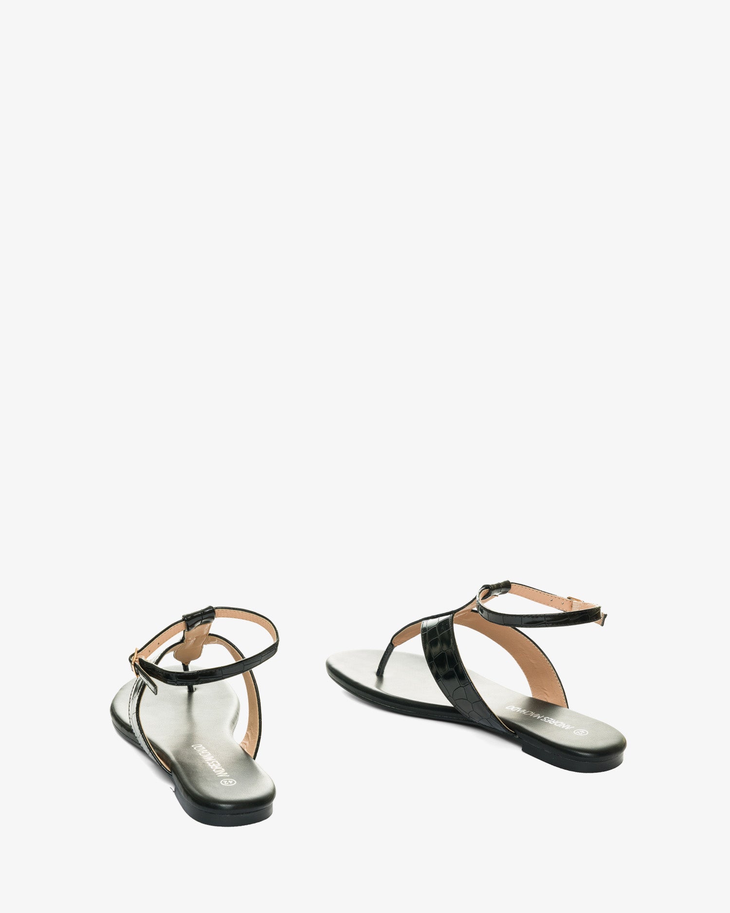 Black faux leather flat sandals. Wide last. Slingback, roman style featuring a toe strap and wide, matching strap over the instep. Matching buckled strap closure around the ankle. Cushioned insole. Round and open toe box. Available in large sizes from 42 to 45 EU.