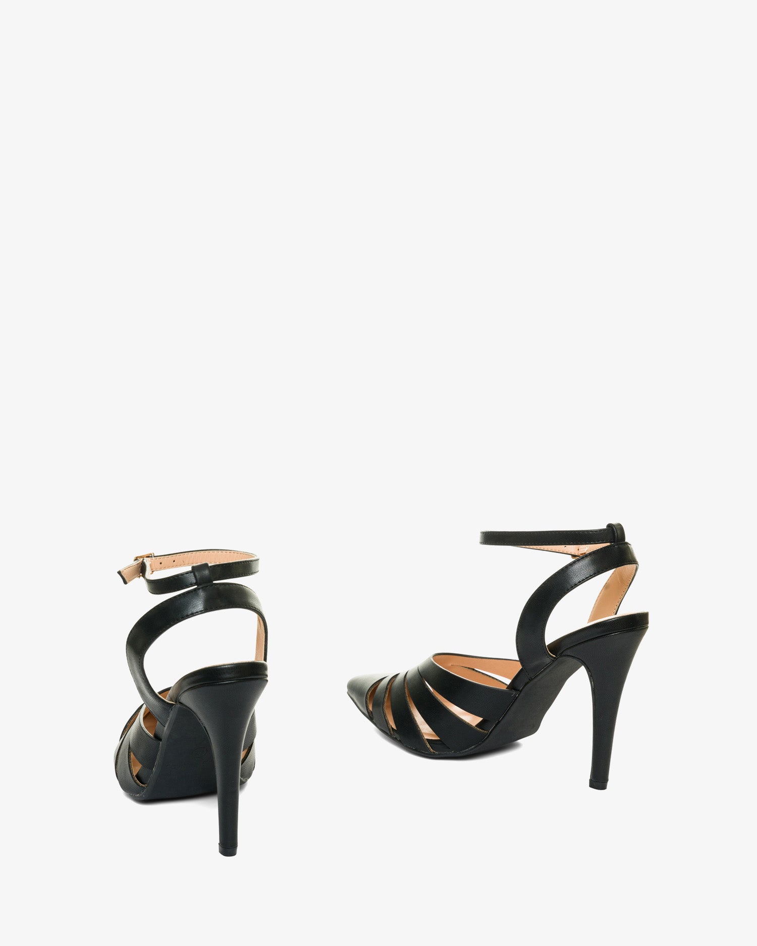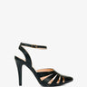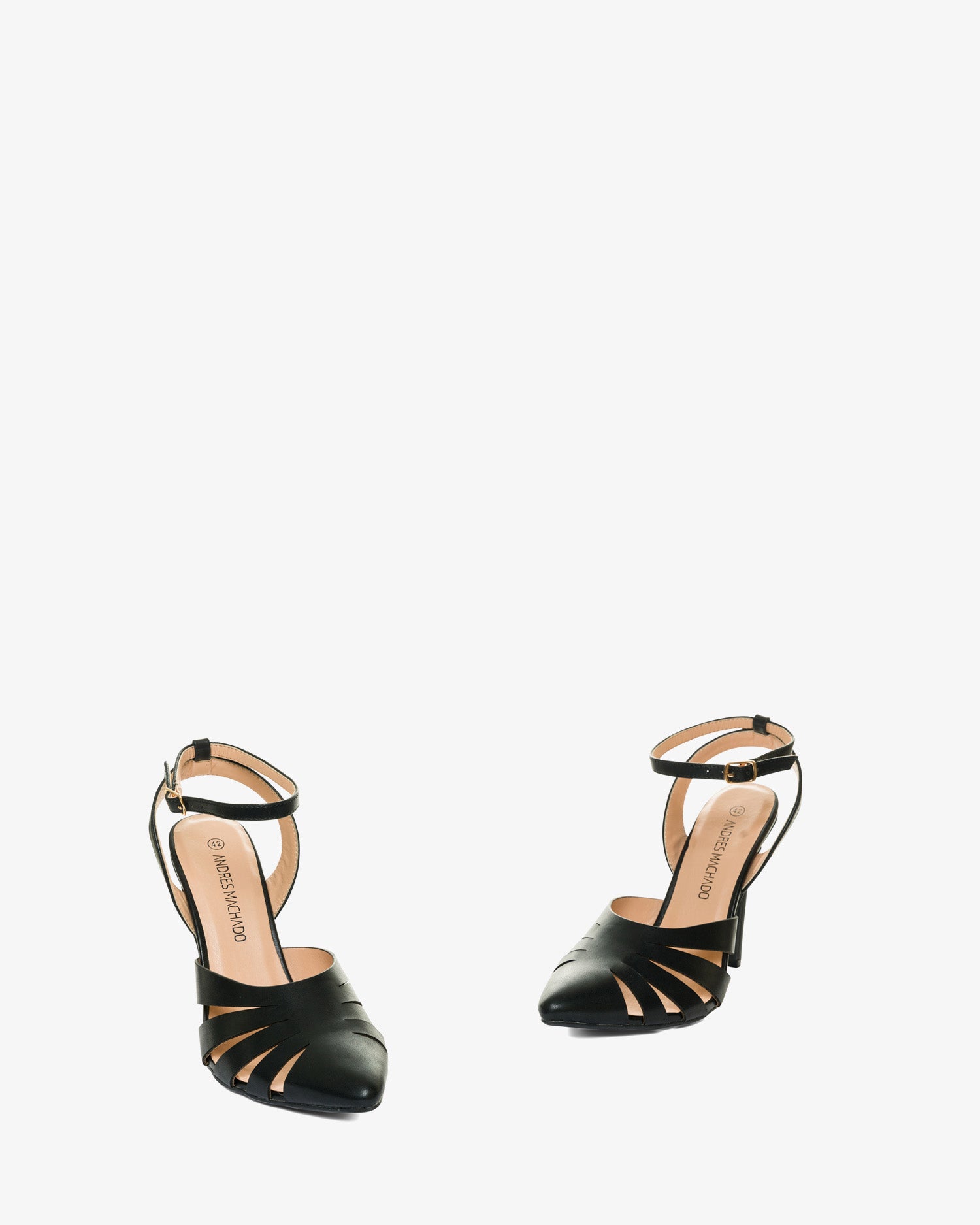 Black faux leather heeled court shoes finished in a pointed toe. Slingback design and buckled strap closure. The thin, matching heel is 3,94`` for small sizes from 32 to 35 EU. The thin, matching heel is 4,72`` for small sizes from 42 to 45 EU.