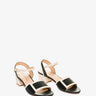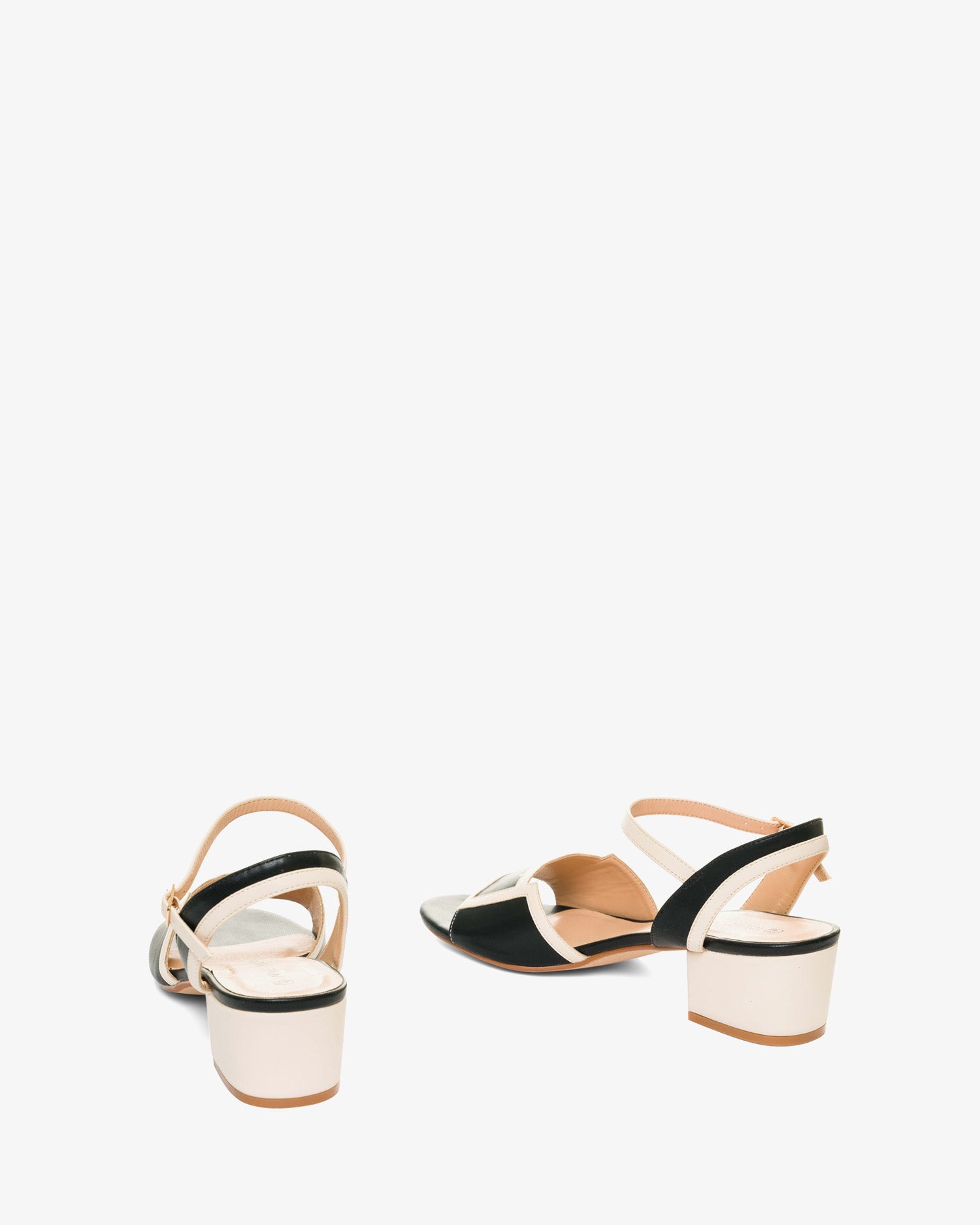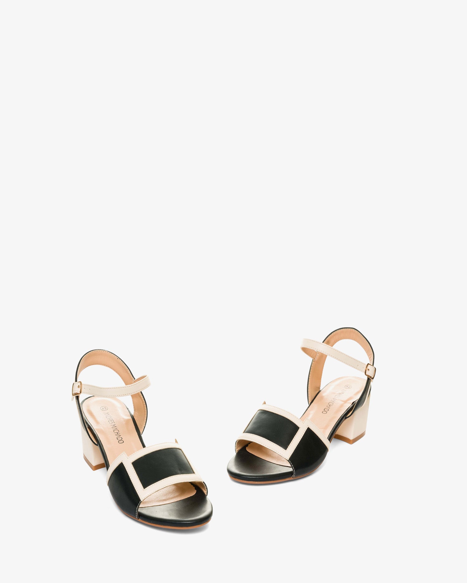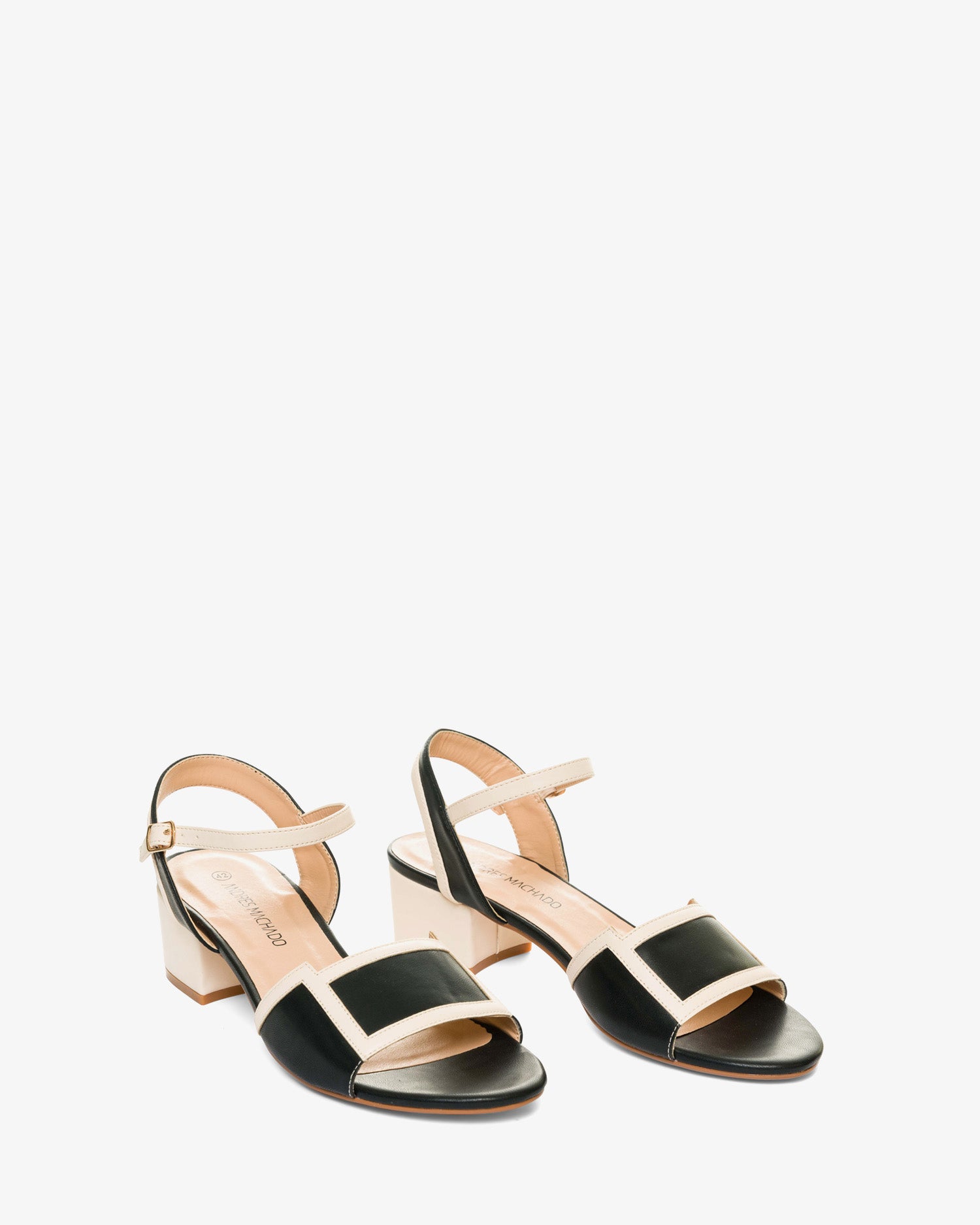 Black faux leather sandals with wide heel. Slingback design featuring a wide, contrasting strap over the vamp. Buckled strap closure around the ankle. Round and open toe box. The matching heel is 1,97`` for small sizes from 32 to 35 EU. The matching heel is 2,16`` for small sizes from 42 to 45 EU.