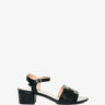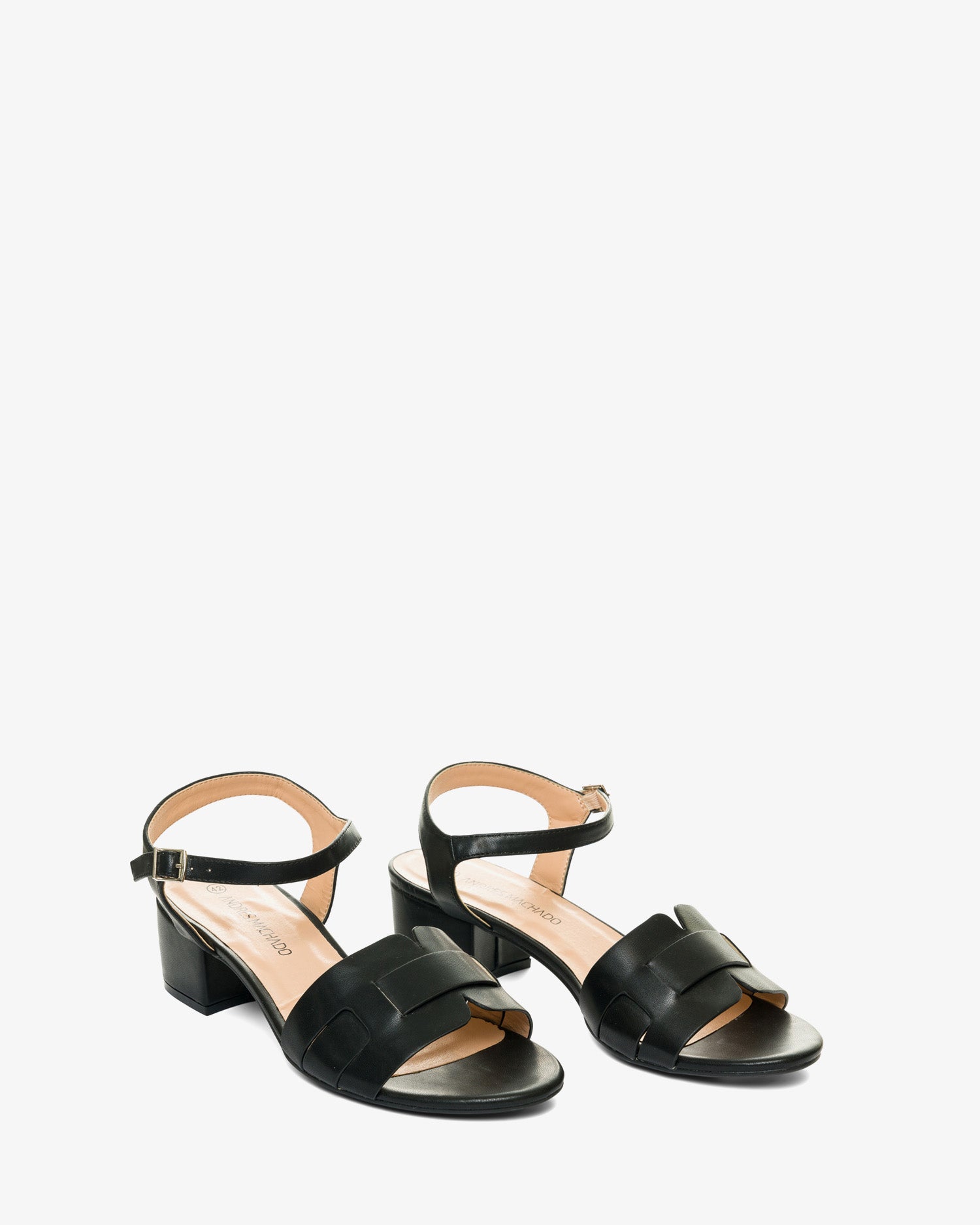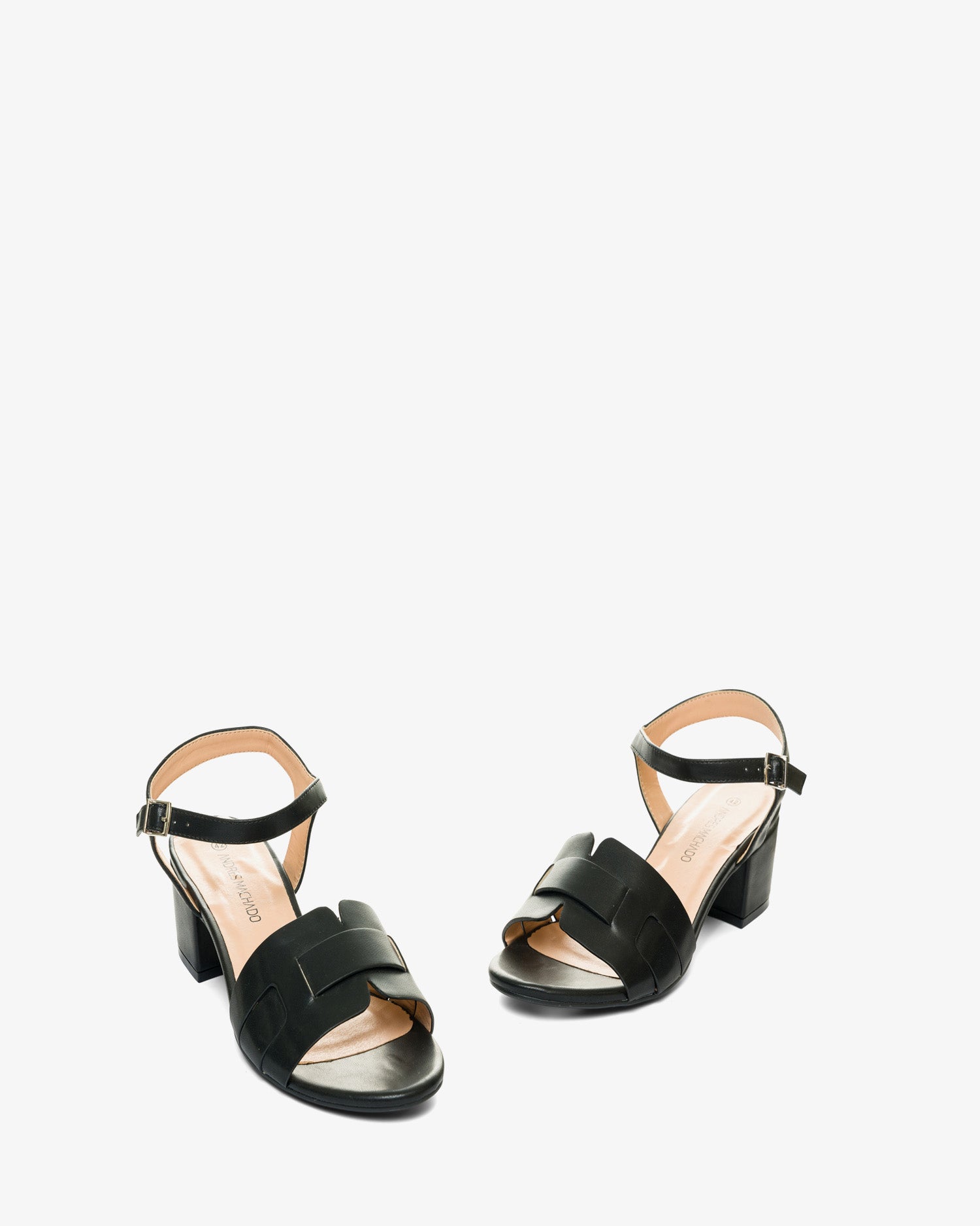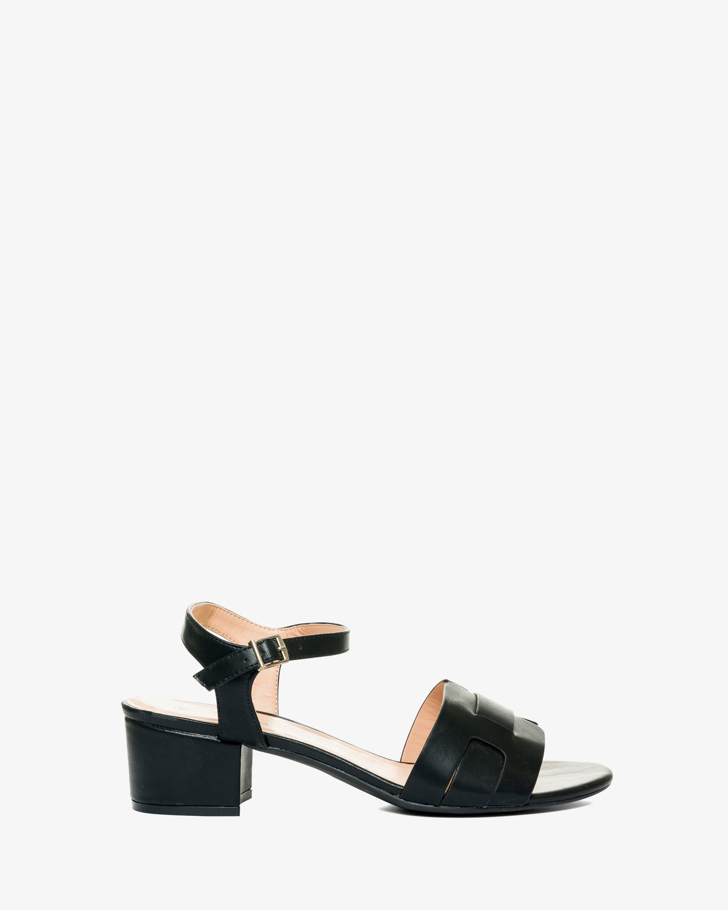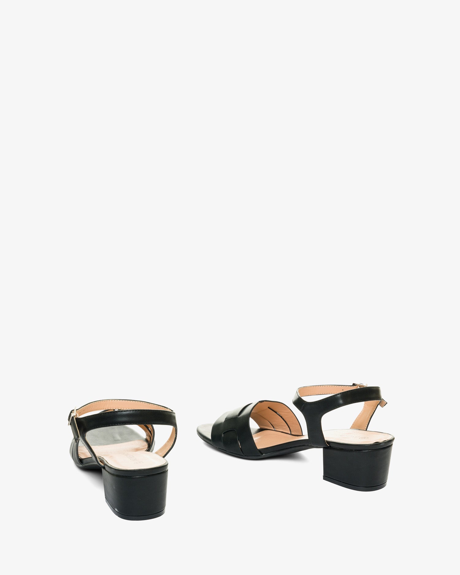 Black faux leather sandals with wide heel. Slingback design featuring matching wide and thin straps intertwined over the vamp. Buckled strap closure around the ankle. Round and open toe box. The matching heel is 1,97`` for small sizes from 32 to 35 EU. The matching heel is 2,16`` for small sizes from 42 to 45 EU.