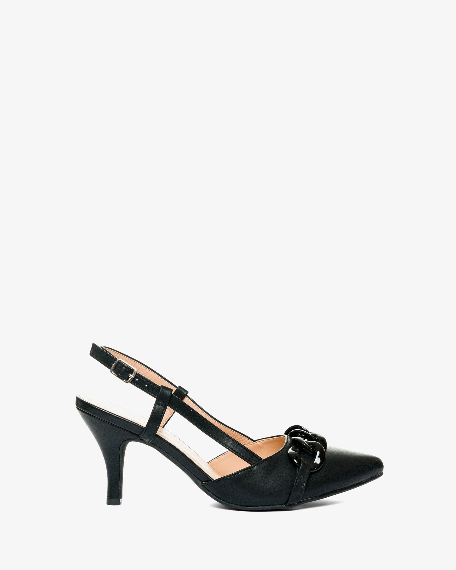 Black faux leather mid heel court shoes. Finished in a pointed toe and chain link detail over the vamp. Slingback design featuring side straps with buckle closure. The thin, matching heel is 2,75`` for small sizes from 32 to 35 EU. The thin, matching heel is 3,54`` for small sizes from 42 to 45 EU.